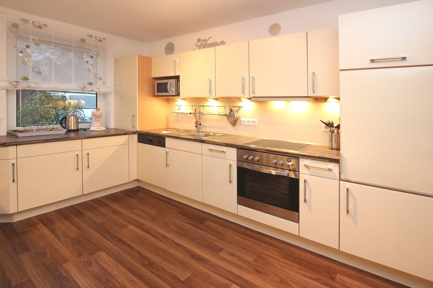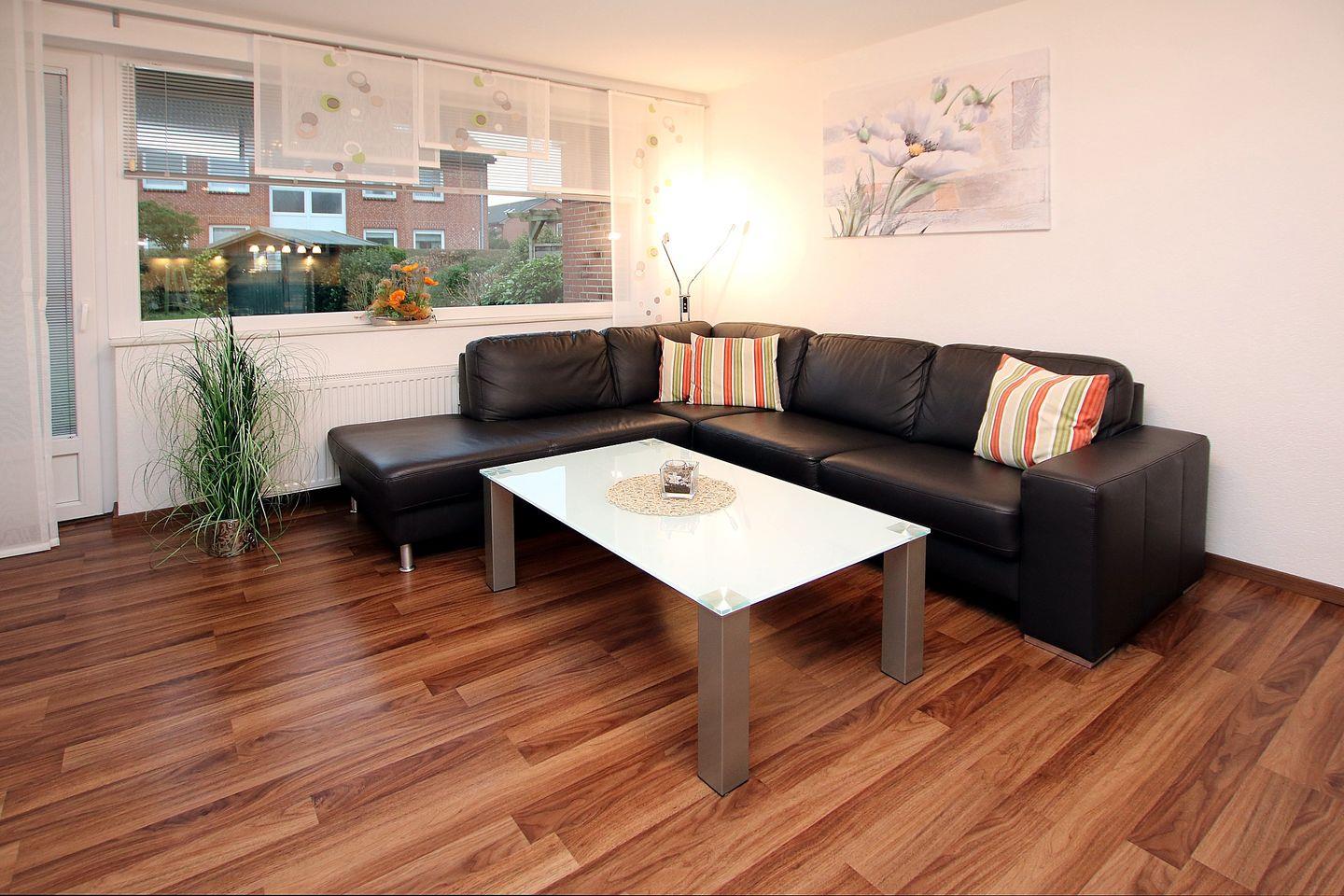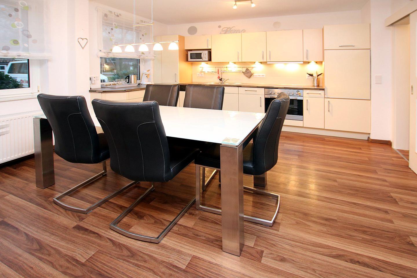 - Wohnzimmer mit Leder- Ecksofa, Esstisch für 5 Personen, Küchenzeile mit allem Komfort