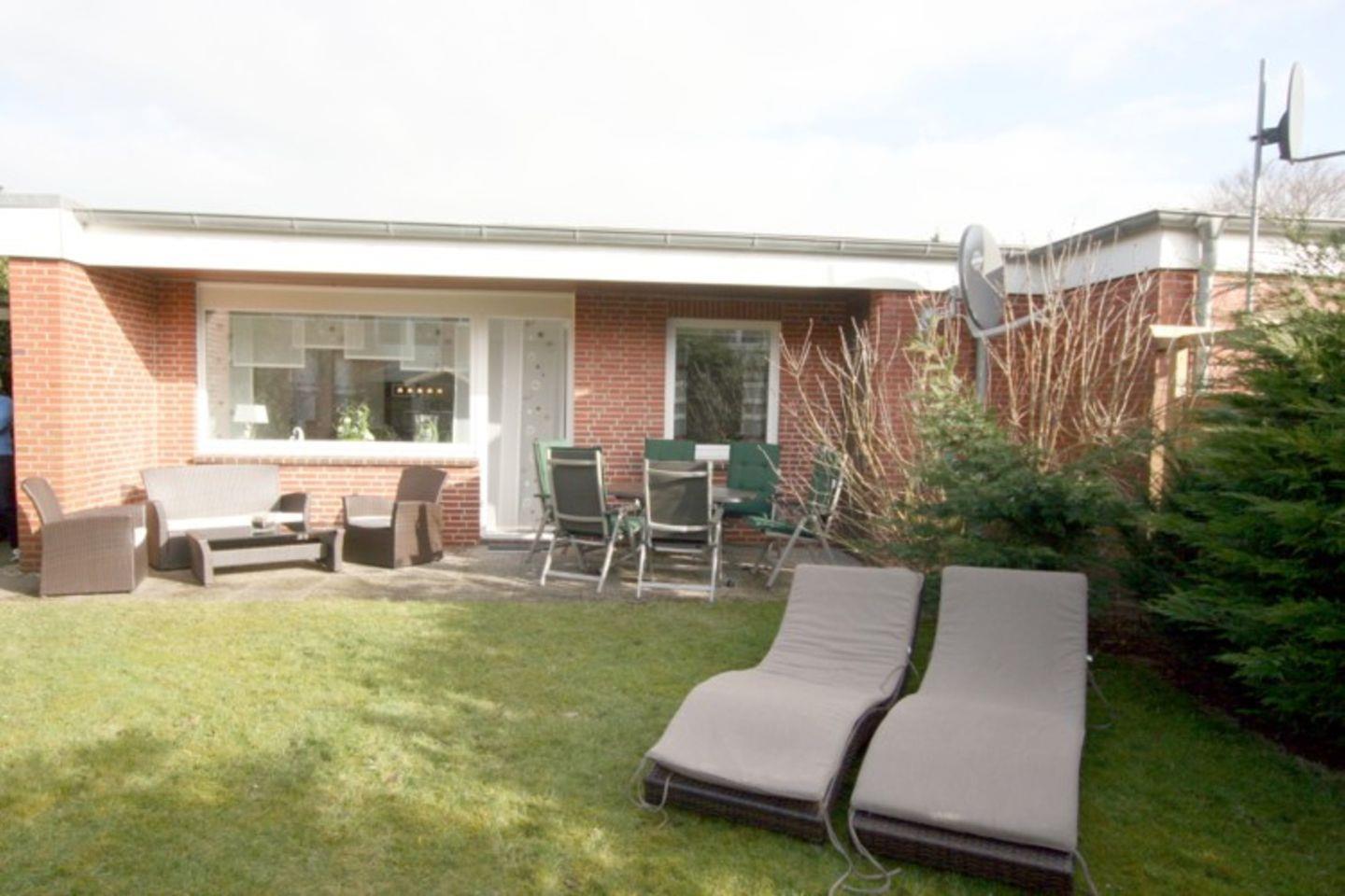 Ferienhaus in Wyk auf Föhr, Hasenkamp 1, Reihenhausbungalow. 4-Zimmer-Nichtraucherhaus (ca. 75 qm) im Erdgeschoss mit Südterrasse und eigenem Garten. WOHNZIMMER: Leder-Ecksofa mit Couchtisch, großer Eßtisch mit 5 Stühlen. Küchenzeile mit Allem Komfort. SCHLAFZIMMER 1: Doppelbett 1,80m x 2m, Kleiderschrank.