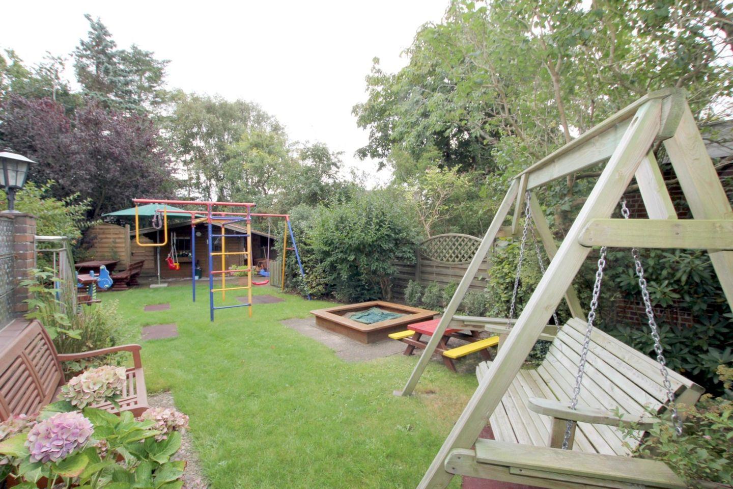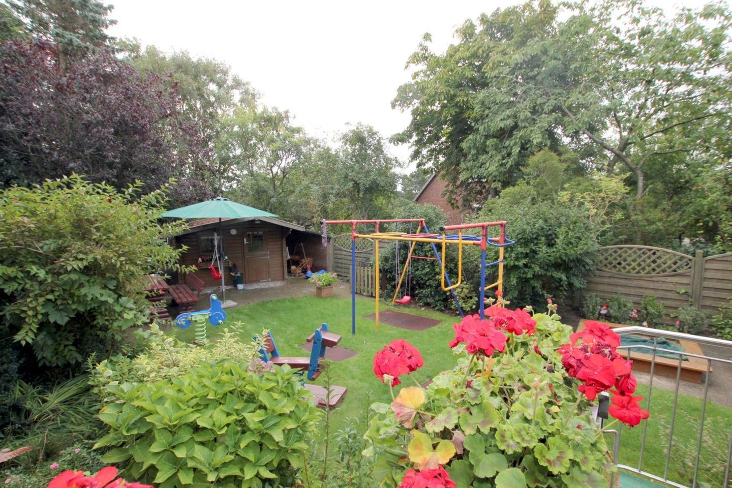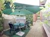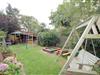 - Garten mit Möbeln, Sonnenschirm und Grill, Strandkorb im Gemeinschaftsgarten
