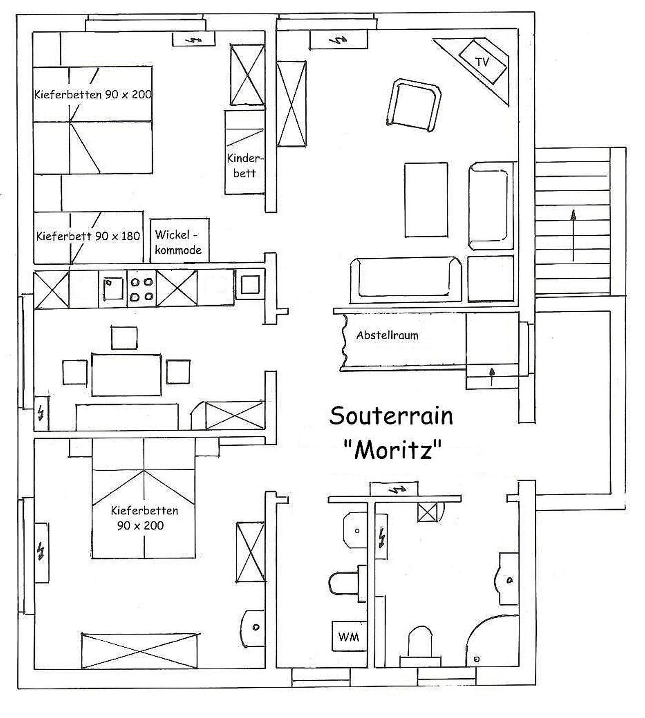 Gemütliche 3-Zimmerwohnung im Souterrain mit eigener, kleiner Sitzecke mit Strandkorb und gemeinschaftlichem Garten. WOHNZIMMER mit 2 Ledersofas und 1 Sessel, Flat-TV. FLUR: mit Garderobe und Abstellraum. KÜCHE: mit Geschirrspüler, Elektroherd m. Backofen, Kühlschrank mit Gefrierfach, Mikrowelle, Toaster, Kaffeemaschine, Wasserkocher. BAD 1: Duschbad / WC. BAD 2: WC und Waschmaschine. SCHLAFZIMMER 1: mit Doppelbett (1,80 x 2 m), Kleiderschrank und extra Waschbecken. SCHLAFZIMMER 2: mit Doppelbett (1,80 x 2 m), Einzelbett, Holzkinderbett und Wickelkommode.