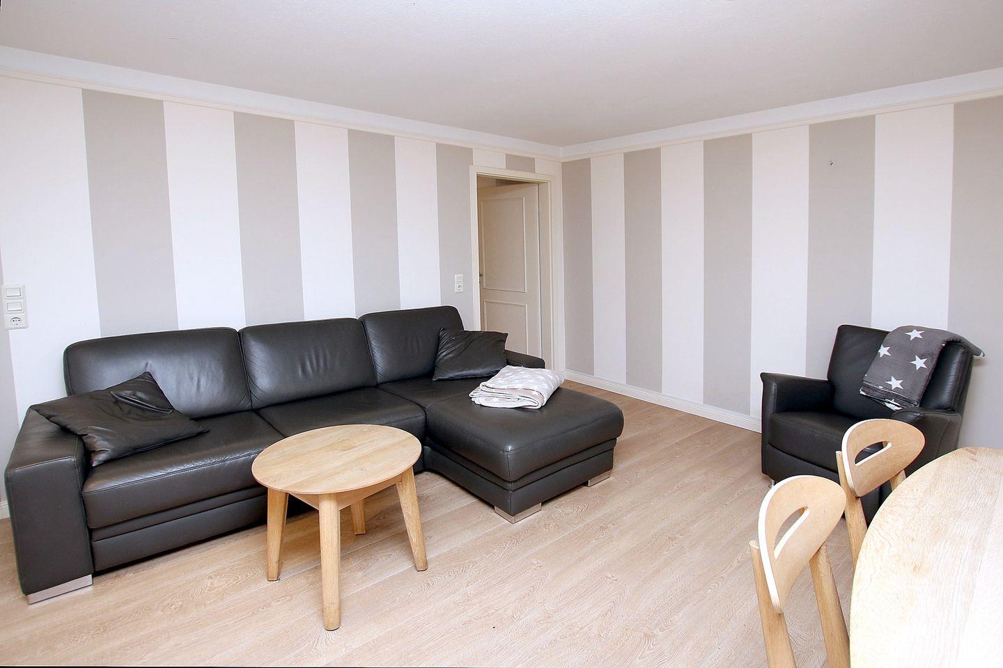 - Wohnzimmer mit 2er Couch, Sessel, Küchenzeile und Esstisch mit 4 Stühlen