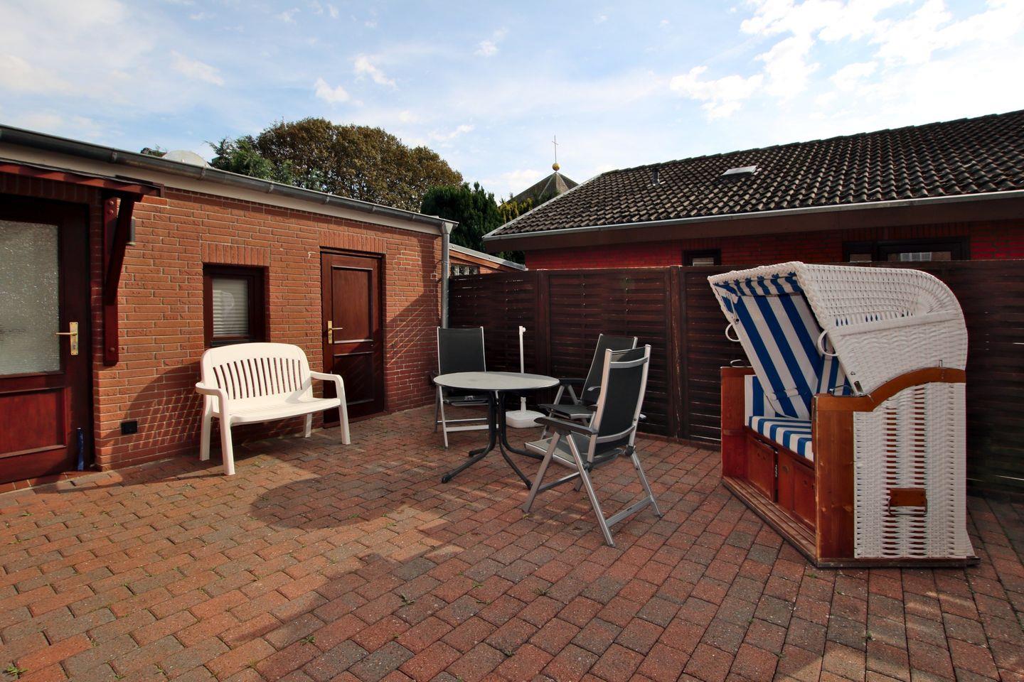 Hinter dem Wohnzimmer geht es auch auf die Südterrasse, die mit einer Markise und Gartenmöbeln ausgestattet ist. Im Anbau befindet sich auch das Bad 1 mit Dusche/WC und Toplader Waschmaschine. Der Trockner befindet sich im anderen Teil vom Anbau (von außen zugänglich) Ein zugehöriger PKW-Stellplatz befindet sich rechts neben dem Haus.
