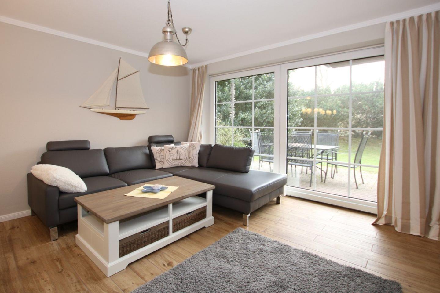 - Wohnzimmer mit Ledercouch über Eck, Esstisch mit Eckbank, Zugang zur Terrasse