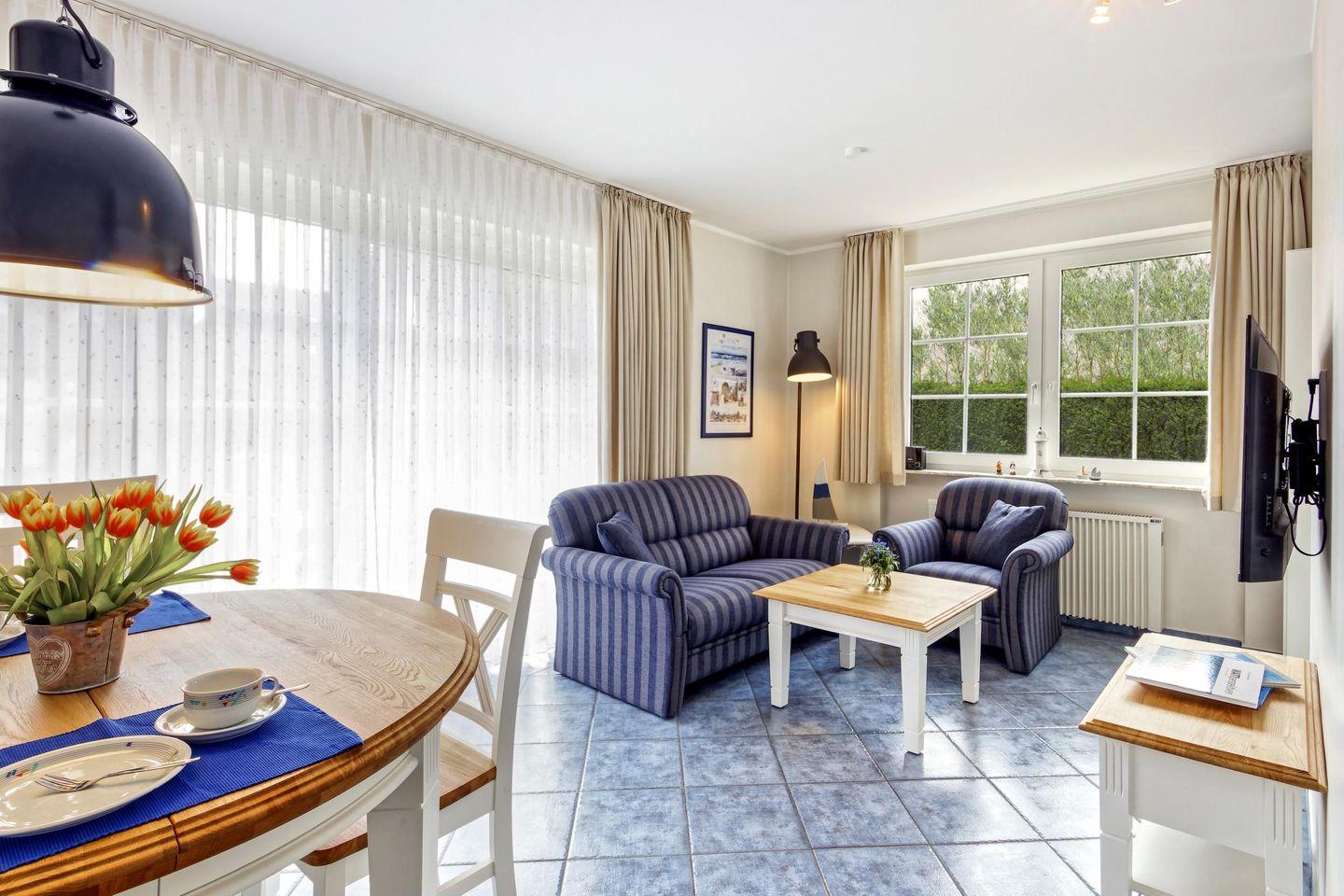 Ferienwohnung in Wyk - Südstrand auf Föhr, Am Leuchtturm 7, Whg Nr. 2, ca. 48 qm, 3-Zimmer-Nichtraucherwohnung im Erdgeschoß mit Südterrasse und eigenem Eingang. WOHNZIMMER mit Couch, Sessel und Couchtisch, Esstisch mit 3 Stühlen und Sitzbank. Küchenzeile mit Spülmaschine, Backofen mit integrierter Mikrowelle und ein Waschtrockner. Bad mit Dusche/WC