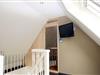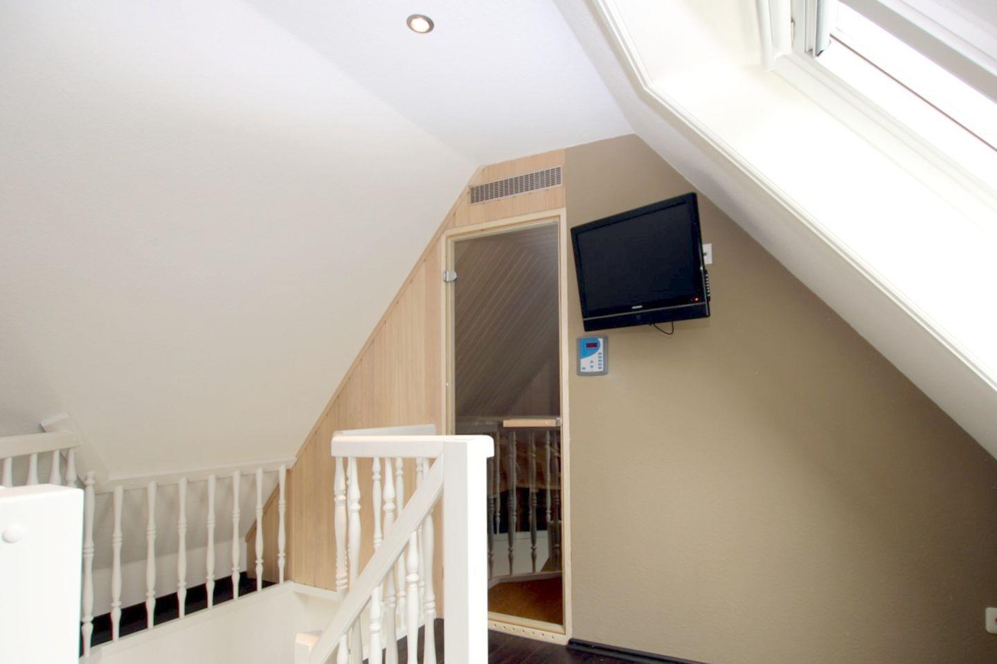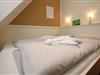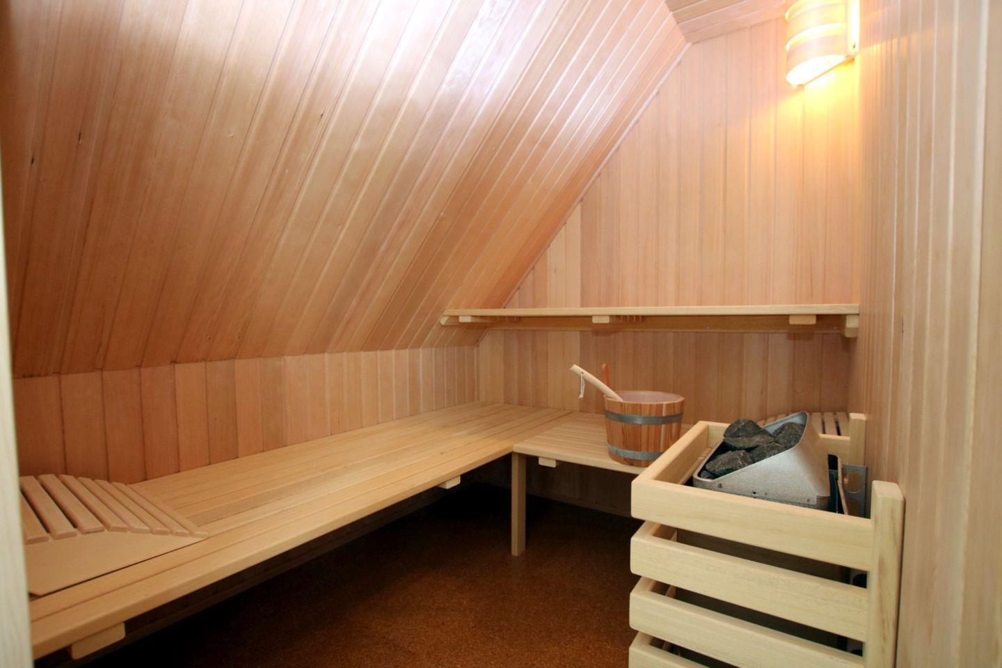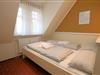 Das Schlafzimmer ist mit einem Doppelbett (160cm x 200cm) und einem Kleiderschrank ausgestattet. Vom Flur aus erreichen Sie das Badezimmer. Dieses ist mit einer Dusche, einer Handtuchhalterheizung sowie einem WC ausgestattet. Außerdem ist ein moderner Fön vorhanden. Ebenfalls vom Flur geht es über eine Treppe in das Dachgeschoß. Hier befindet sich die Finnische Sauna.