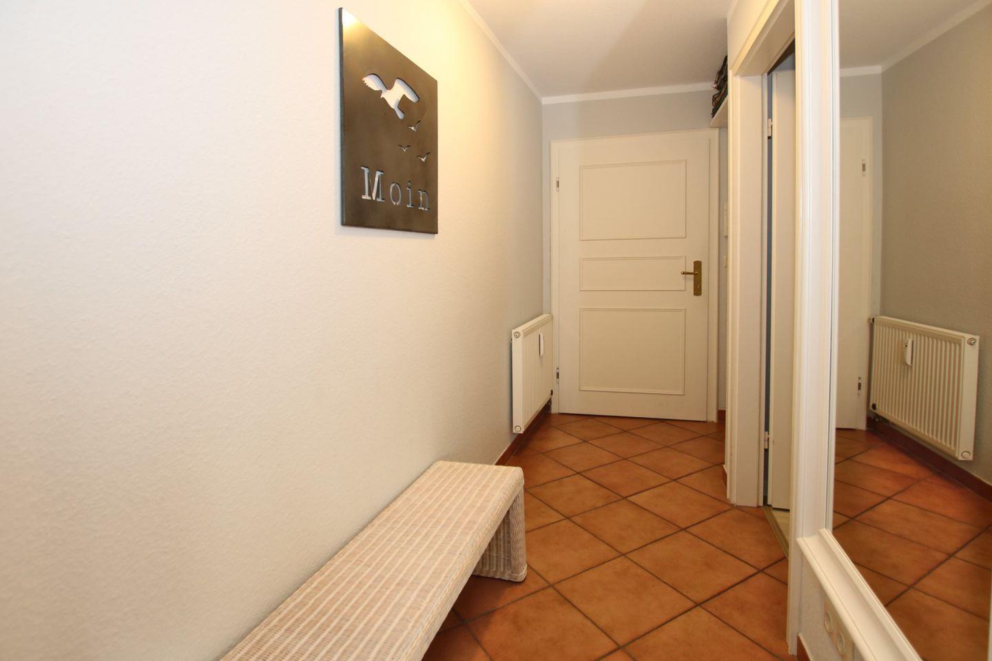 Die Wohnung gehört zu einer hübschen Wohnanlage, die nur wenige Gehminuten vom Zentrum von Wyk entfernt, aber trotzdem sehr ruhig in zweiter Reihe liegt. Zum Hauptstrand sind es ca. 300 m, zum Kurmittelhaus, der Strandpromenade und dem Erlebnisbad ca. 700 m. Zum Fähranleger kommt man ebenfalls bequem zu Fuß, falls man ohne Auto anreist.