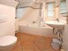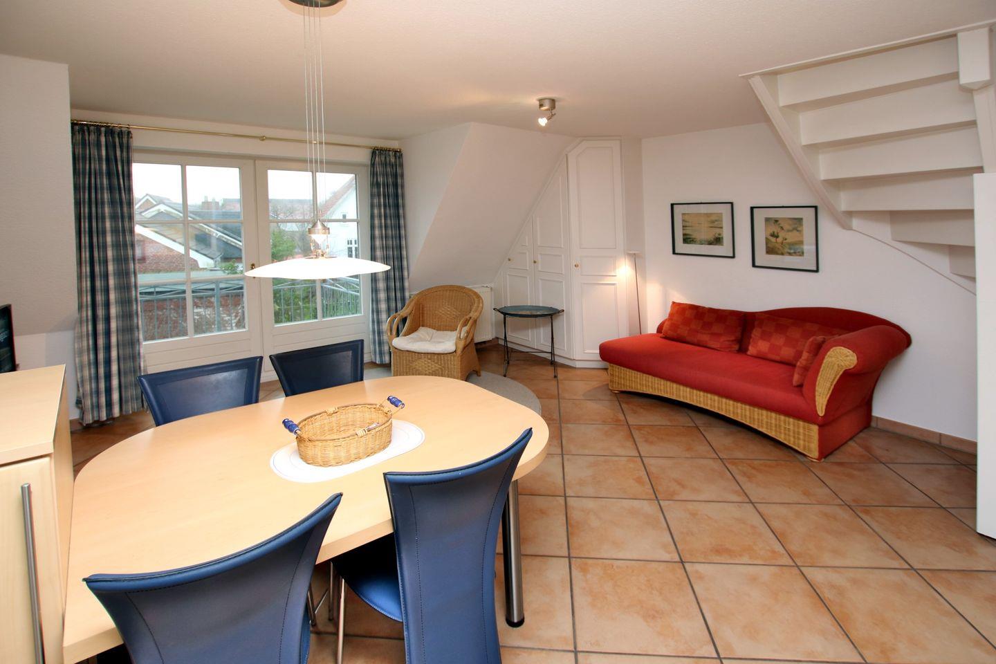 viel Komfort, Esstisch und 4 Stühlen. FLUR mit Garderobe. Diese Räume sind alle mit Fliesen ausgelegt. SCHLAFZIMMER im Spitzboden mit Doppelbett (2m x 2m) und Einbaukommode. Das Schlafzimmer hat Teppich. BAD mit Wanne/Duschvorhang und WC. Zum Zentrum sind es nur wenige Gehminuten, zum Hauptstrand ca. 300 m, zum Kurmittelhaus und Erlebnisbad ca. 700 m. LAGE: direkt im Zentrum, aber trotzdem sehr ruhig in zweiter Reihe. Waschmaschine und Trockner auf Münzbasis im Gemeinschaftskeller.
