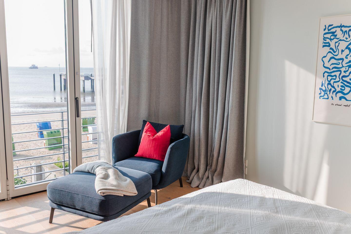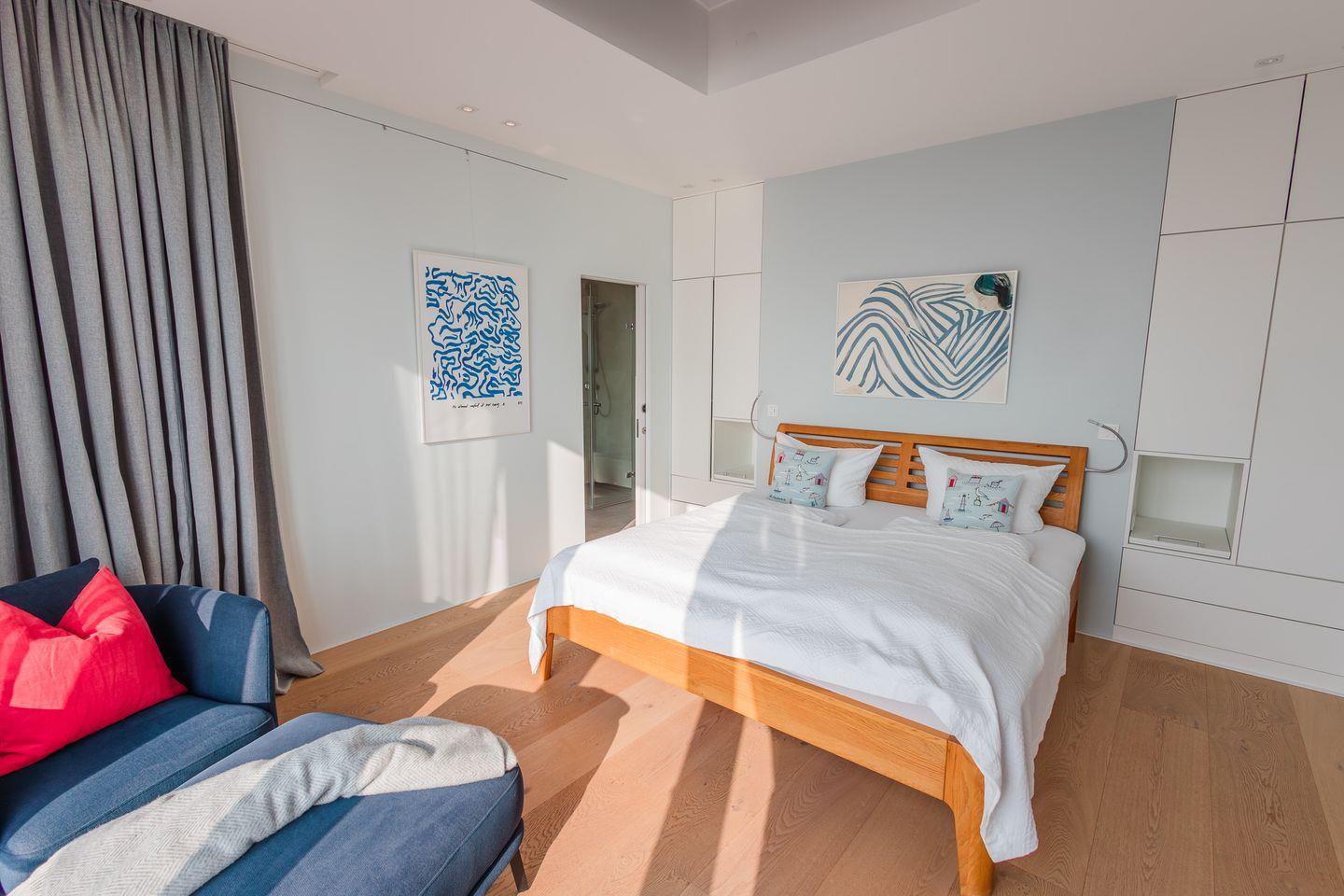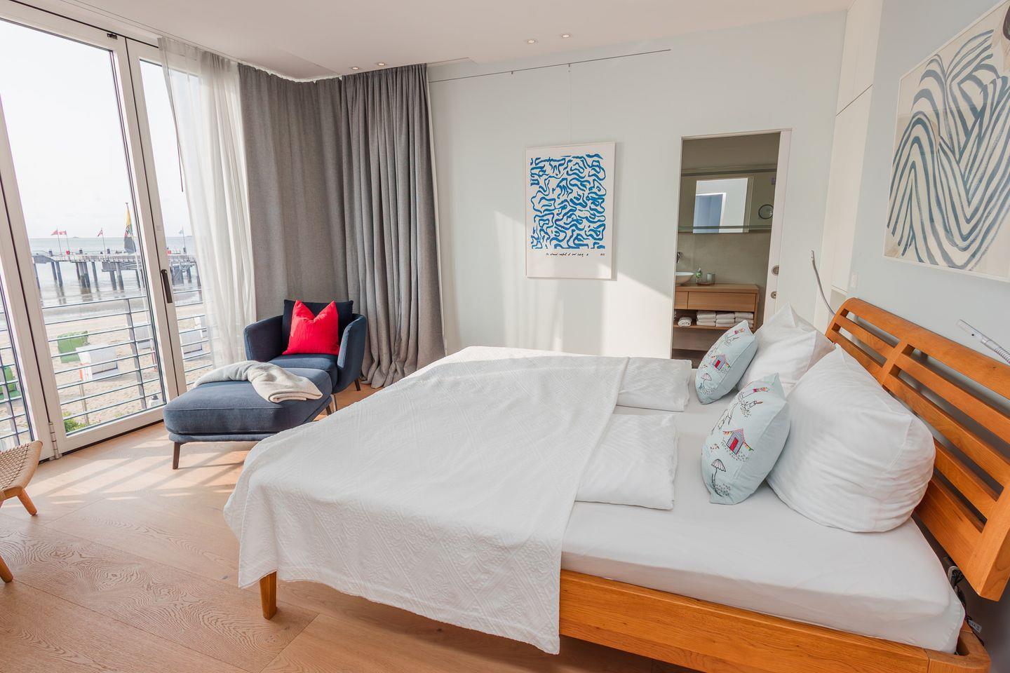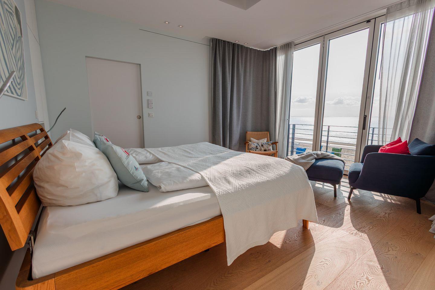 Im Obergeschoss befinden sich zwei Schlafzimmer. Ein Schlafzimmer ist mit einem Doppelbett ausgestattet. Von dort aus können Sie durch das große Panoramafenster den Sonnenaufgang erleben und an klaren Tagen über das Meer bis zu den Halligen schauen. Tagsüber können Sie hier den Rundblick über Strand und Meer auch vom gemütlichen Lesesessel genießen. Das andere Schlafzimmer mit Blick auf den Sandwall verfügt über Stapelbetten von Rolf Heide, die eine flexible Nutzung ermöglichen (zusätzliche Schlafmöglichkeit, Stellen der Betten). Die beiden Bäder sind en Suite gelegen, es gibt ein Vollbad und ein Duschbad. Außerdem befindet sich im Obergeschoss ein weiterer Arbeitsplatz, der mit einem Drucker ausgestattet ist.