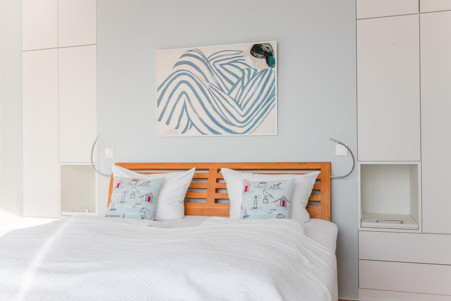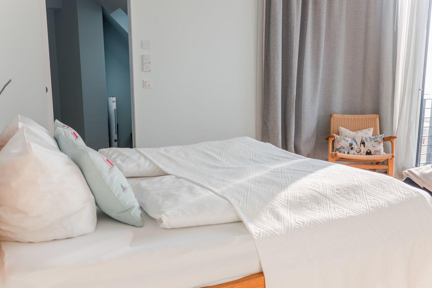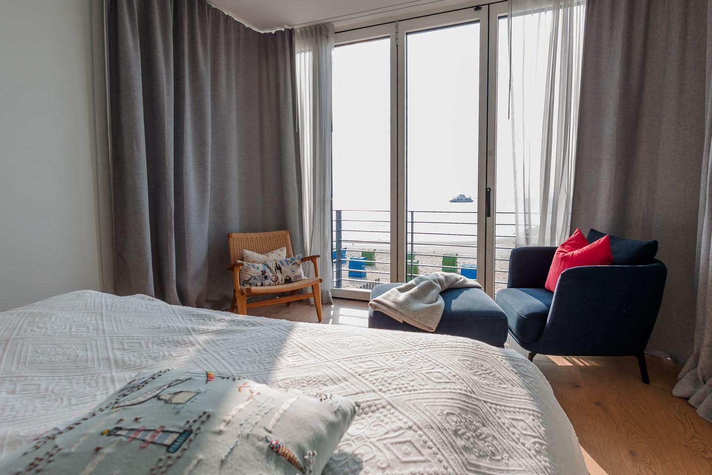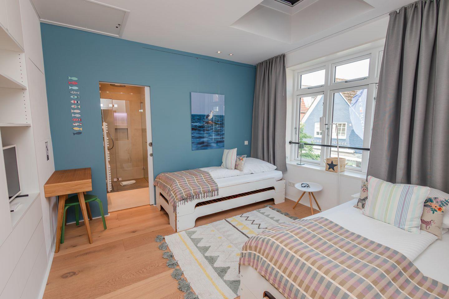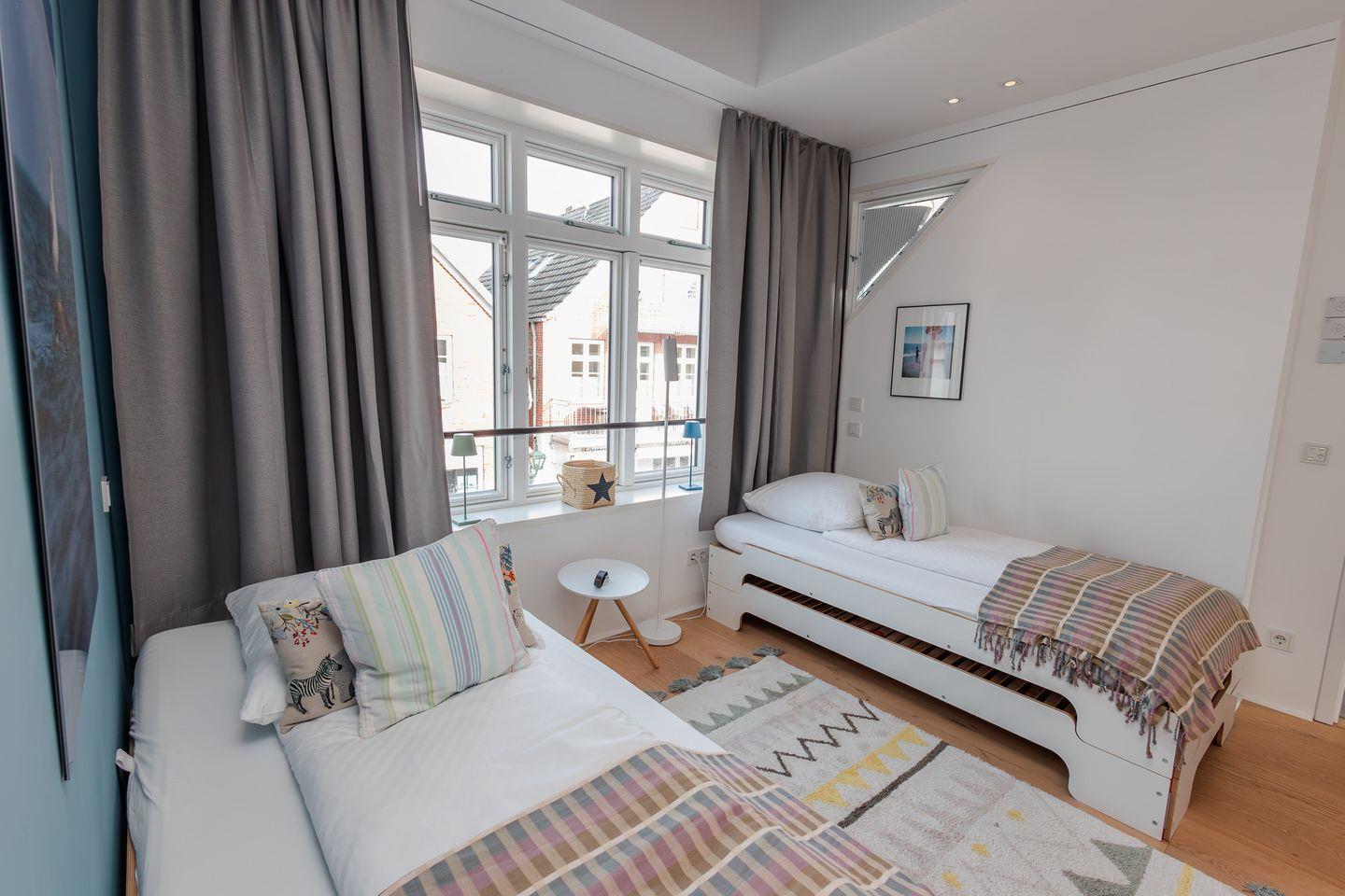 Im Obergeschoss befinden sich zwei Schlafzimmer. Ein Schlafzimmer ist mit einem Doppelbett ausgestattet. Von dort aus können Sie durch das große Panoramafenster den Sonnenaufgang erleben und an klaren Tagen über das Meer bis zu den Halligen schauen. Tagsüber können Sie hier den Rundblick über Strand und Meer auch vom gemütlichen Lesesessel genießen. Das andere Schlafzimmer mit Blick auf den Sandwall verfügt über Stapelbetten von Rolf Heide, die eine flexible Nutzung ermöglichen (zusätzliche Schlafmöglichkeit, Stellen der Betten). Die beiden Bäder sind en Suite gelegen, es gibt ein Vollbad und ein Duschbad. Außerdem befindet sich im Obergeschoss ein weiterer Arbeitsplatz, der mit einem Drucker ausgestattet ist.