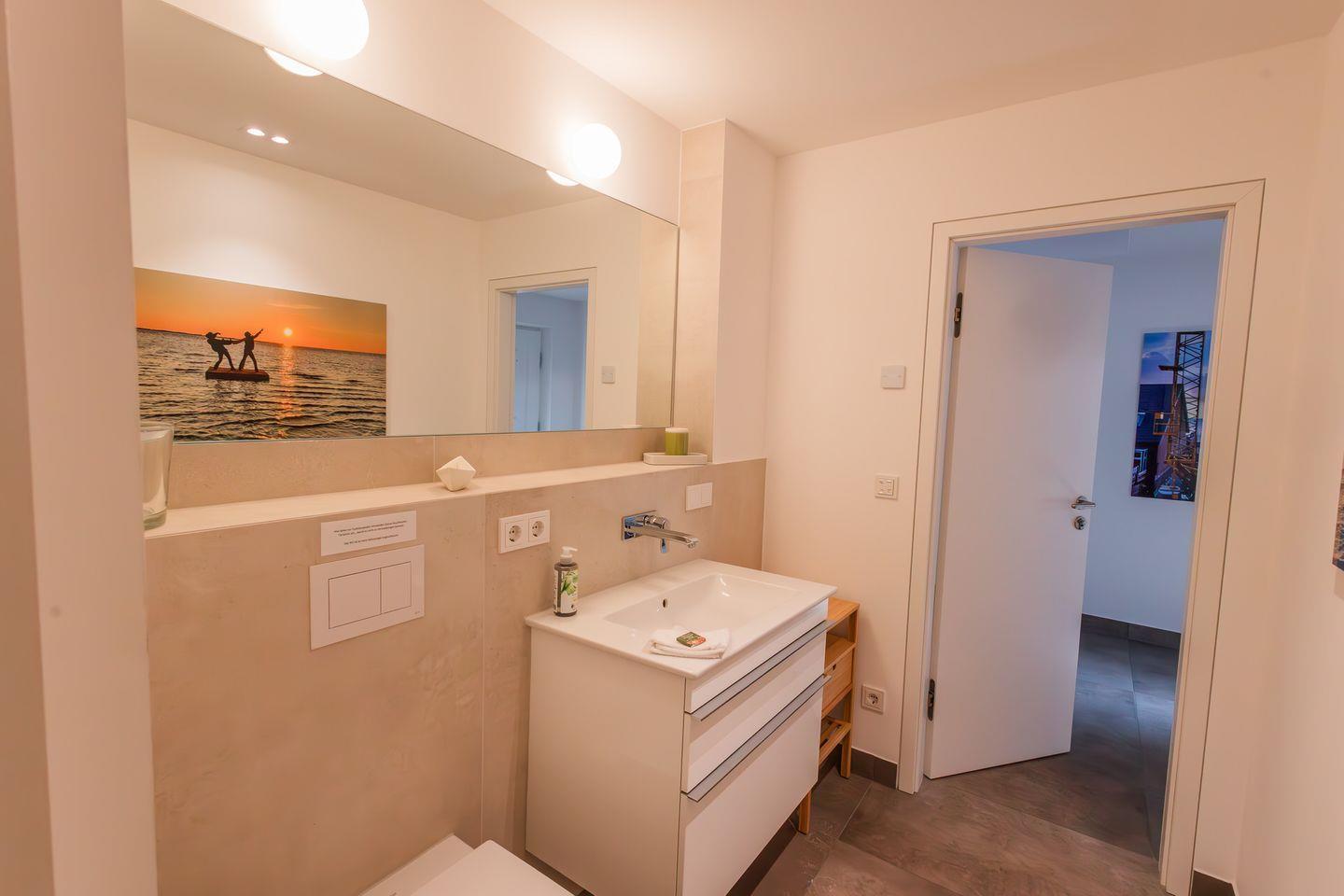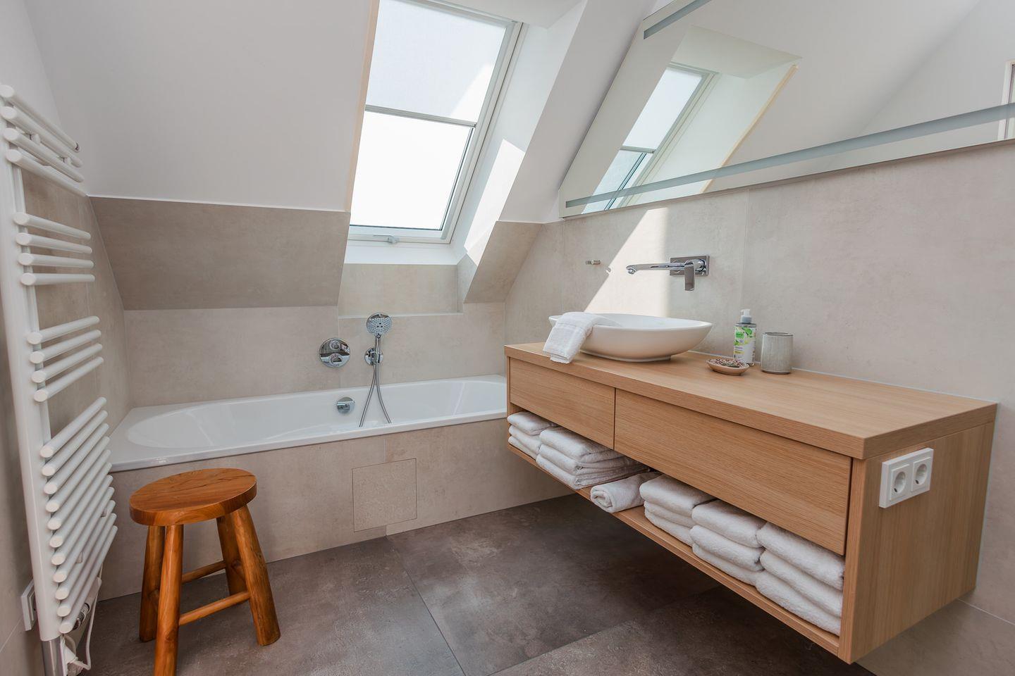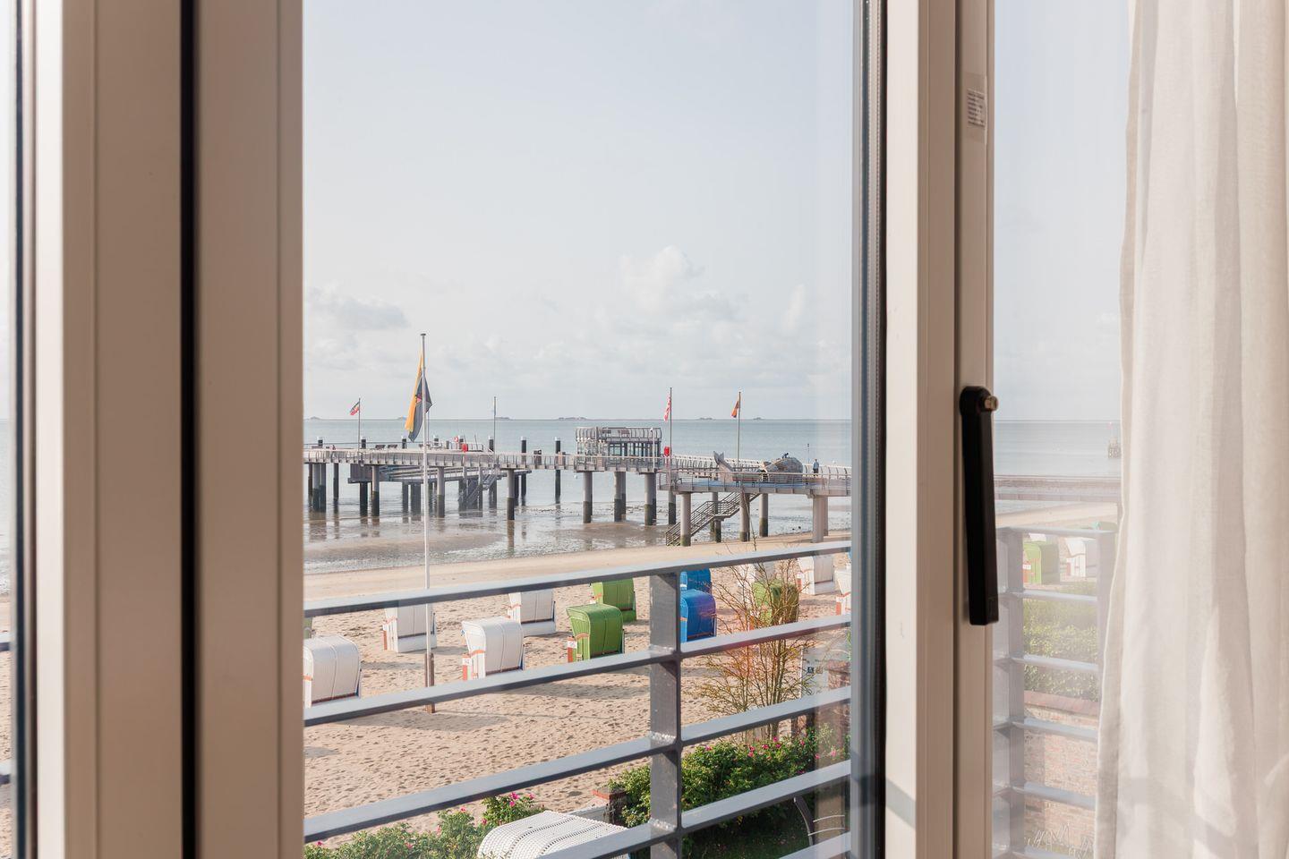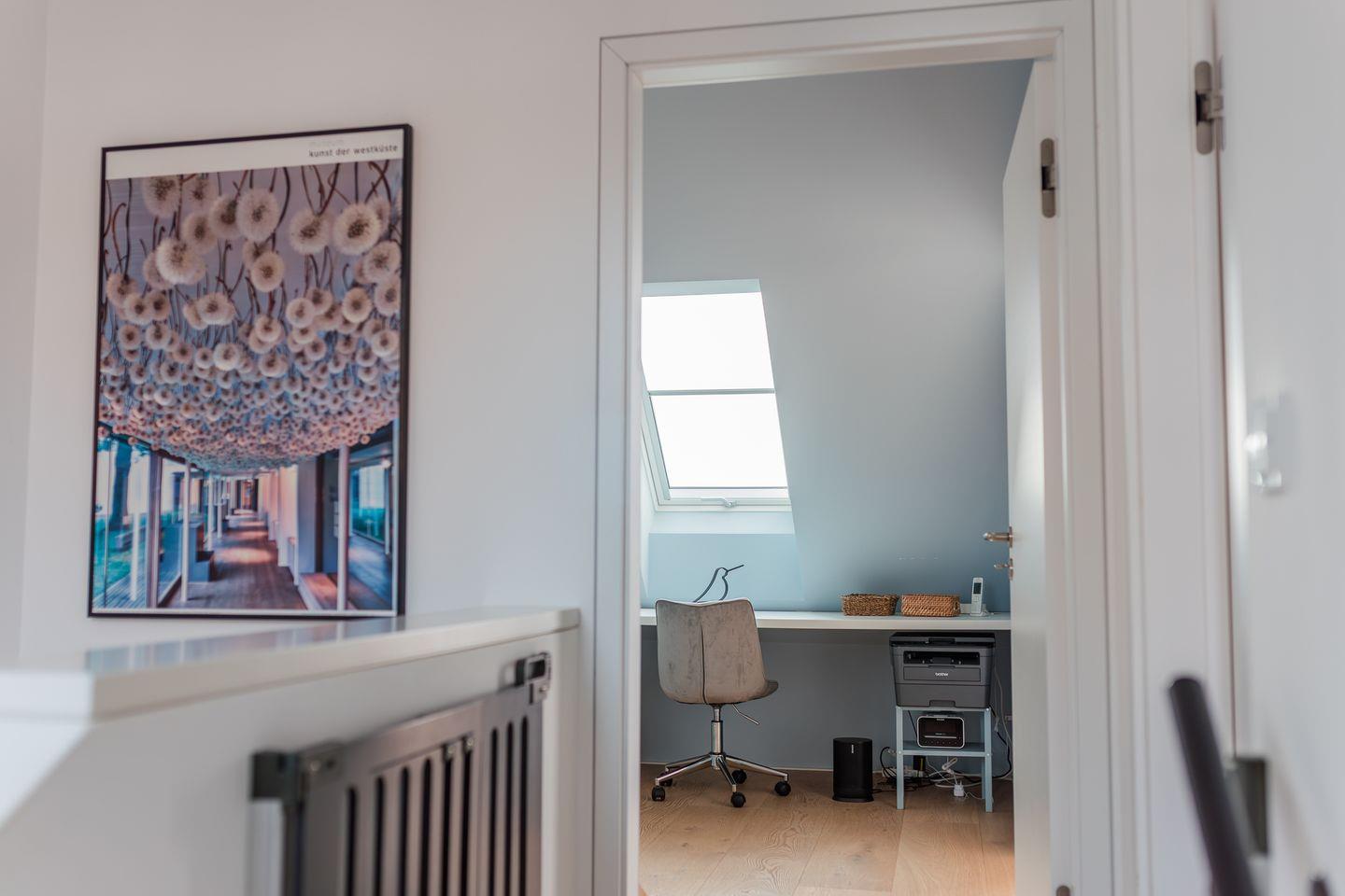Im Obergeschoss befinden sich zwei Schlafzimmer. Ein Schlafzimmer ist mit einem Doppelbett ausgestattet. Von dort aus können Sie durch das große Panoramafenster den Sonnenaufgang erleben und an klaren Tagen über das Meer bis zu den Halligen schauen. Tagsüber können Sie hier den Rundblick über Strand und Meer auch vom gemütlichen Lesesessel genießen. Das andere Schlafzimmer mit Blick auf den Sandwall verfügt über Stapelbetten von Rolf Heide, die eine flexible Nutzung ermöglichen (zusätzliche Schlafmöglichkeit, Stellen der Betten). Die beiden Bäder sind en Suite gelegen, es gibt ein Vollbad und ein Duschbad. Außerdem befindet sich im Obergeschoss ein weiterer Arbeitsplatz, der mit einem Drucker ausgestattet ist.