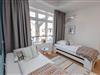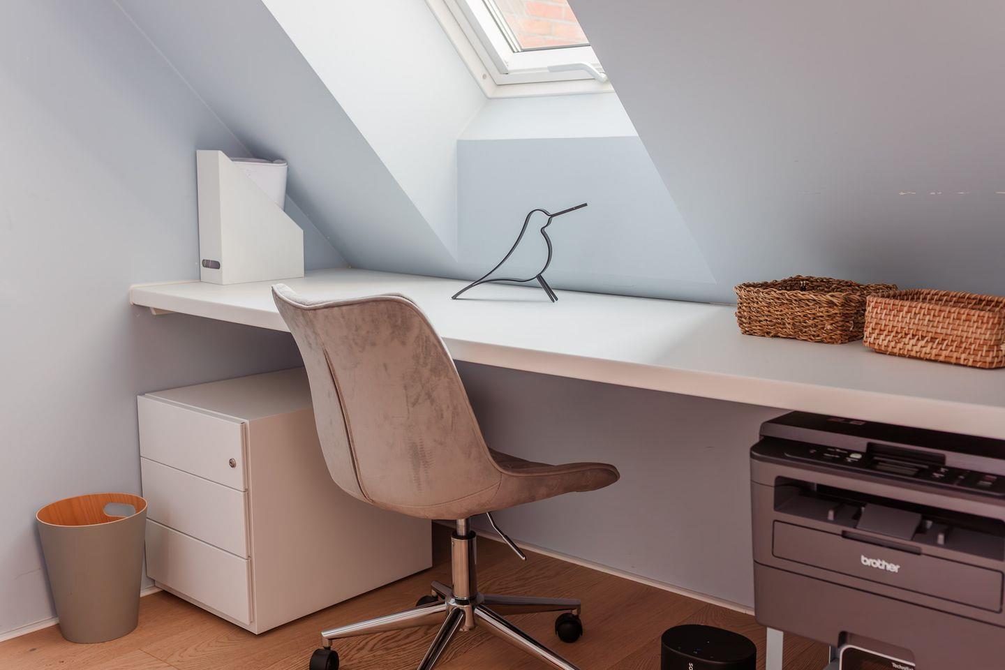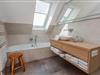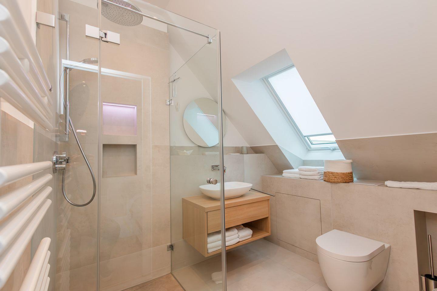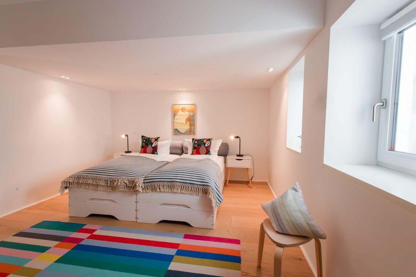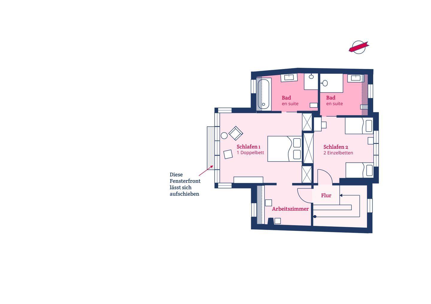 Im Obergeschoss befinden sich zwei Schlafzimmer. Ein Schlafzimmer ist mit einem Doppelbett ausgestattet. Von dort aus können Sie durch das große Panoramafenster den Sonnenaufgang erleben und an klaren Tagen über das Meer bis zu den Halligen schauen. Tagsüber können Sie hier den Rundblick über Strand und Meer auch vom gemütlichen Lesesessel genießen. Das andere Schlafzimmer mit Blick auf den Sandwall verfügt über Stapelbetten von Rolf Heide, die eine flexible Nutzung ermöglichen (zusätzliche Schlafmöglichkeit, Stellen der Betten). Die beiden Bäder sind en Suite gelegen, es gibt ein Vollbad und ein Duschbad. Außerdem befindet sich im Obergeschoss ein weiterer Arbeitsplatz, der mit einem Drucker ausgestattet ist.