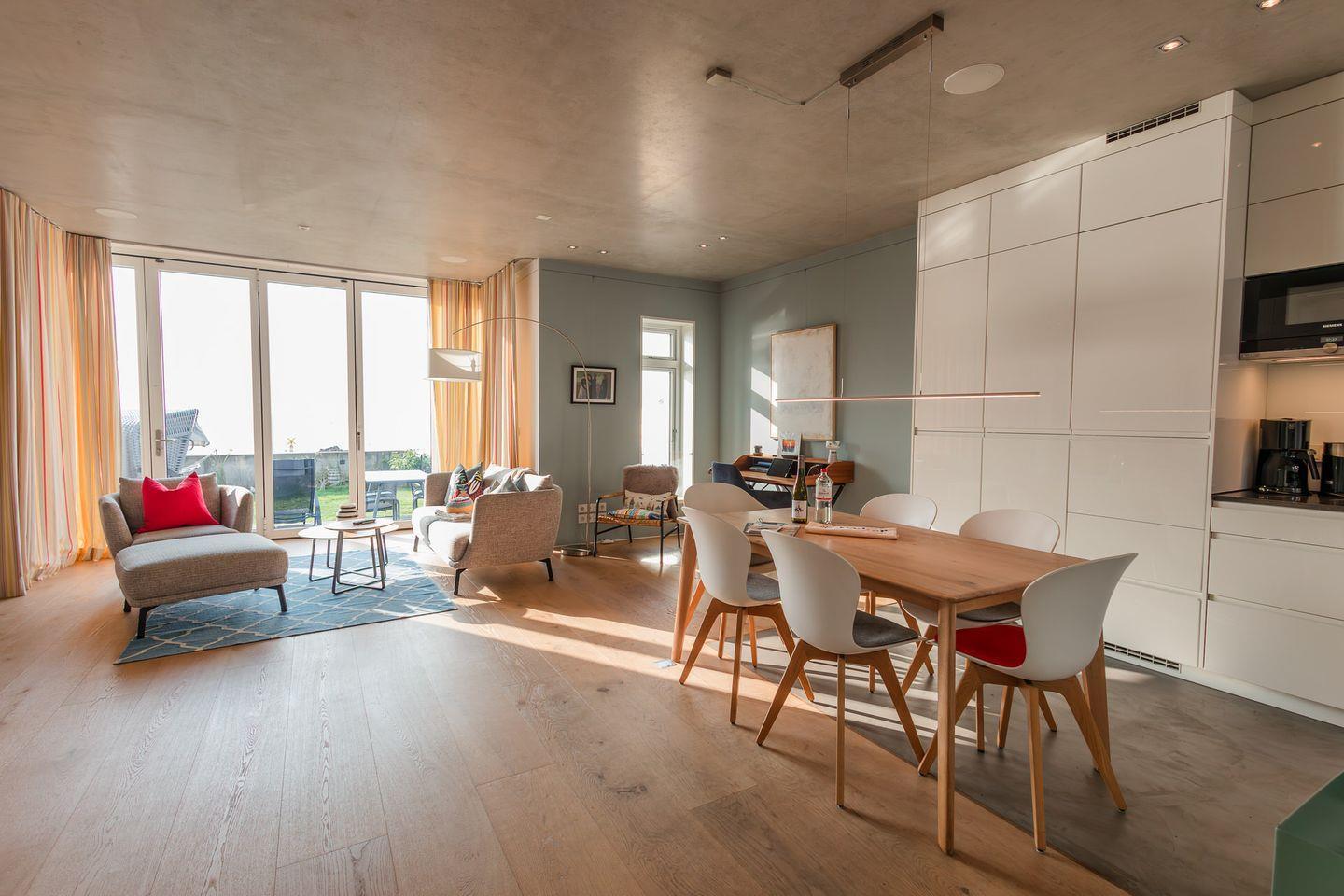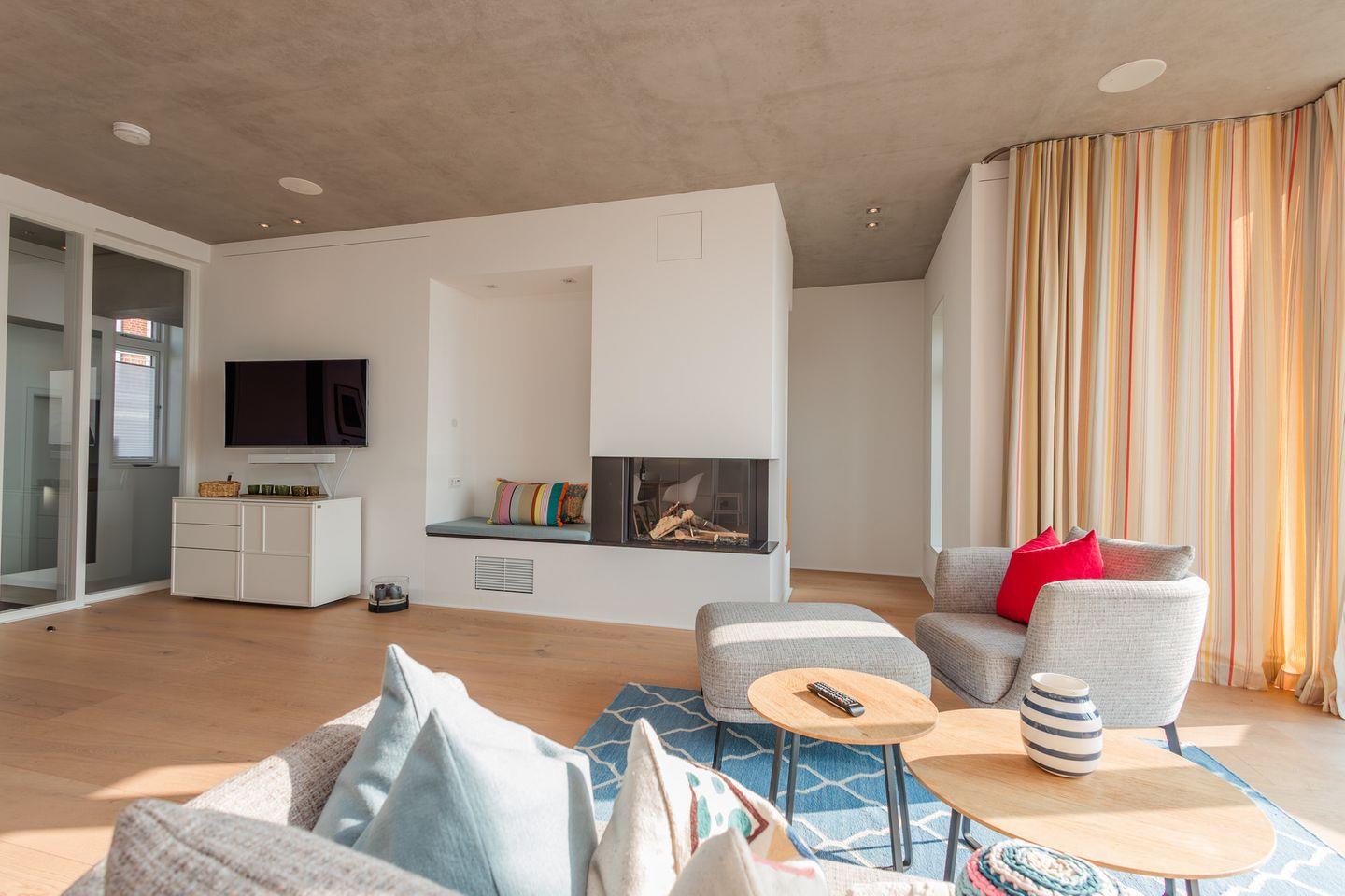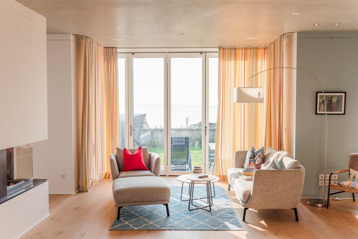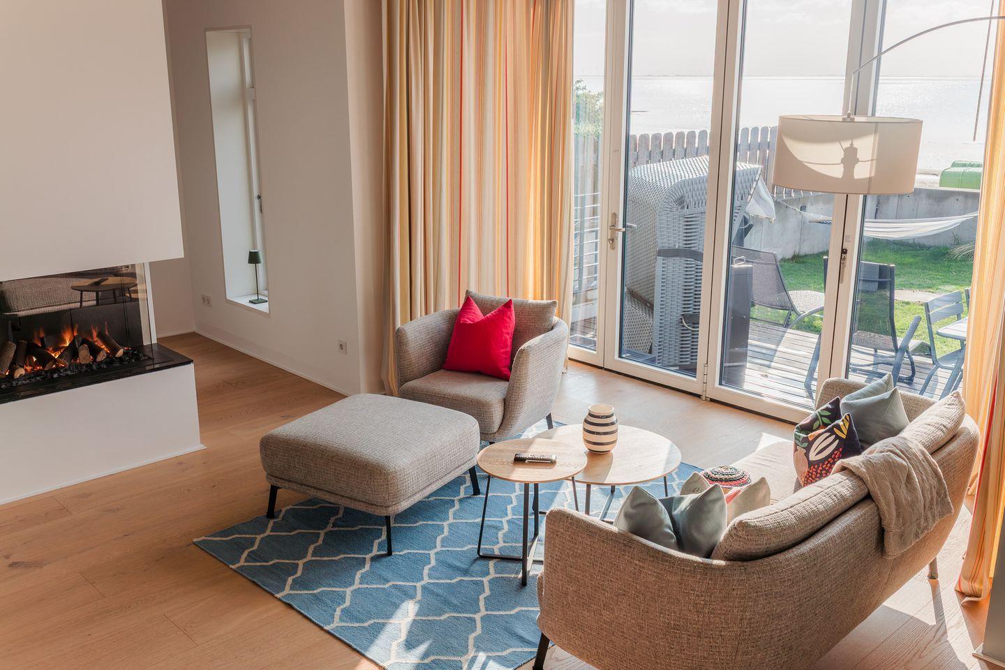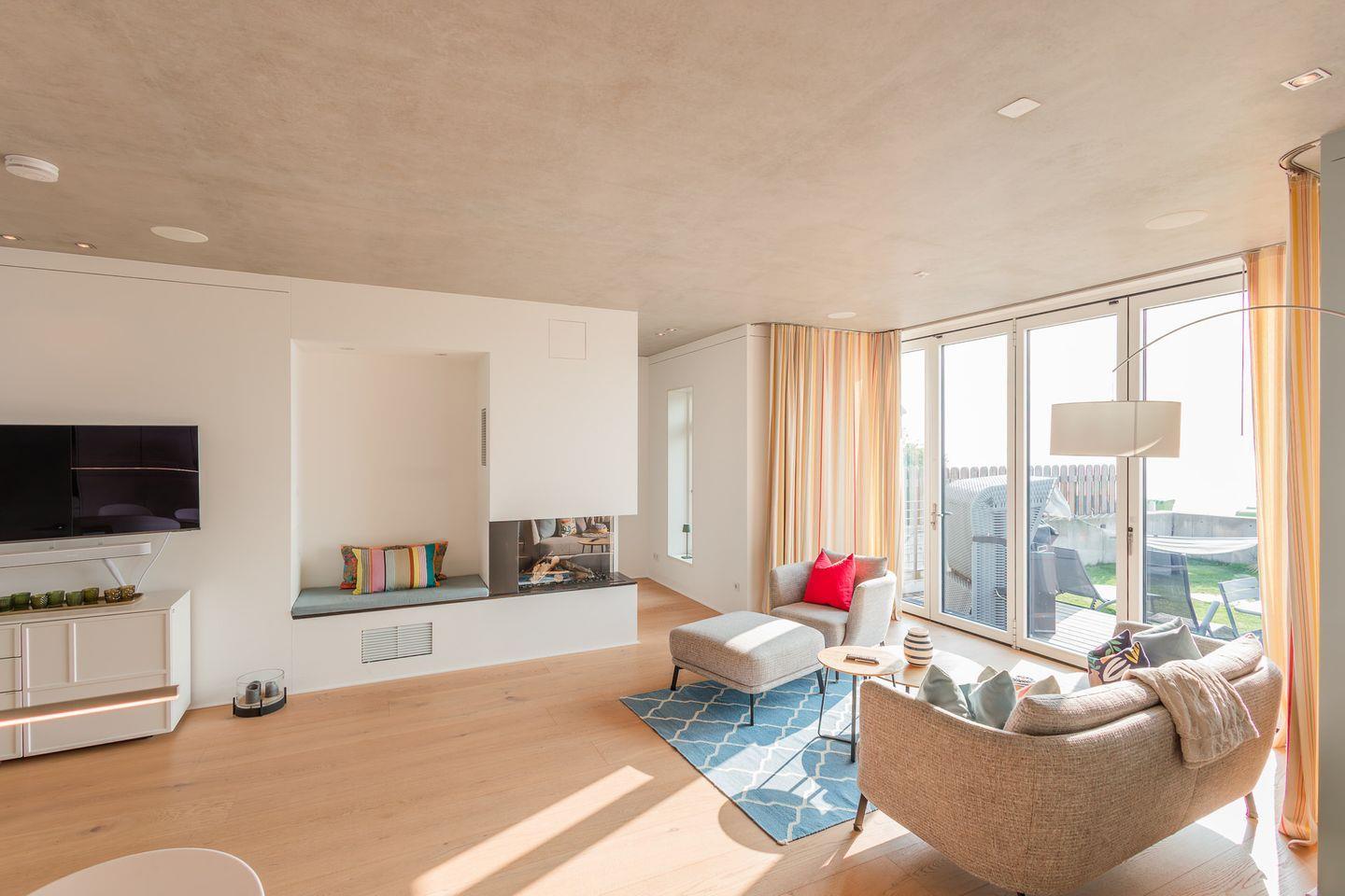Im Erdgeschoss befinden sich der großzügige Wohn- und Essbereich mit einer offenen Küche und ein Gäste-WC. Von der einladenden Sitzecke und dem Arbeitsplatz im Wohnbereich schauen Sie durch bodentiefe Fenster auf die Nordsee. Neben dem Gaskamin, der auch an kühleren Tagen für eine wohlige Atmosphäre sorgt, gibt es hier auch eine gemütliche Nische zum Lesen. Über den Wohnbereich gelangen Sie in den Garten.