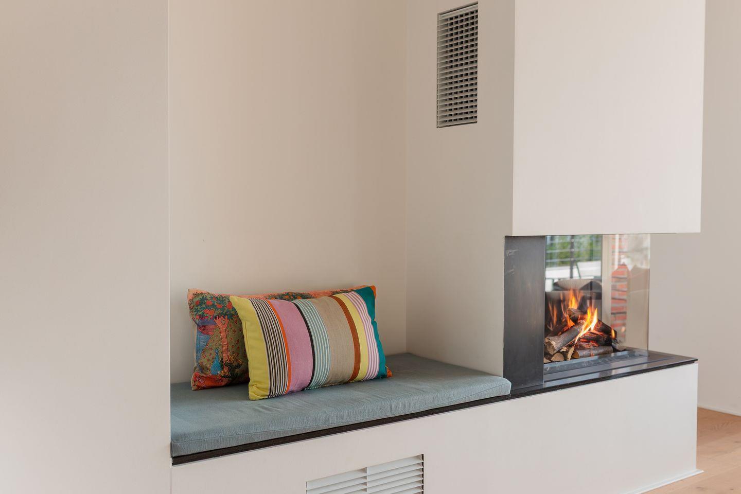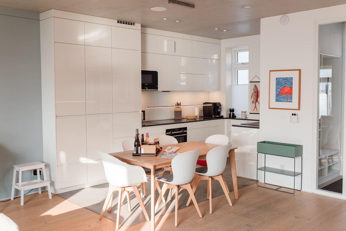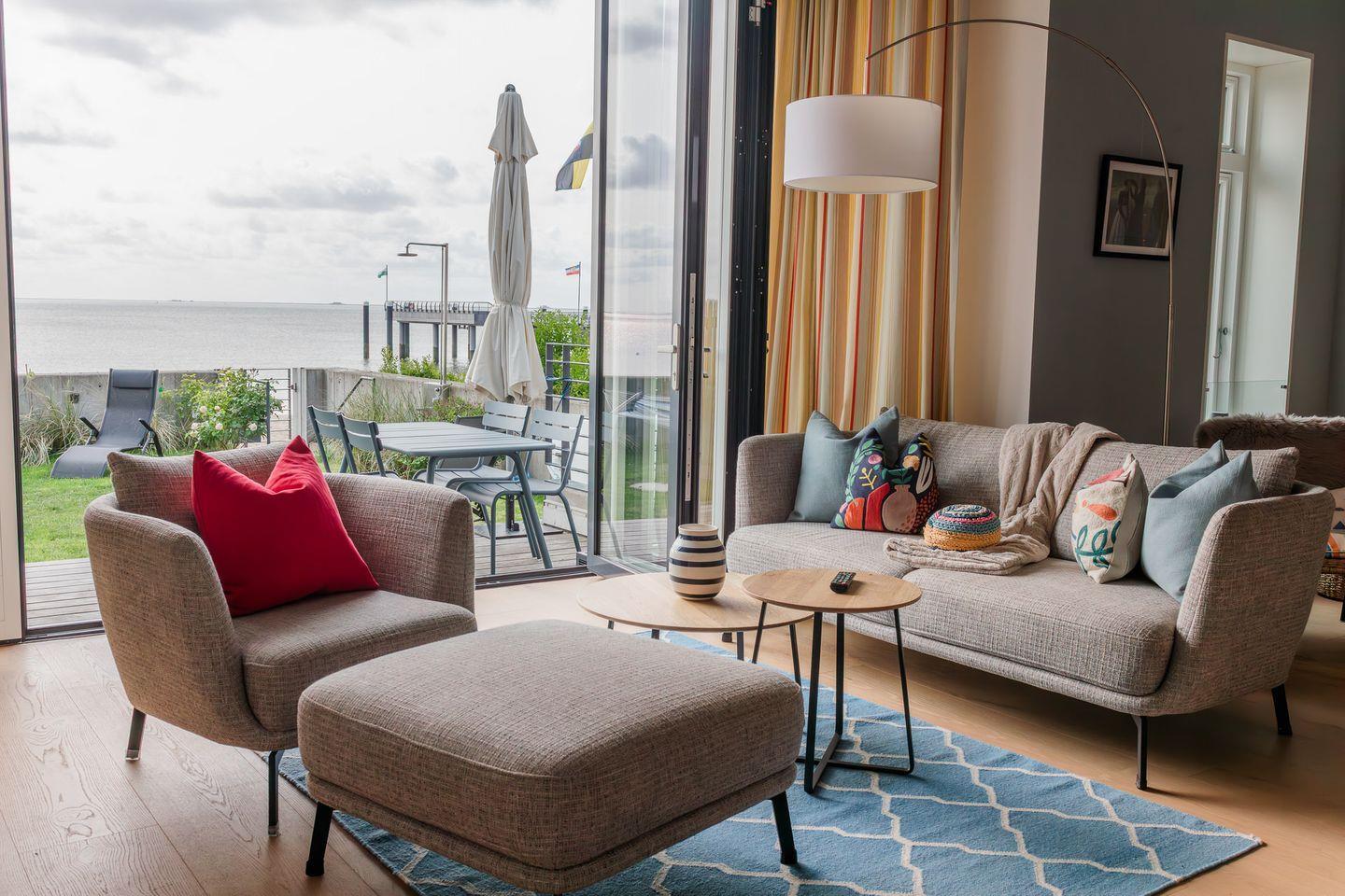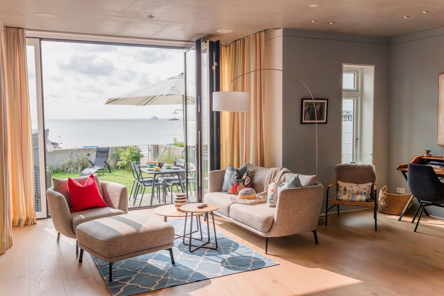 Im Erdgeschoss befinden sich der großzügige Wohn- und Essbereich mit einer offenen Küche und ein Gäste-WC. Von der einladenden Sitzecke und dem Arbeitsplatz im Wohnbereich schauen Sie durch bodentiefe Fenster auf die Nordsee. Neben dem Gaskamin, der auch an kühleren Tagen für eine wohlige Atmosphäre sorgt, gibt es hier auch eine gemütliche Nische zum Lesen. Über den Wohnbereich gelangen Sie in den Garten.
