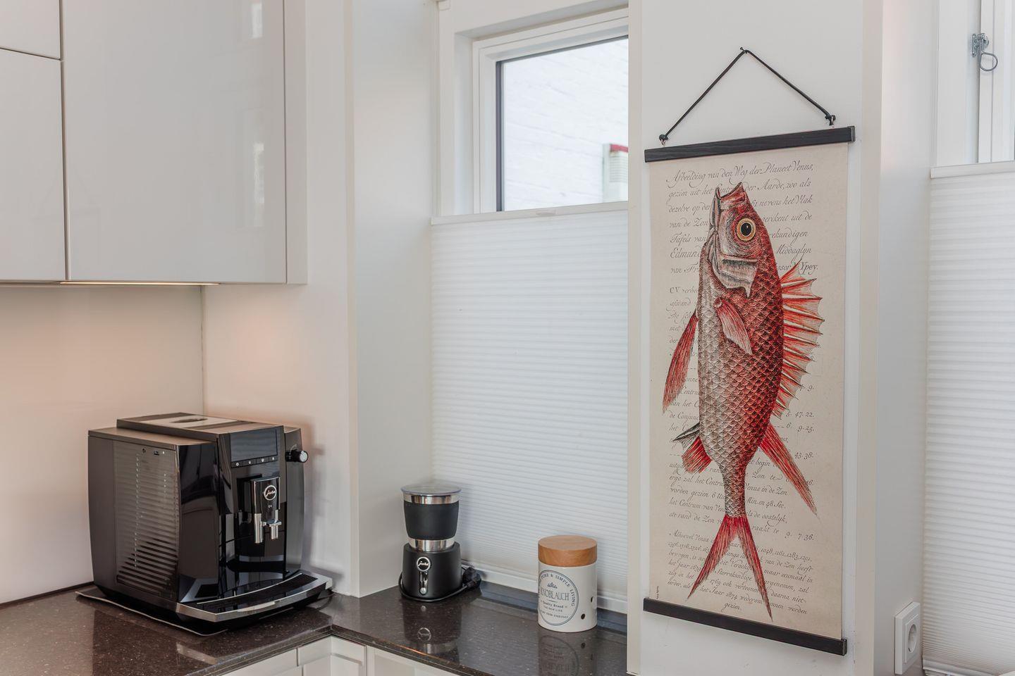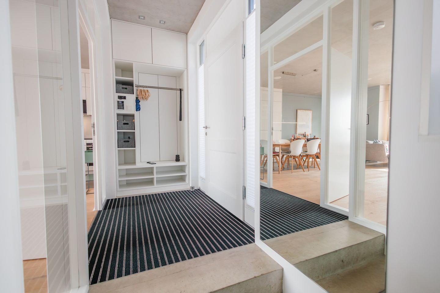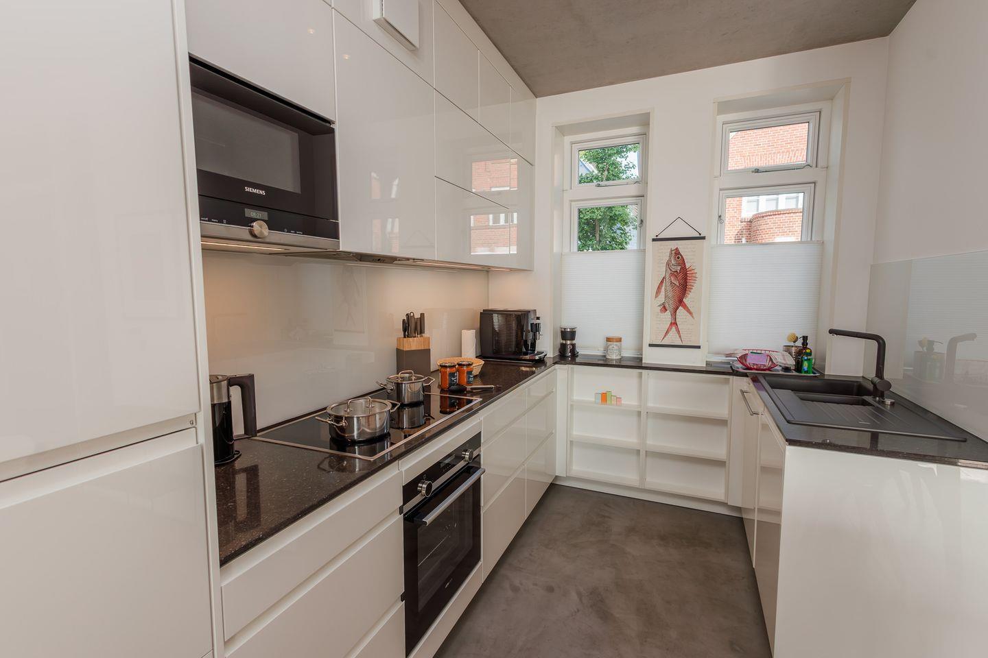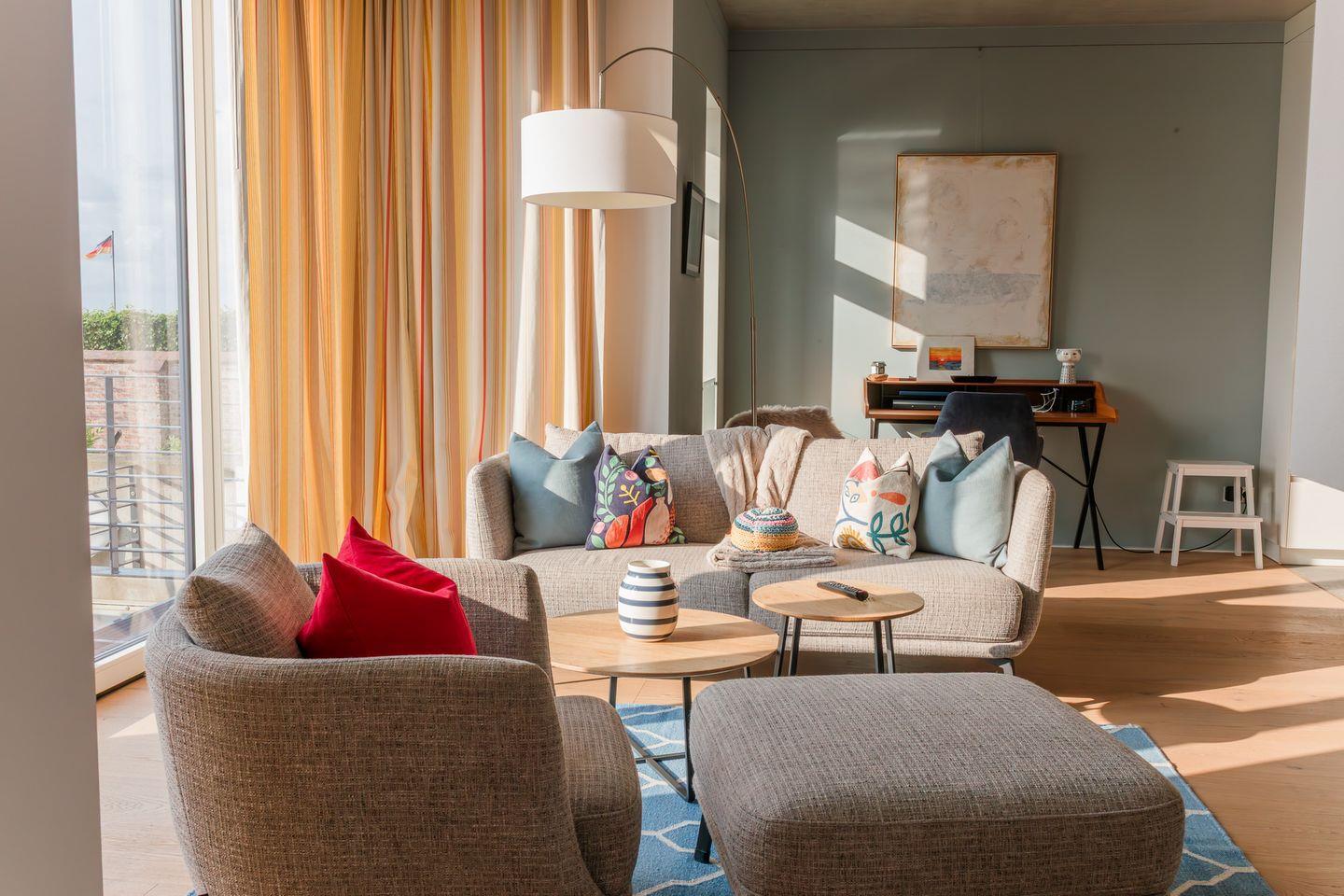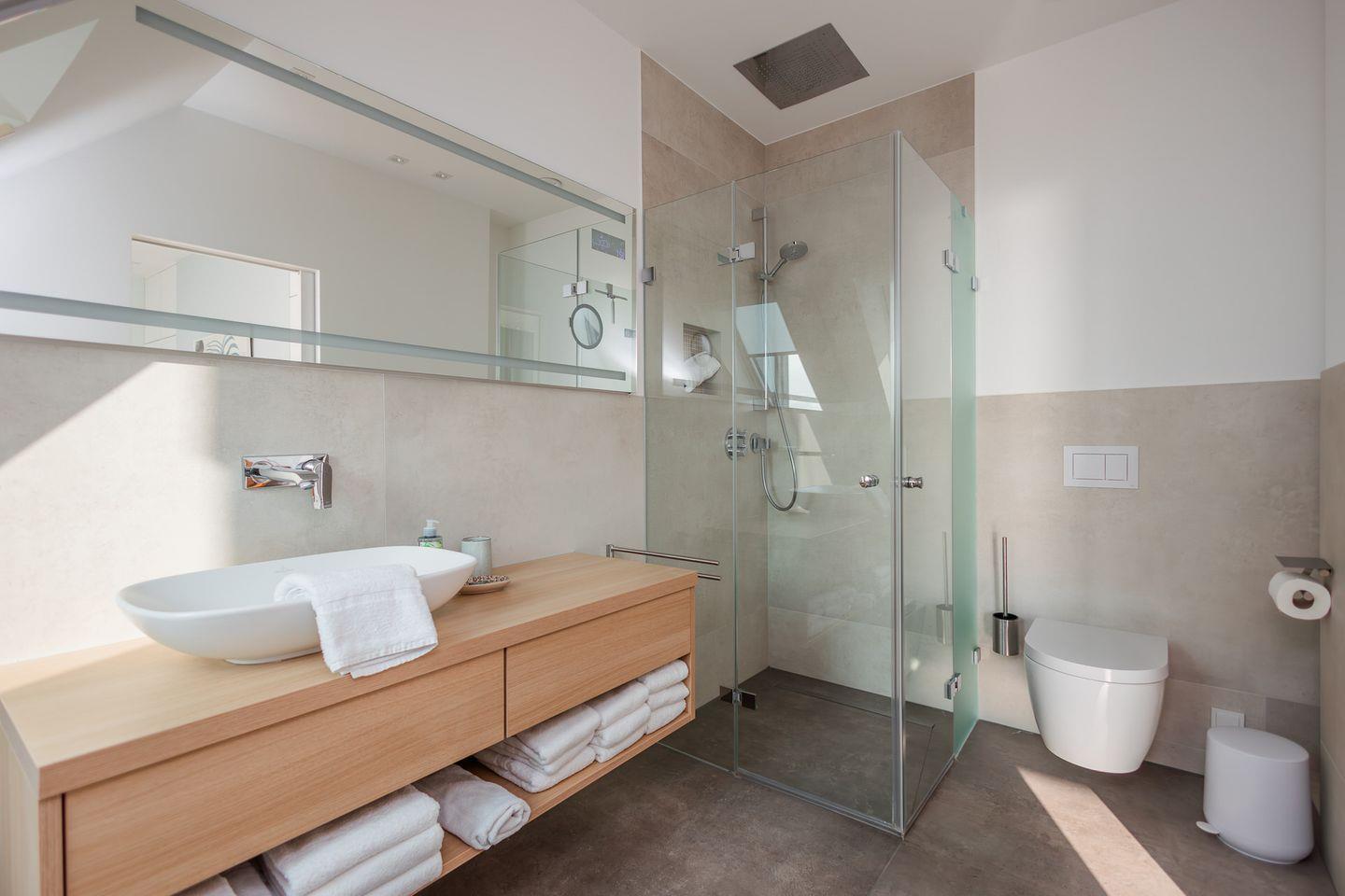 Im Erdgeschoss befinden sich der großzügige Wohn- und Essbereich mit einer offenen Küche und ein Gäste-WC. Von der einladenden Sitzecke und dem Arbeitsplatz im Wohnbereich schauen Sie durch bodentiefe Fenster auf die Nordsee. Neben dem Gaskamin, der auch an kühleren Tagen für eine wohlige Atmosphäre sorgt, gibt es hier auch eine gemütliche Nische zum Lesen. Über den Wohnbereich gelangen Sie in den Garten.