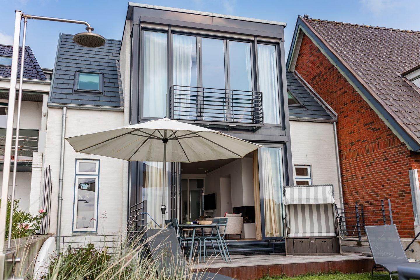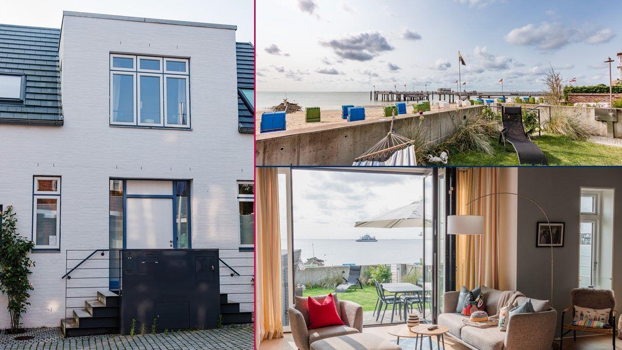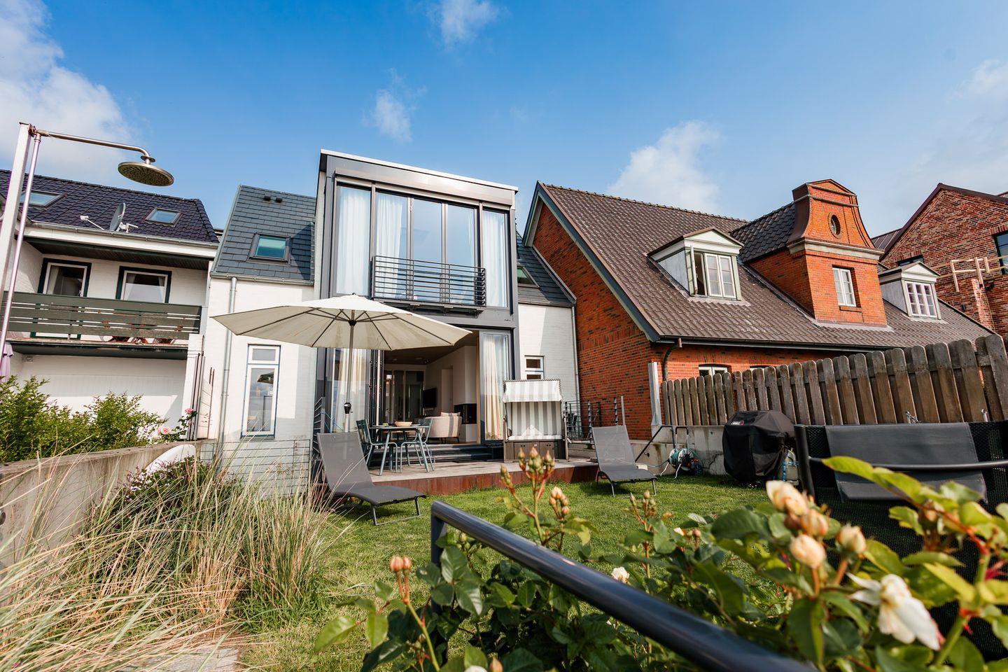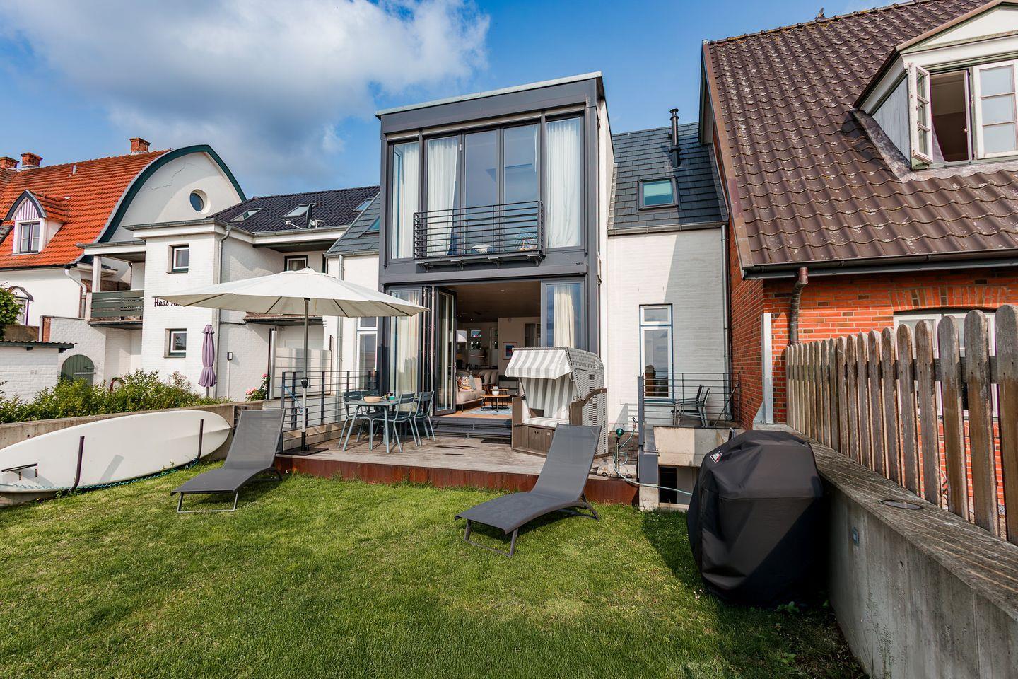 Exklusives, modern eingerichtetes Architektenhaus in erster Reihe an Strand und Meer und an der Promenade in Wyk. Mit eigenem Zugang zum Sandstrand, einem kleinen Garten mit Terrasse und Strandkorb, sowie einem Gaskamin und eigener Sauna.