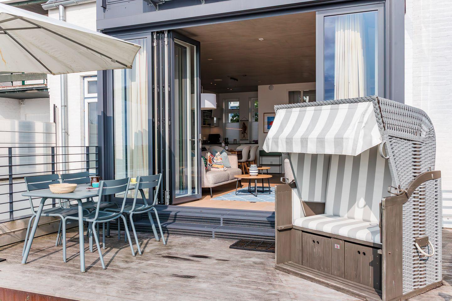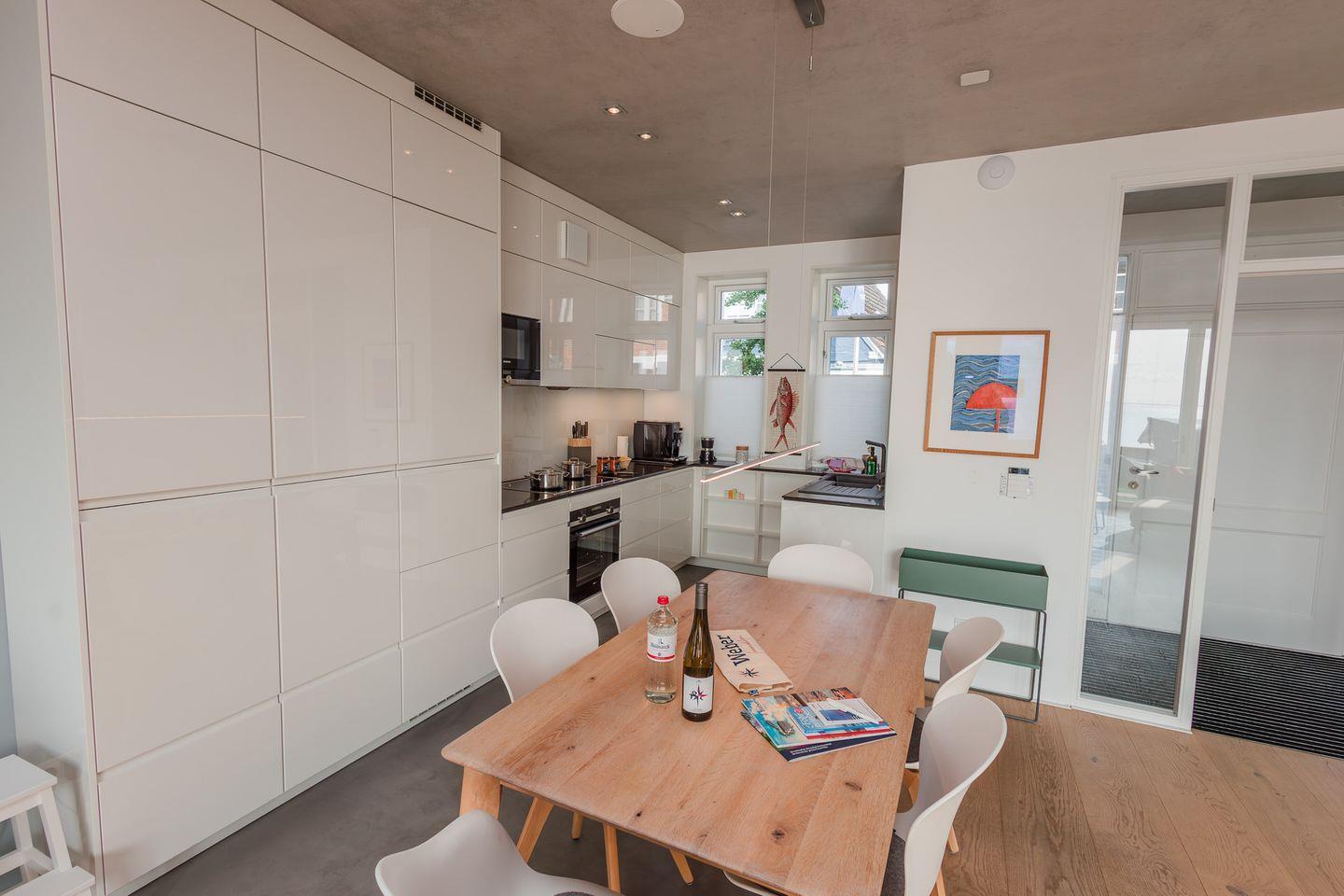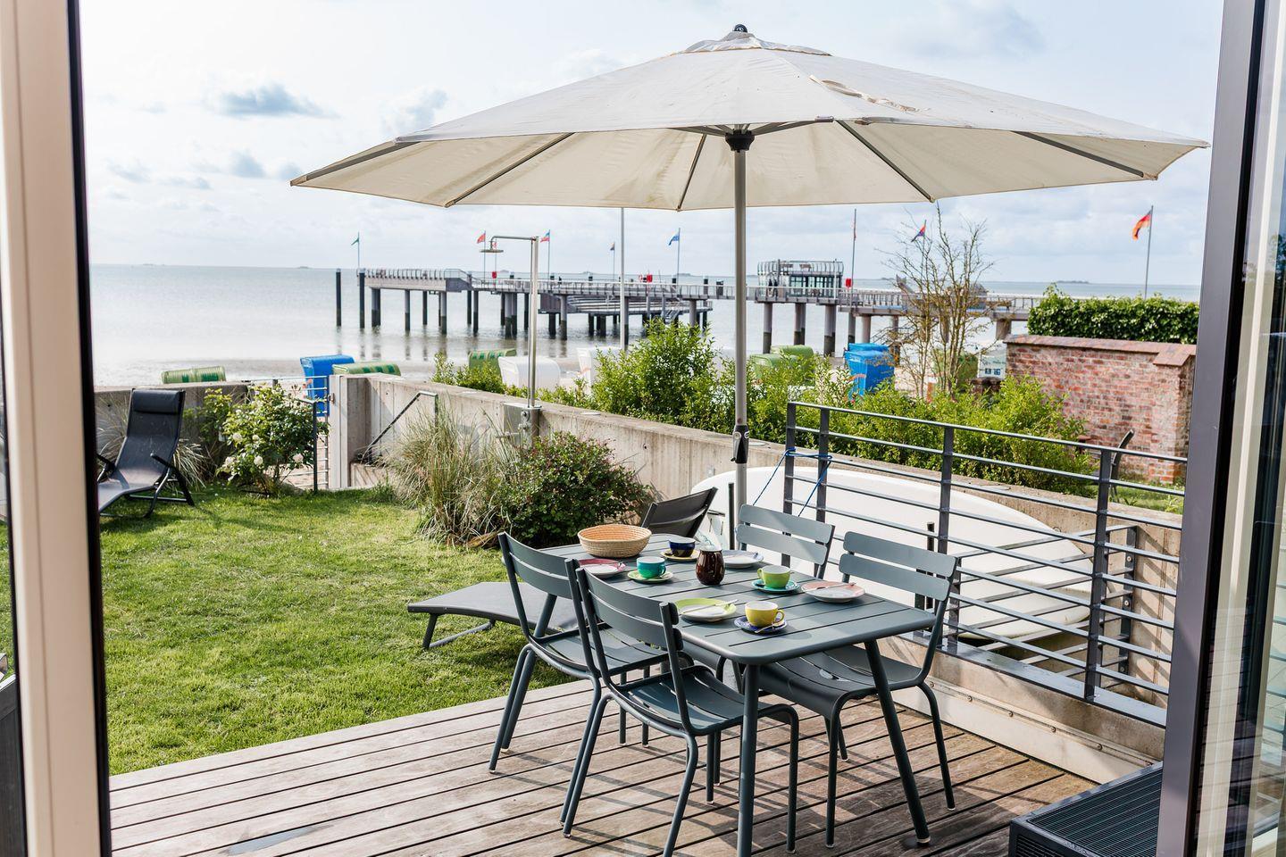 Exklusives, modern eingerichtetes Architektenhaus in erster Reihe an Strand und Meer und an der Promenade in Wyk. Mit eigenem Zugang zum Sandstrand, einem kleinen Garten mit Terrasse und Strandkorb, sowie einem Gaskamin und eigener Sauna.