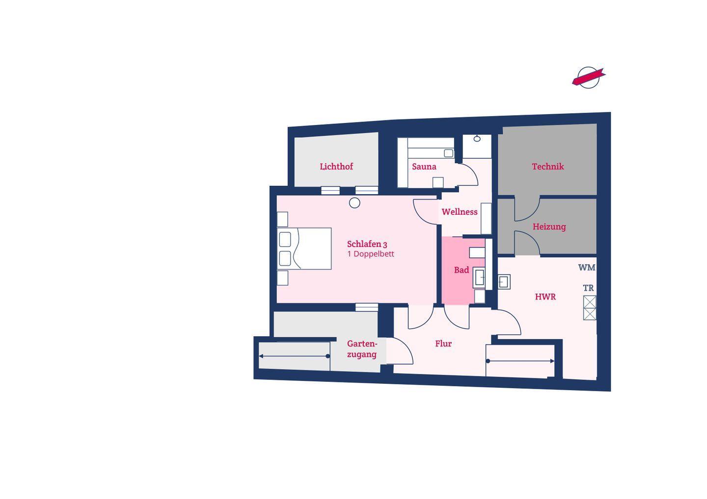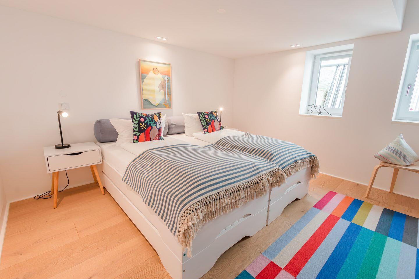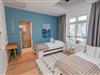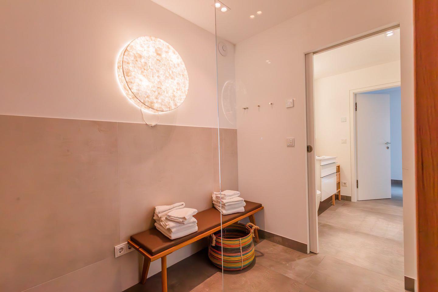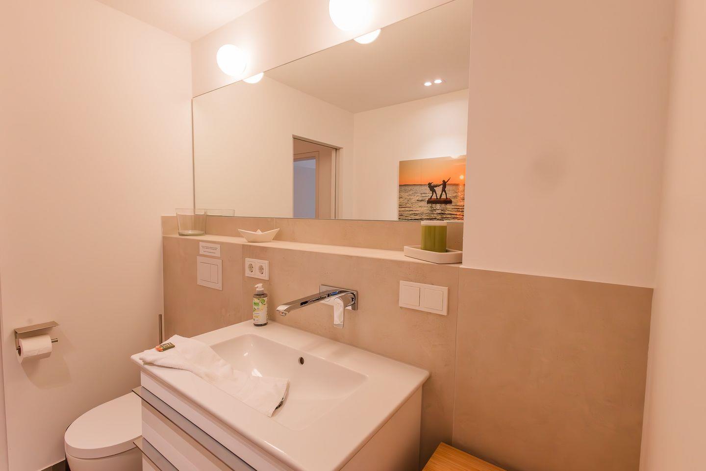Im Souterrain gibt es ein weiteres Schlafzimmer, ein WC, eine Dusche und die hauseigene Sauna. Vom Souterrain gelangen Sie durch einen eigenen Ausgang in den Garten direkt an den Strand, so dass Sie sich nach der Sauna mit einem Bad im Meer erfrischen können. Auch das Schlafzimmer im Souterrain verfügt über Stapelbetten zur flexiblen Nutzung und kann als Ruheraum nach dem Saunagang benutzt werden. Im Souterrain befindet sich außerdem der mit Waschmaschine und Trockner ausgestattete Hauswirtschaftsraum.