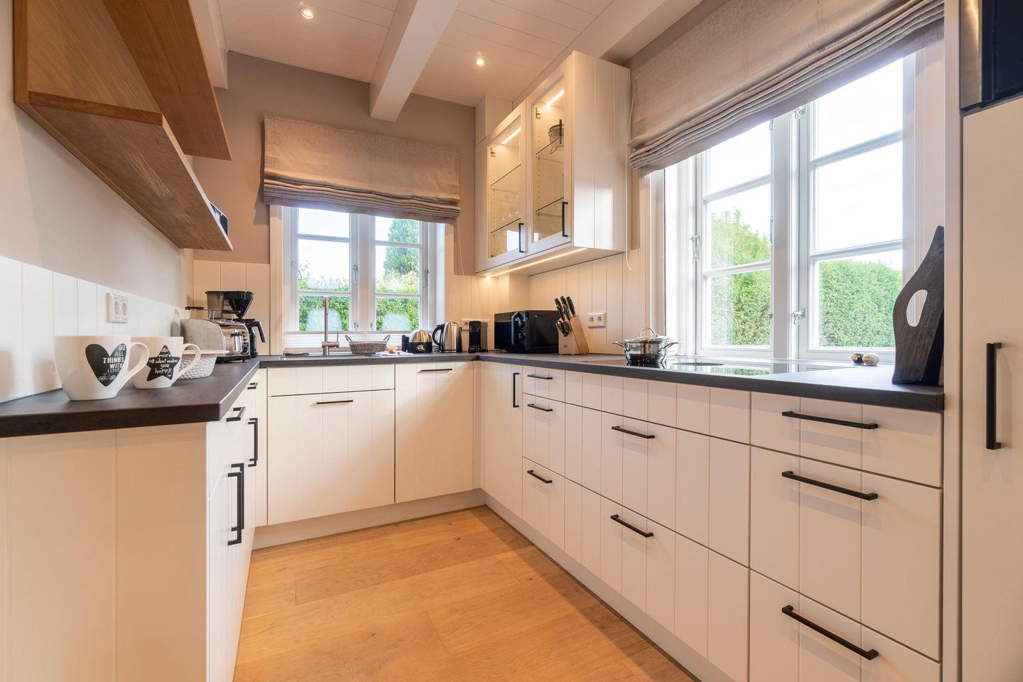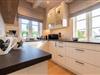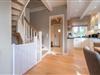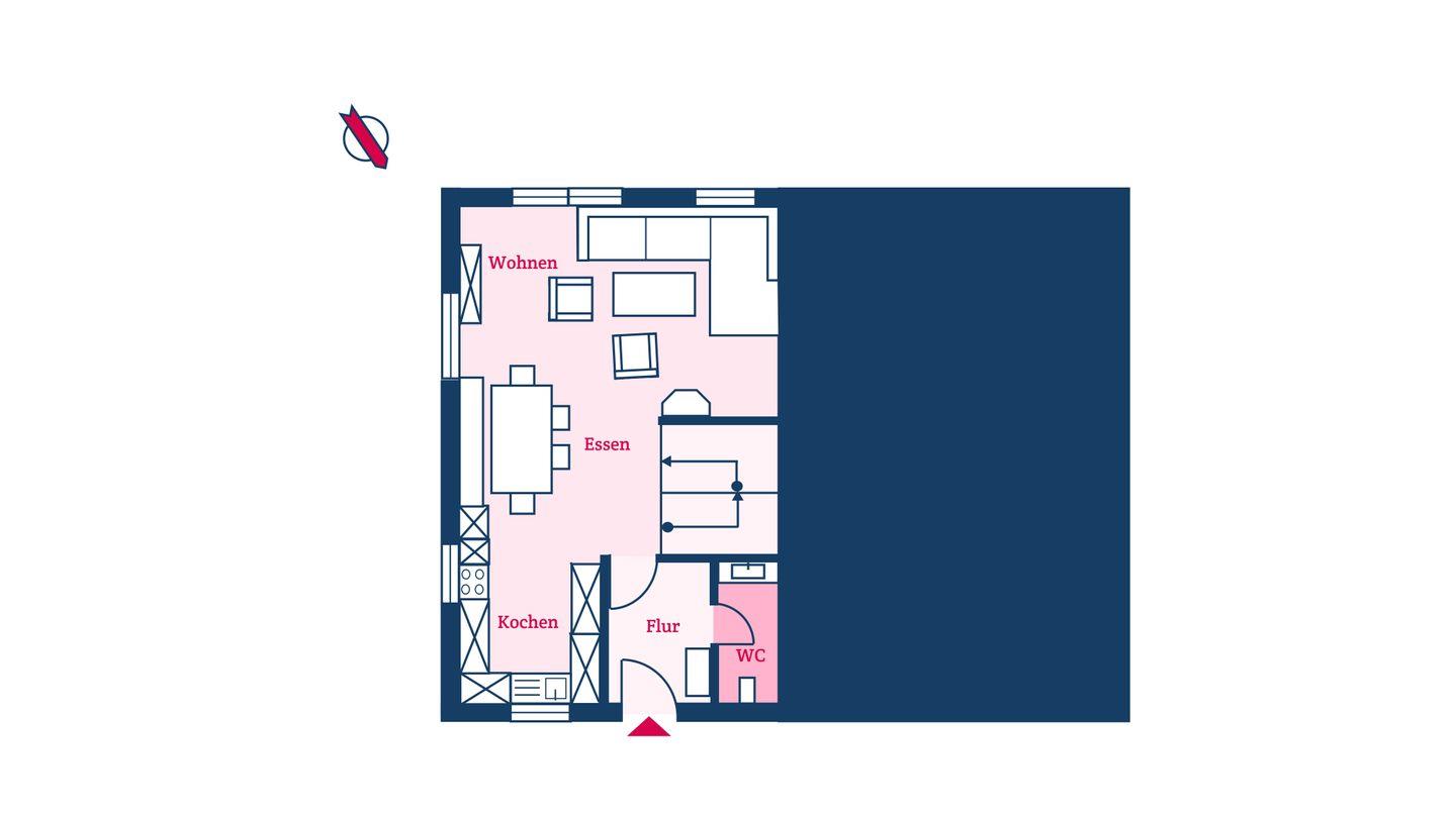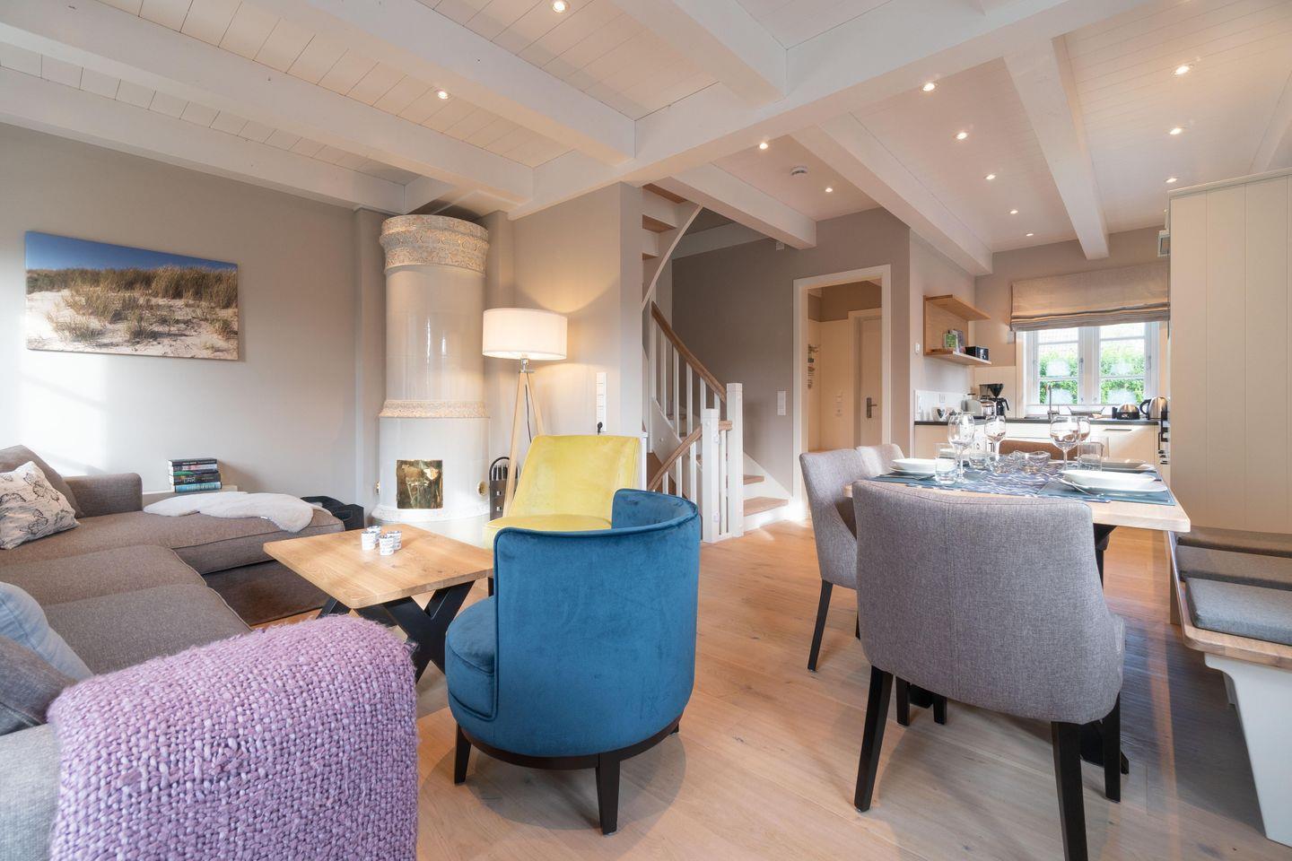 Im Erdgeschoss befinden sich der großzügige Wohn- und Essbereich mit offener Küche sowie ein Gäste-WC. Über den Wohnbereich gelangen Sie auf die Terrasse und in den Garten. Der Original Mylin-Kachelofen sorgt auch an kühleren Tagen für eine angenehme Atmosphäre. Die Möbel des Hauses und die Kücheneinrichtung wurden von einer hiesigen Tischlerei maßgefertigt.