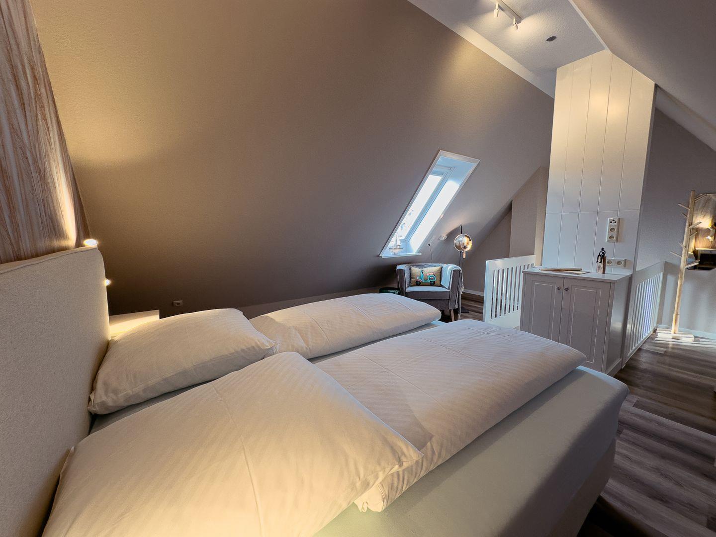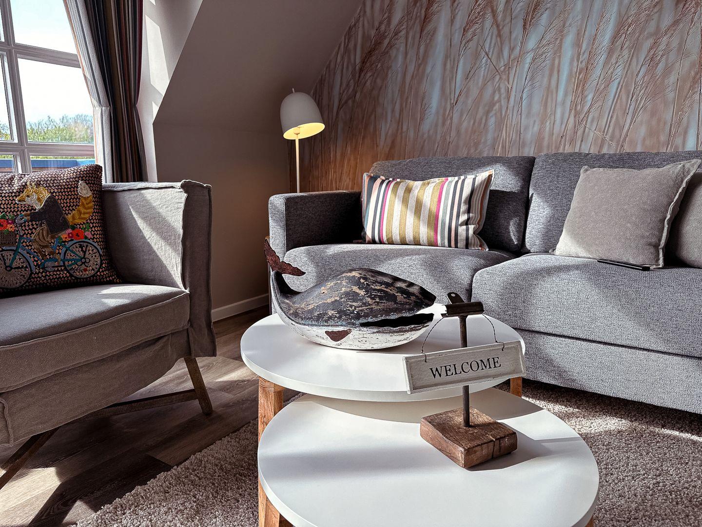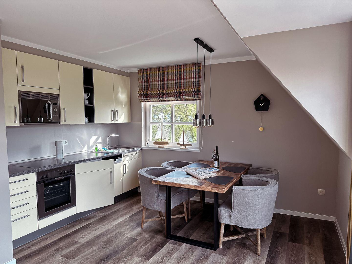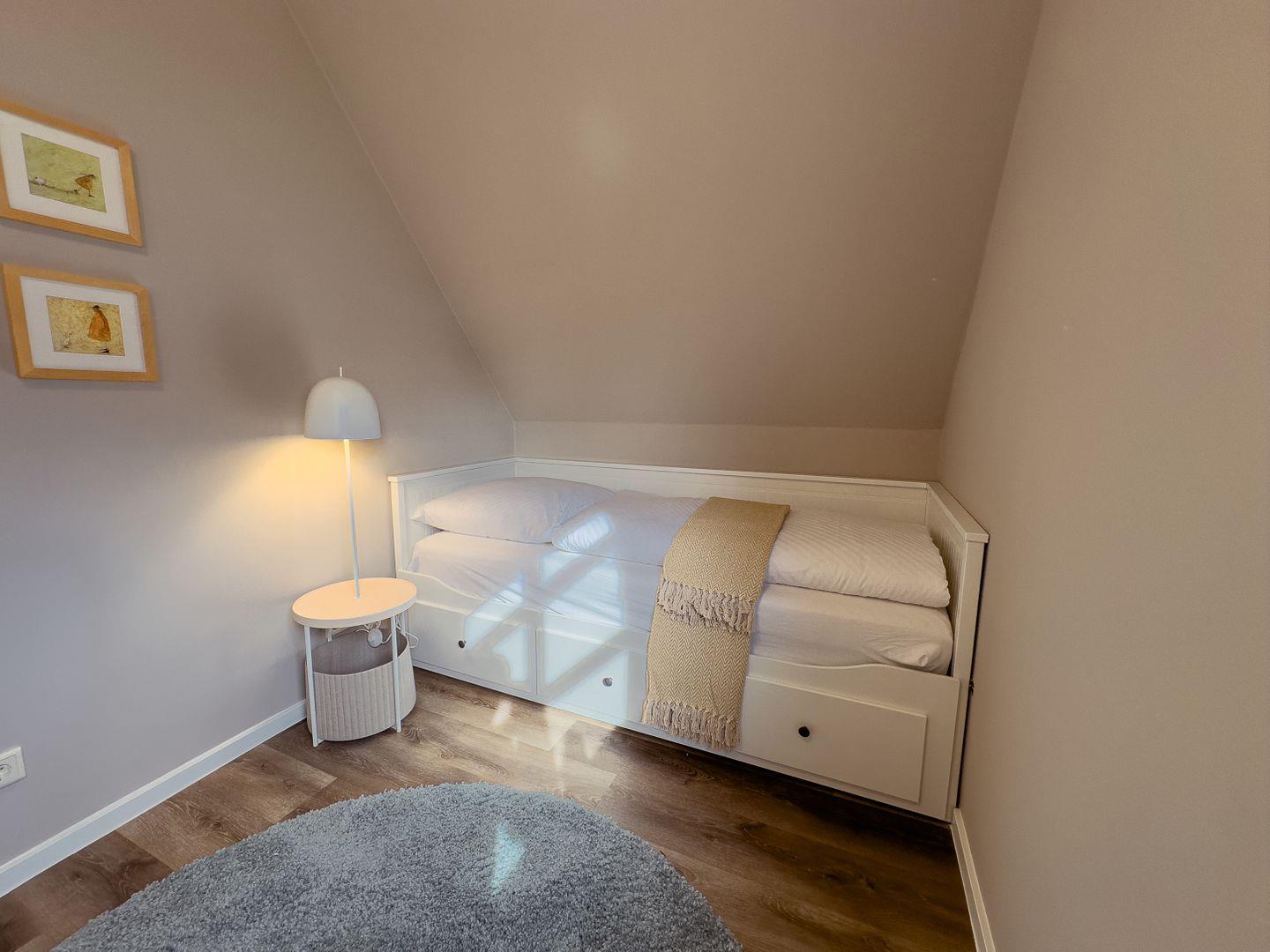 Die Obergeschosswohnung verfügt über einen Wohn- und Essbereich mit offener Küche, zwei Schlafzimmer - eines mit einem Doppelbett, eines mit einem Einzelbett und einem Ausziehbett - und ein Duschbad. Über den Wohnbereich gelangen Sie direkt auf den eigenen Balkon. Die Nutzung des Gartens ist den Gästen der Erdgeschosswohnungen vorbehalten.