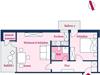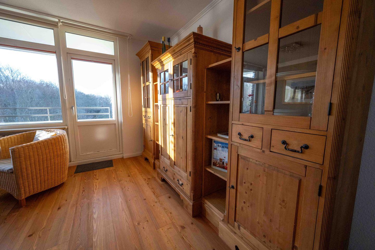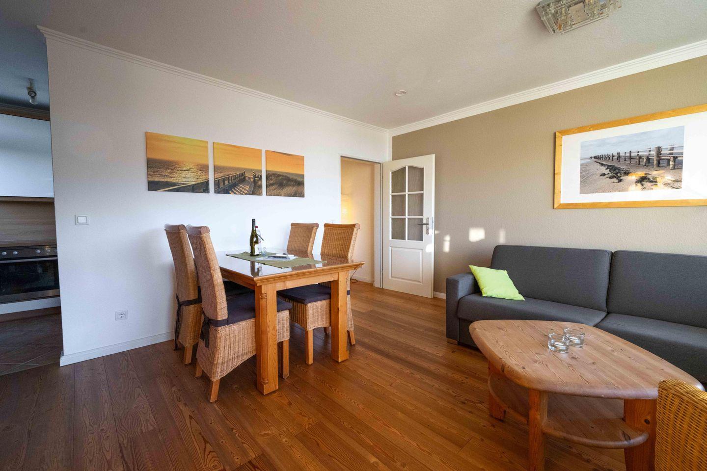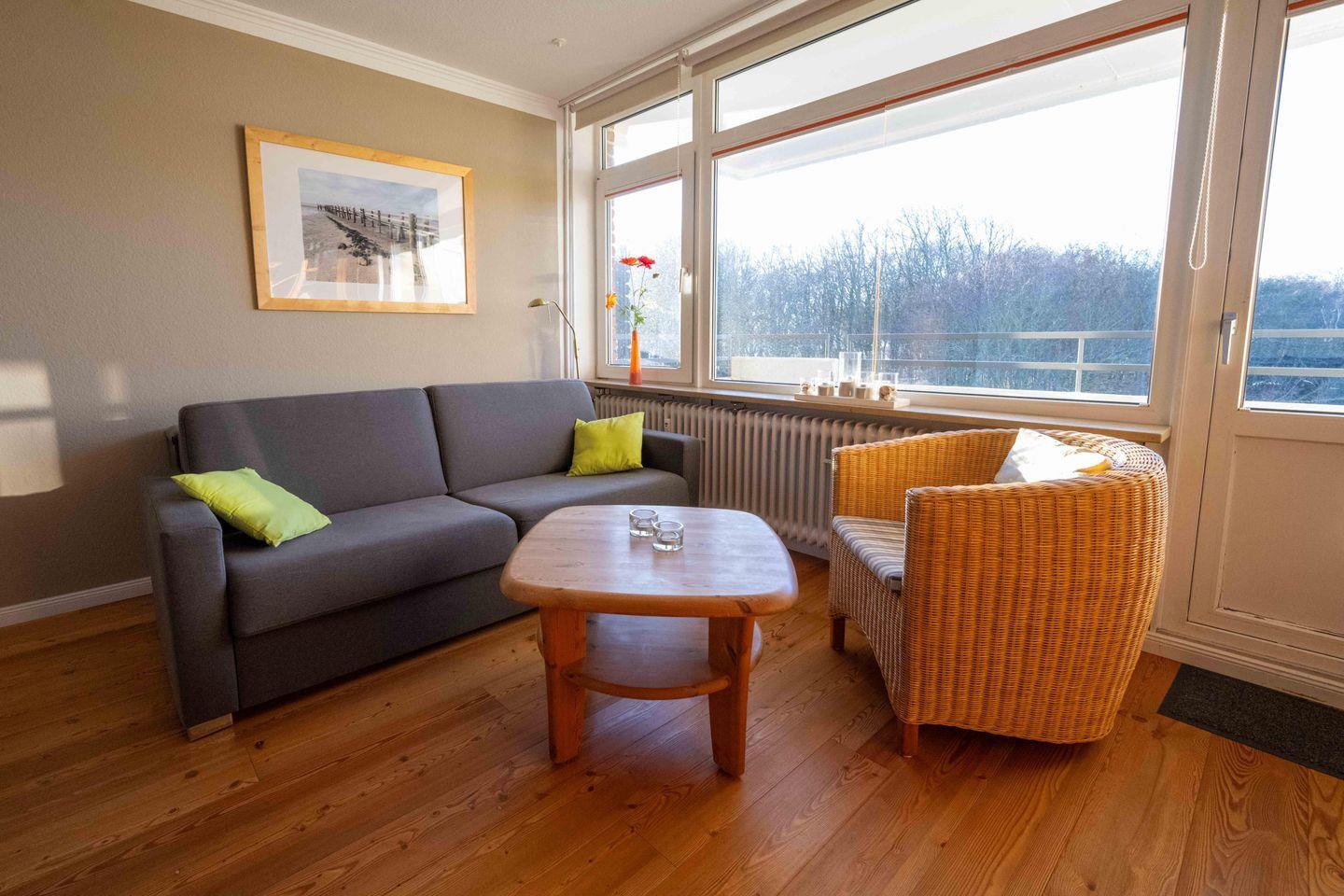 Die Ferienwohnung ist im dritten Obergeschoss gelegen und verfügt über einen großzügigen Wohn- und Essbereich mit offener Küche, ein Duschbad und zwei Balkone. Über den Wohnbereich gelangen Sie auf den Westbalkon, welcher Ihnen einen eingeschränkten Blick auf die Nordsee bietet. Den kleinen Nordbalkon mit Blick auf den nahe gelegenen Flugplatz erreichen Sie über das Schlafzimmer.