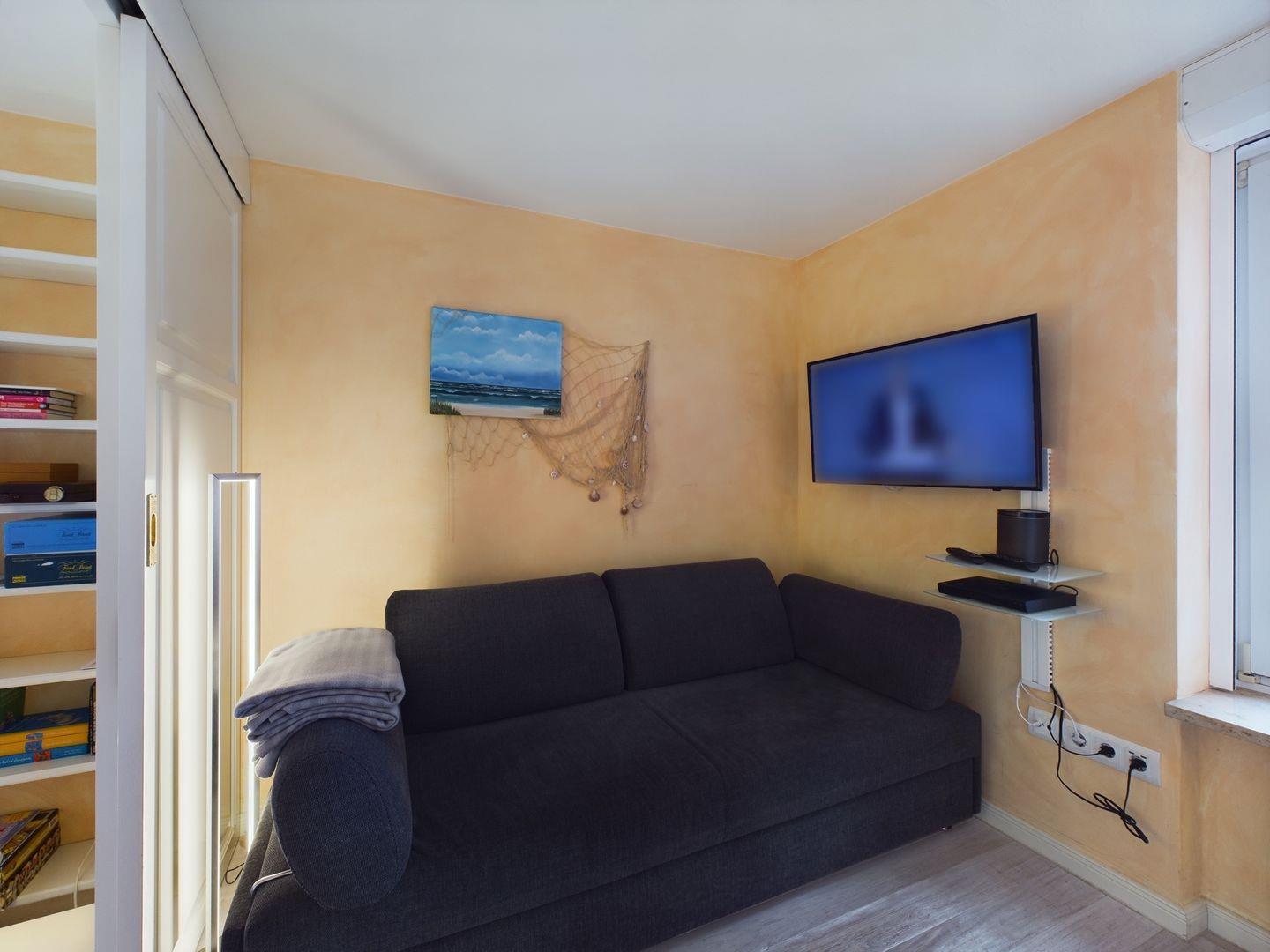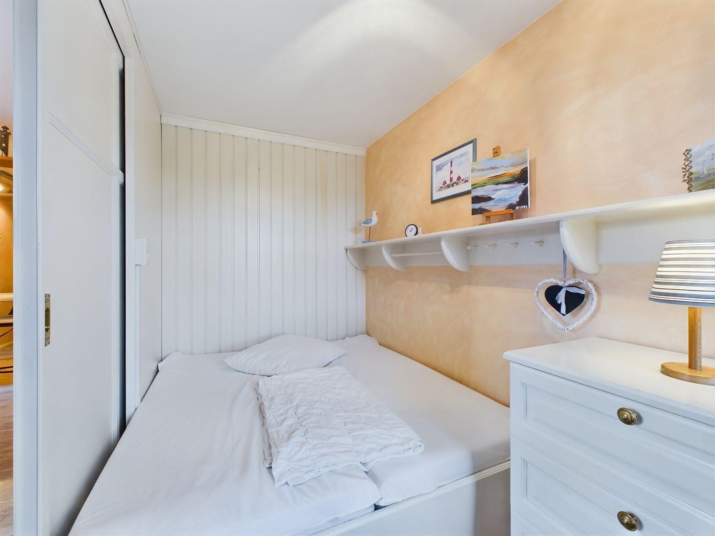 Das helle Appartement verfügt über ein geräumiges Wohn-Esszimmer, ein Schlafzimmer mit Doppelbett (180*200cm) und über eine Stufe erreichbar, liegt auf der Empore das komfortable Wohnzimmer mit einer ausziehbaren Schlafcouch. Die moderne Ausstattung umfasst WLAN, einen Flachbildfernseher mit Blu-ray Player und eine Sonos-Box. Ein kostenfreier Parkplatz ist direkt am Haus verfügbar. Die Lage in der Nähe des Wyker Südstrands bietet Ruhe und eine direkte Anbindung an die Strandpromenade. Eine Bushaltestelle vor der Tür ermöglicht schnelle Fahrten in die Stadt und zu den Inselattraktionen. Für Ihre Entspannung und den perfekten Strandtag bieten wir Ihnen einen Strandkorb inklusive Strandlaken am Wyker Strand (Abschnitt 28), nur wenige Gehminuten von der Wohnung entfernt. Der Golfplatz ist nur wenige Gehminuten entfernt.