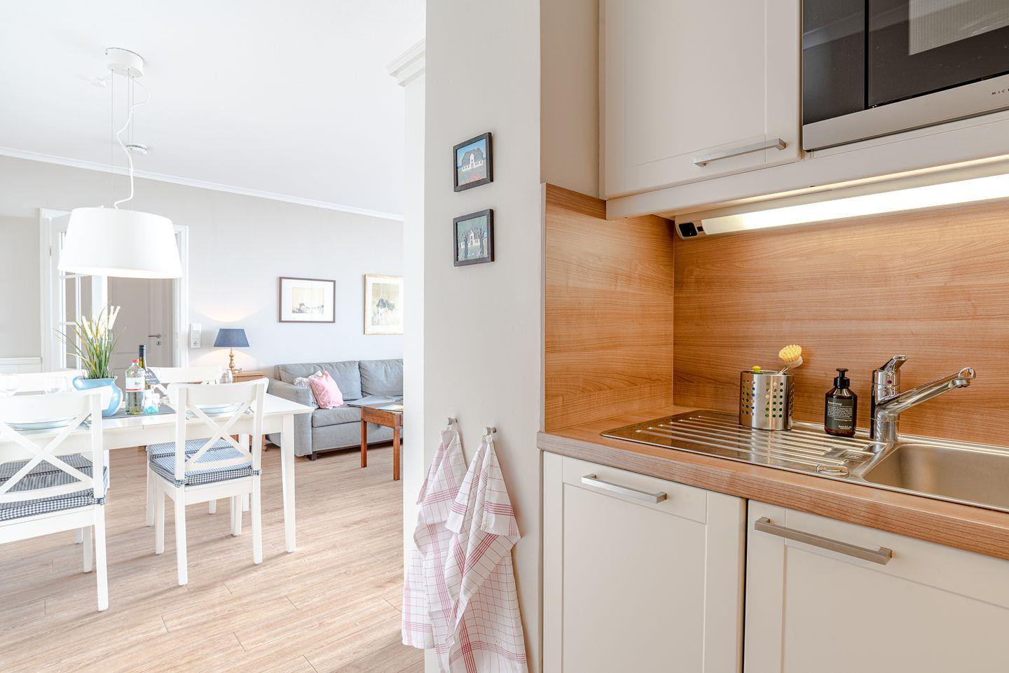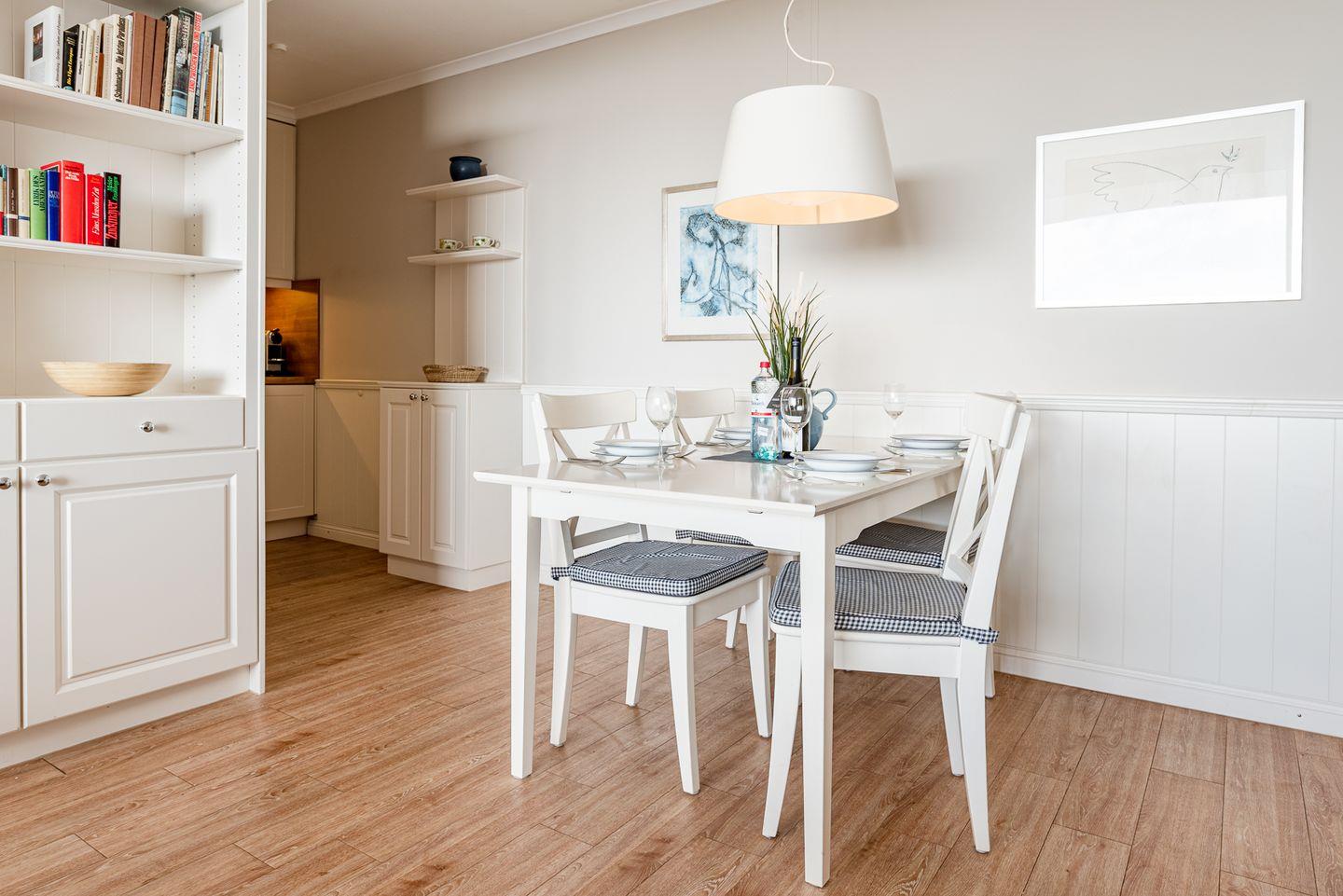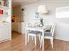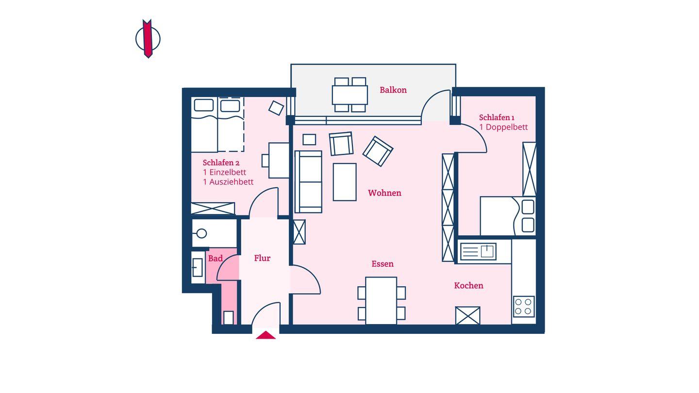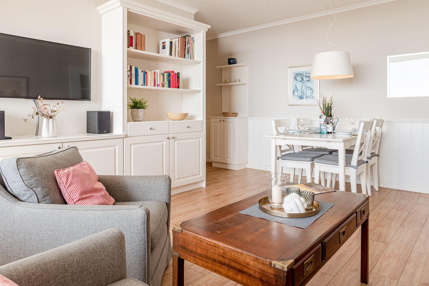 Die Ferienwohnung ist im dritten Obergeschoss gelegen und verfügt über einen großzügigen Wohn- und Essbereich mit offener Küche, zwei Schlafzimmer und ein Duschbad, sowie ein Balkon mit Meerblick. Ein Schlafzimmer ist mit einem Doppelbett ausgestattet, das andere mit einem Einzelbett, welches zu einem Doppelbett ausgezogen werden kann.