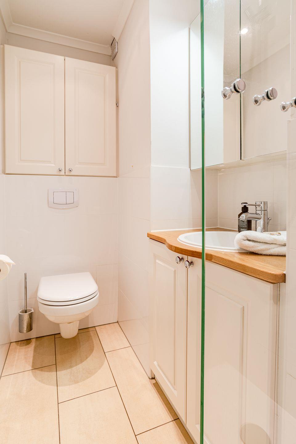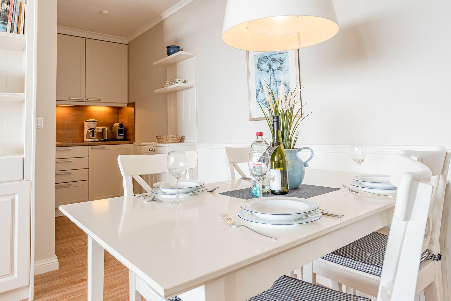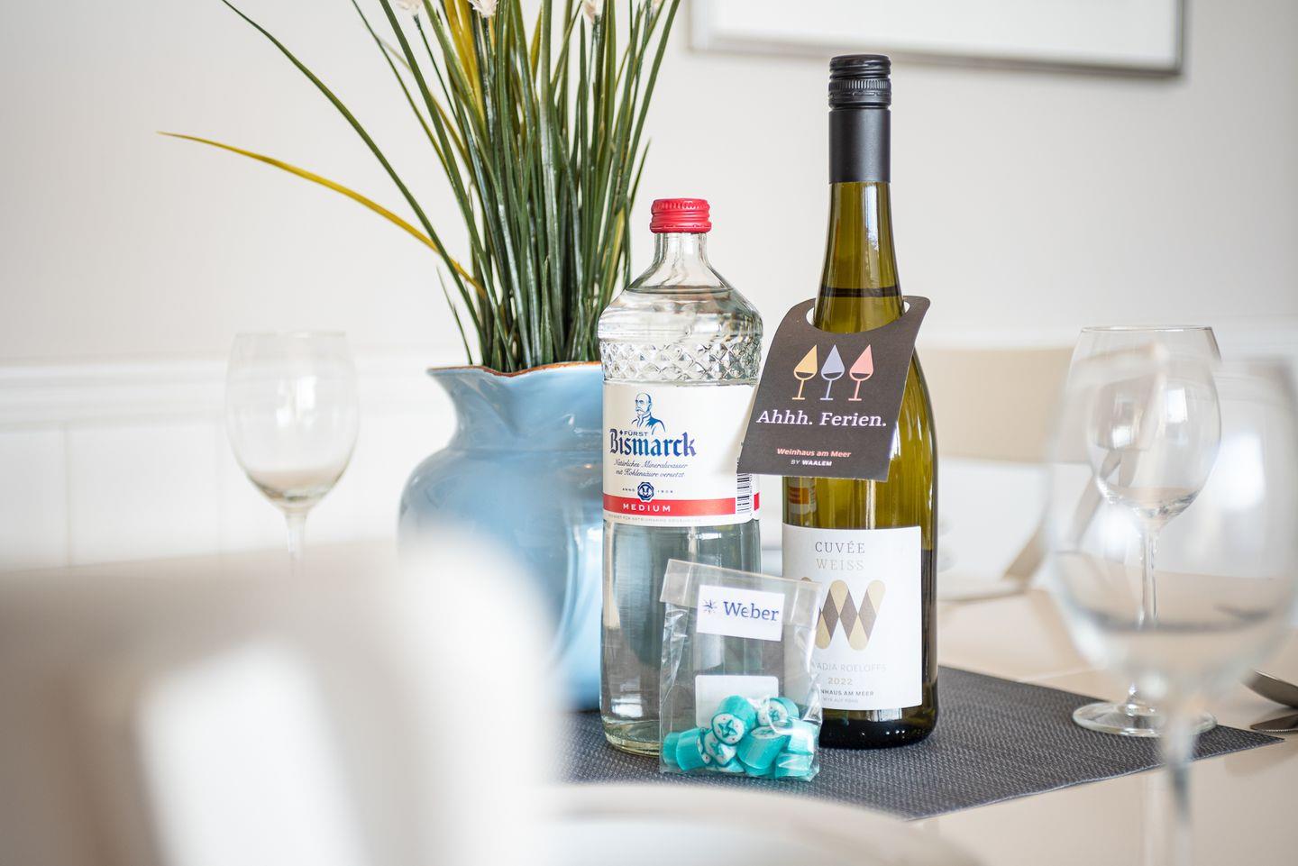 Die Ferienwohnung ist im dritten Obergeschoss gelegen und verfügt über einen großzügigen Wohn- und Essbereich mit offener Küche, zwei Schlafzimmer und ein Duschbad, sowie ein Balkon mit Meerblick. Ein Schlafzimmer ist mit einem Doppelbett ausgestattet, das andere mit einem Einzelbett, welches zu einem Doppelbett ausgezogen werden kann.