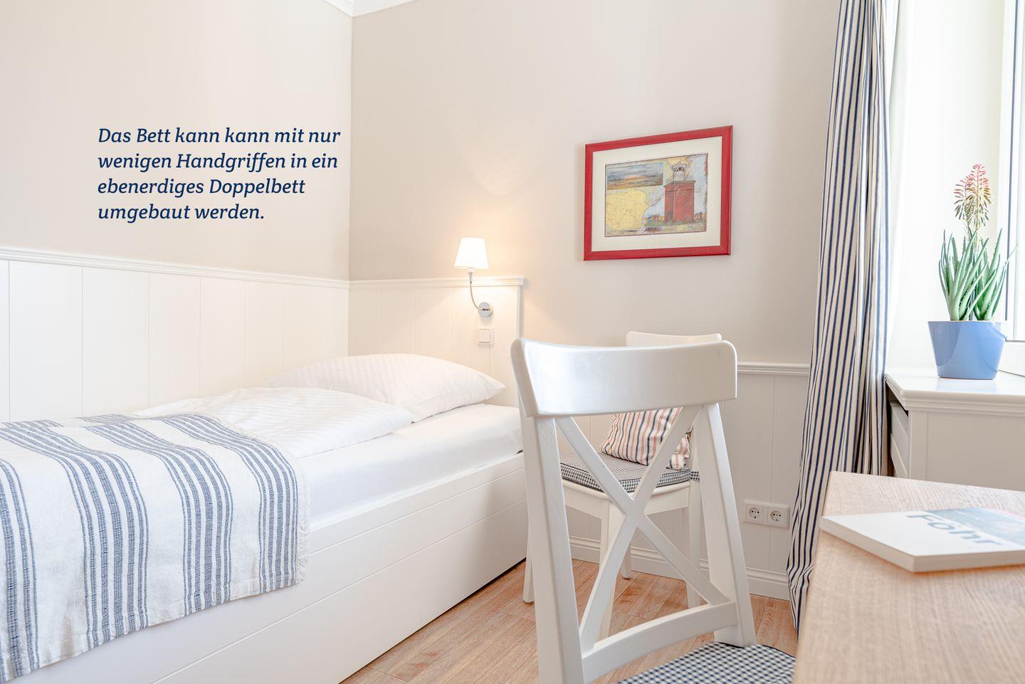 Die Ferienwohnung 25 im Haus Uthlande wurde im Jahr 2021 aufwendig renoviert und verfügt über 2 Schlafzimmer und 1 Bad und bietet somit komfortabel Platz für bis zu 4 Personen zuzüglich einer Kleinkinderaufbettung.