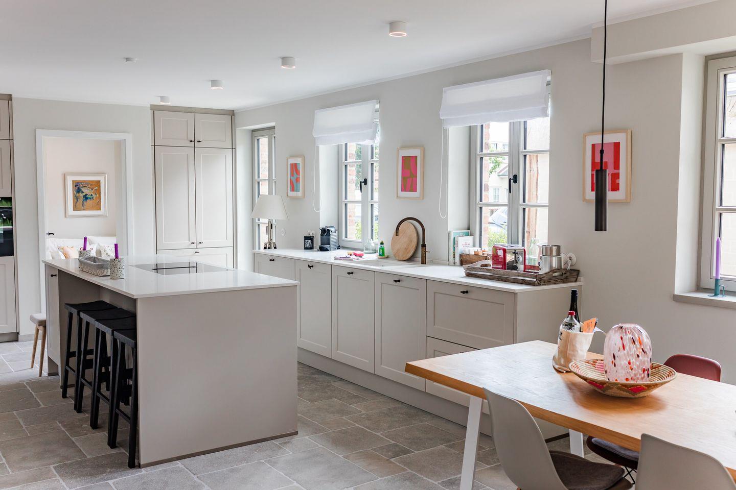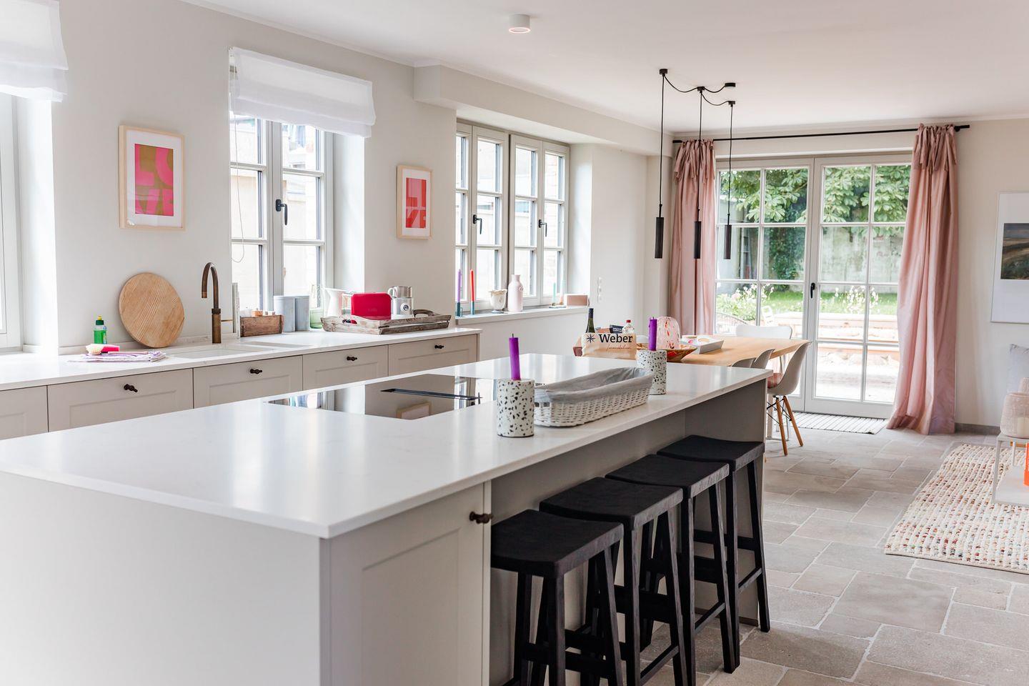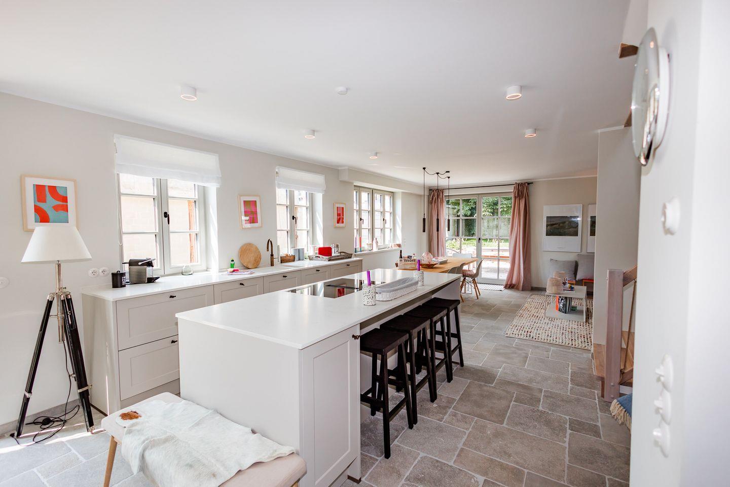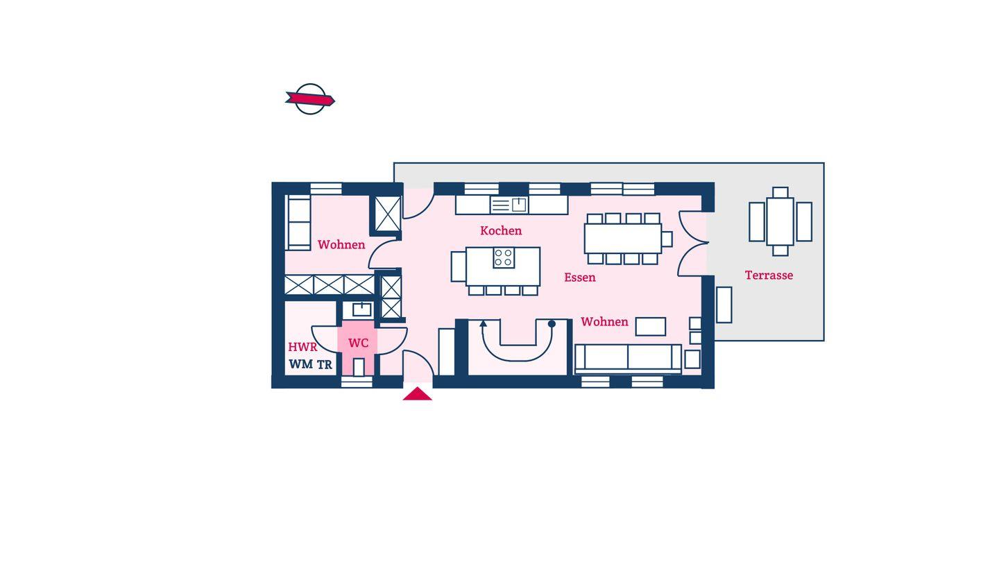 Im Erdgeschoss befinden sich der großzügige Wohn- und Essbereich mit offener Küche, ein separates Wohnzimmer, ein Gäste-WC und ein Hauswirtschaftsraum mit Waschmaschine und Trockner. Über die beiden Wohnzimmer gelangen Sie auf die Terrasse und in den eigenen Garten. Die Küche ist mit hochwertigen Markengeräten ausgestattet, das Herzstück bildet die Kochinsel mit integriertem Tresen.