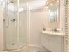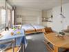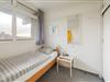 Das Schlafzimmer mit einem Einzelbett schafft eine gemütliche Atmosphäre und eine ruhige Rückzugsmöglichkeit. Im Wohnzimmer erwartet Sie ein komfortables Schrankbett, das zusätzlichen Platz für zwei Personen bietet. Hier können Sie sich entspannen und den Blick auf das Meer durch die Fenster genießen.