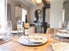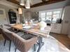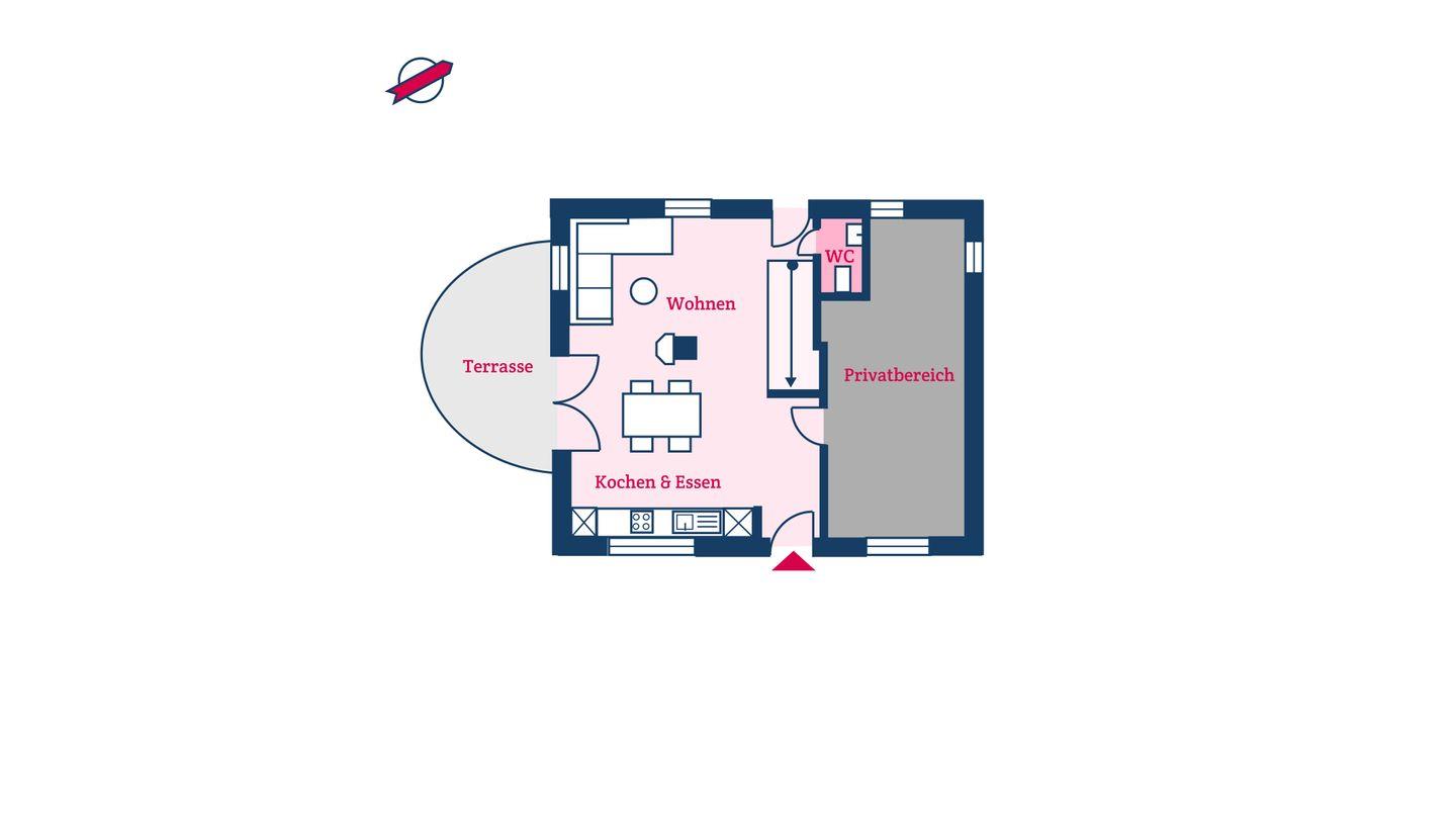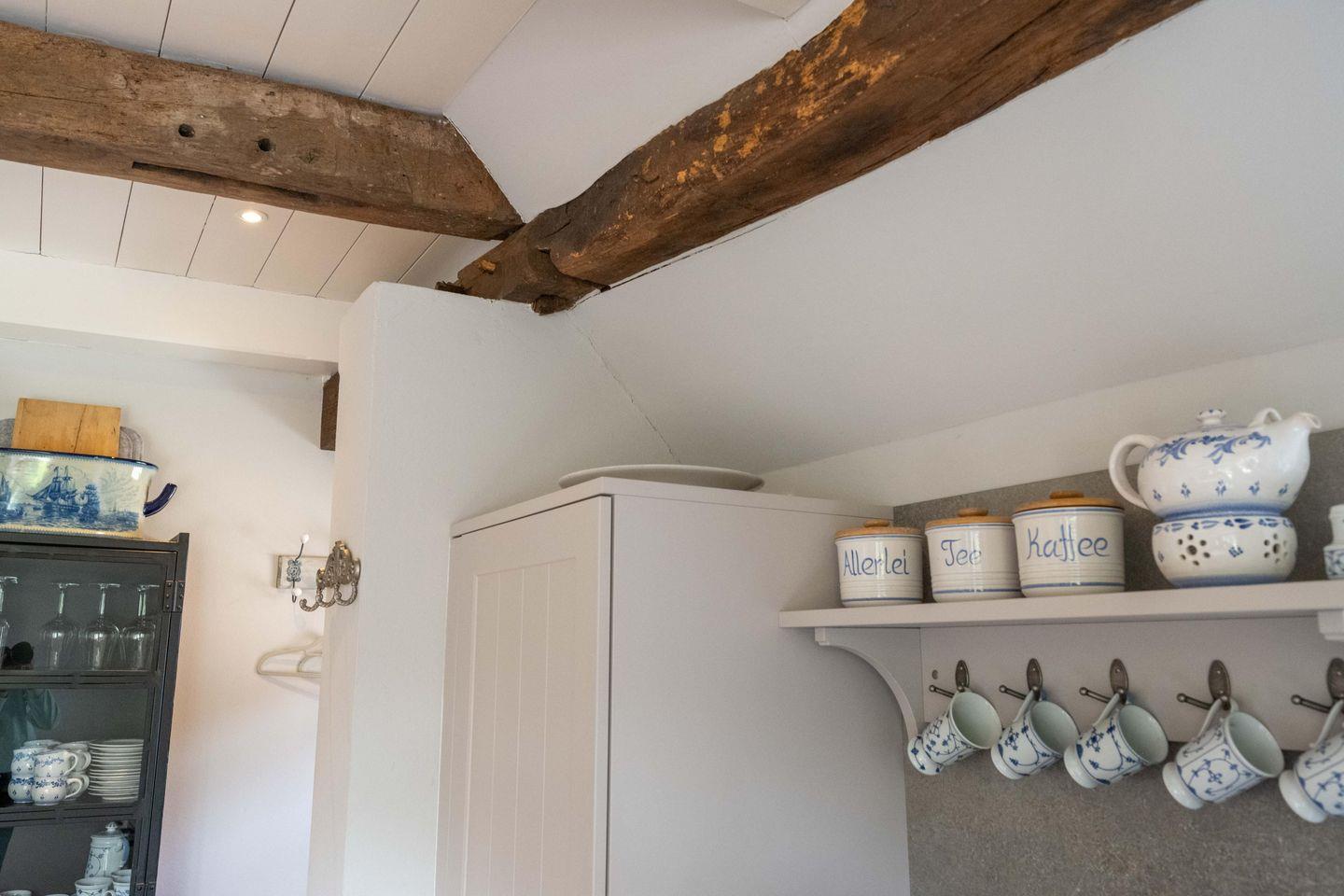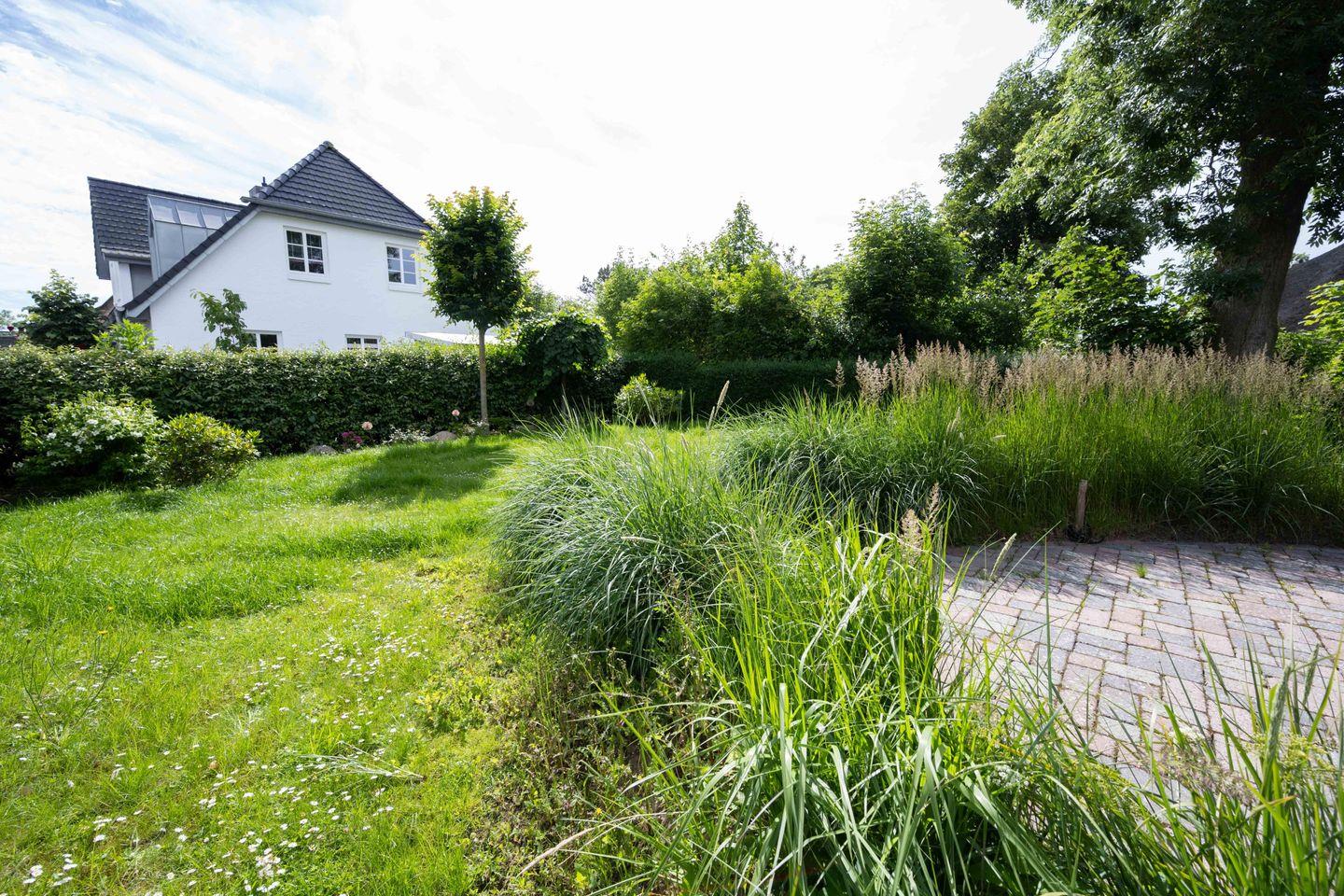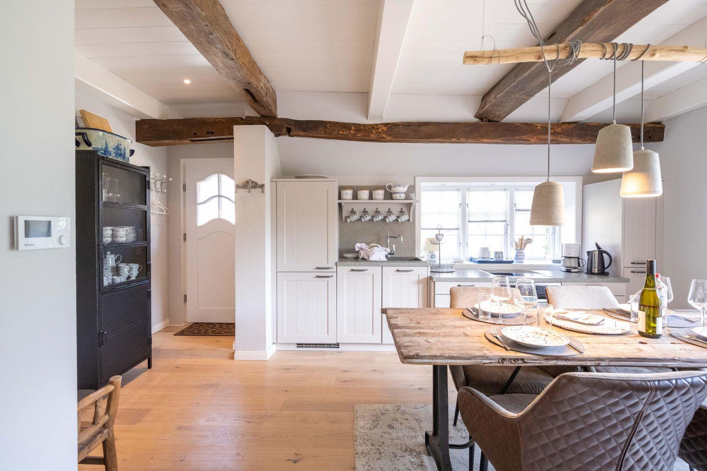 Im Erdgeschoss des freistehenden Reetdachhauses befinden sich der großzügige Wohn- und Essbereich mit offener Küche sowie ein Gäste-WC. Der Kamin im Wohnbereich sorgt auch an kühleren Tagen für eine angenehme Atmosphäre. Über den Wohnbereich gelangen Sie direkt auf die Südwestterrasse und in den eigenen Garten.