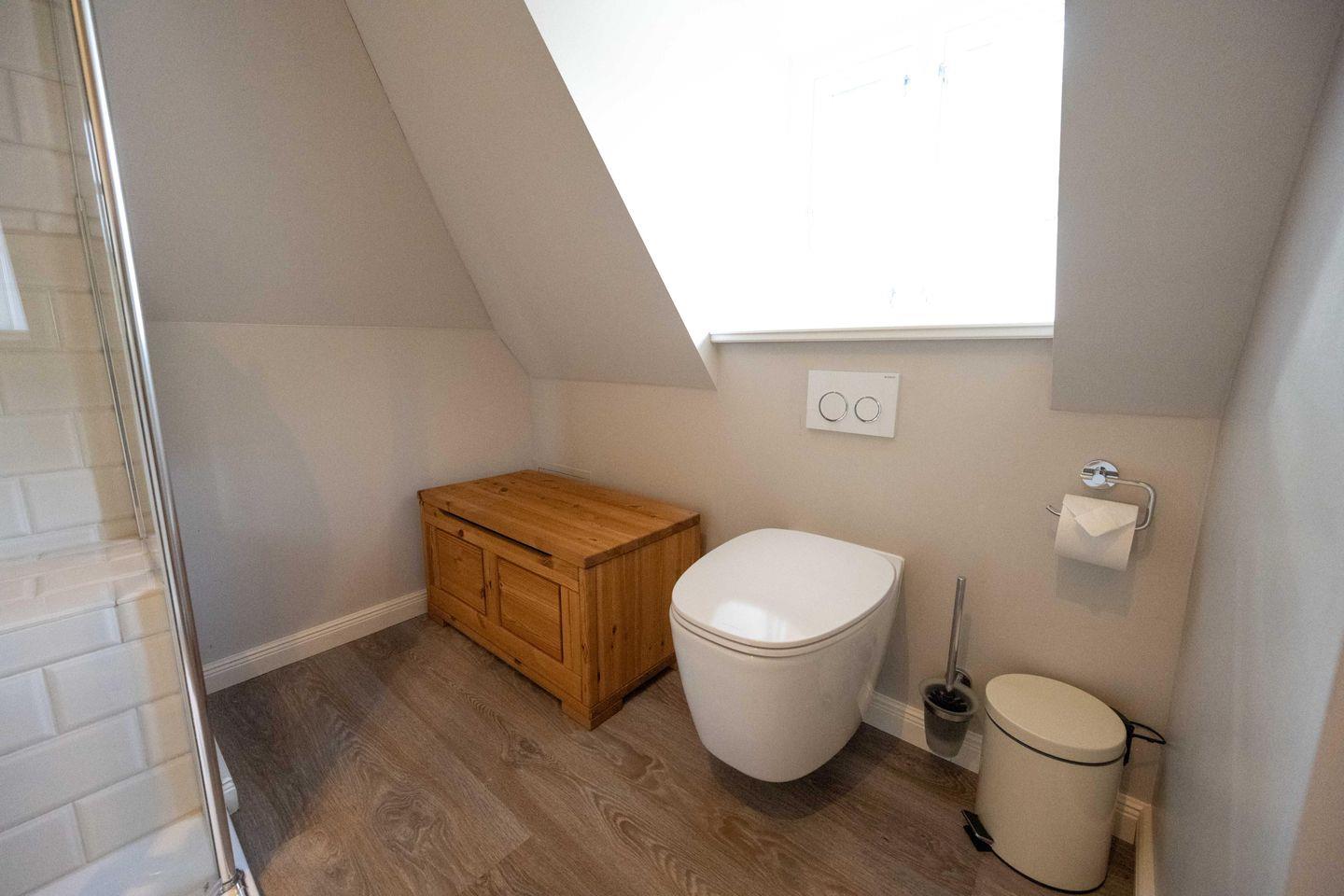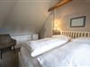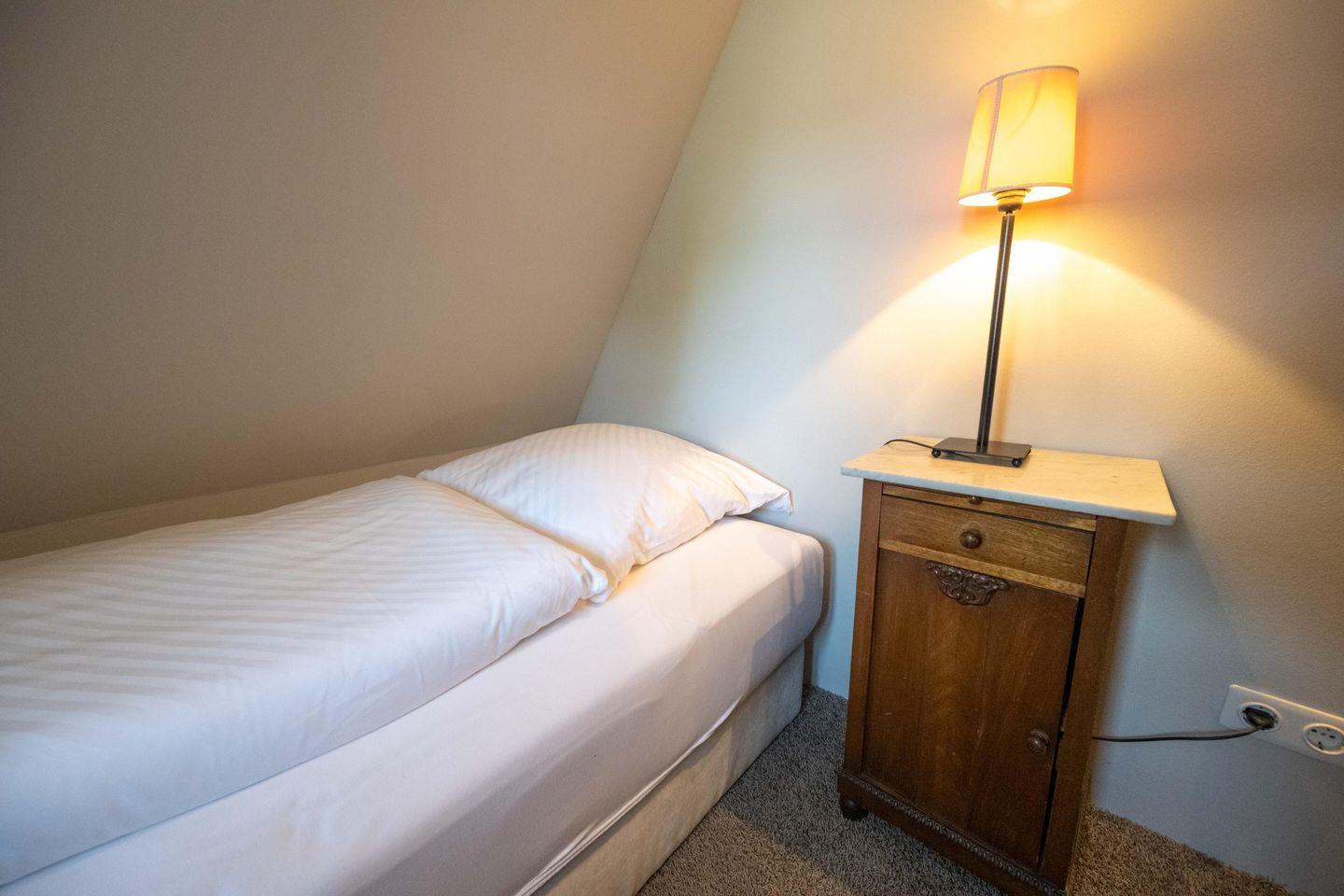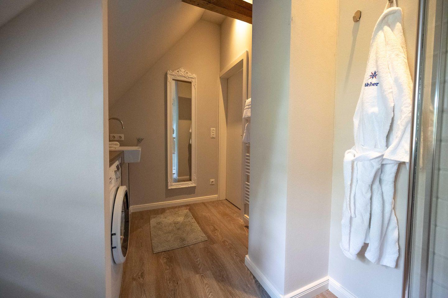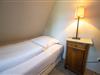 Im Obergeschoss sind die beiden Schlafzimmer sowie das Duschbad mit Waschmaschine gelegen. Das erste Schlafzimmer ist mit einem Doppelbett ausgestattet. Das zweite Schlafzimmer verfügt über zwei sehr komfortable Bodenmatratzen, die bei einer Buchung mit vier Personen nebeneinander und bei einer Buchung mit drei Personen übereinander gelegt werden.