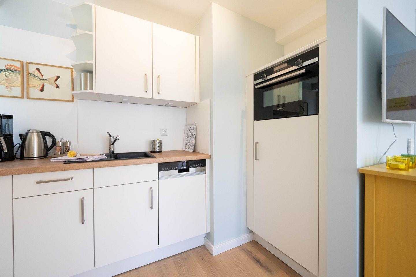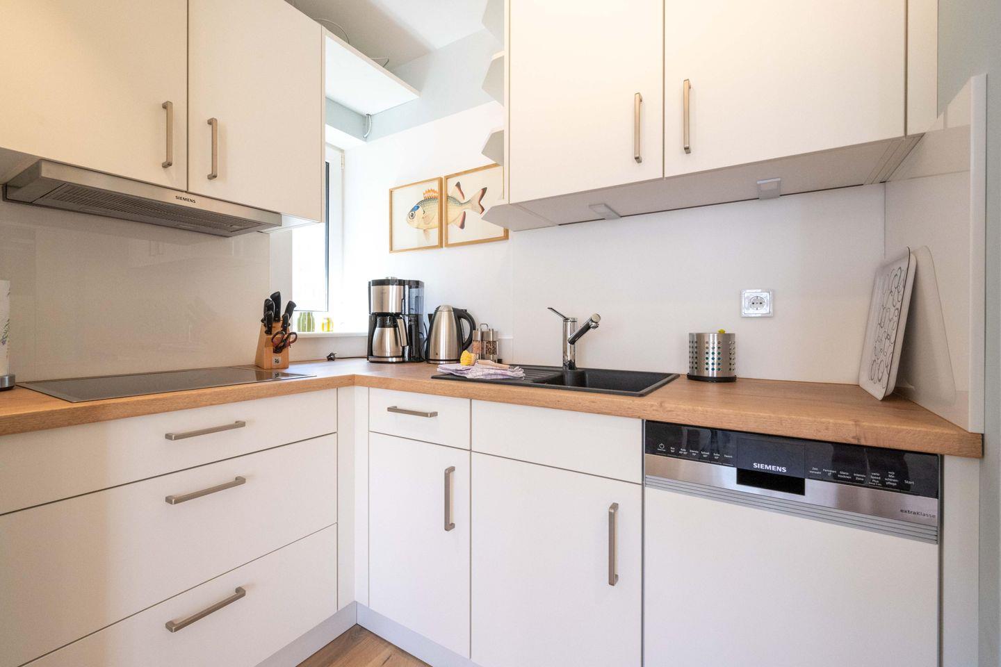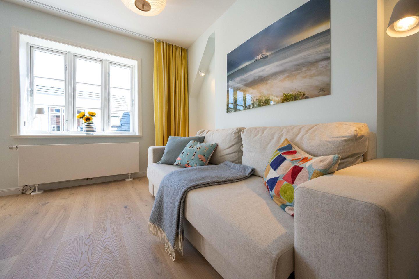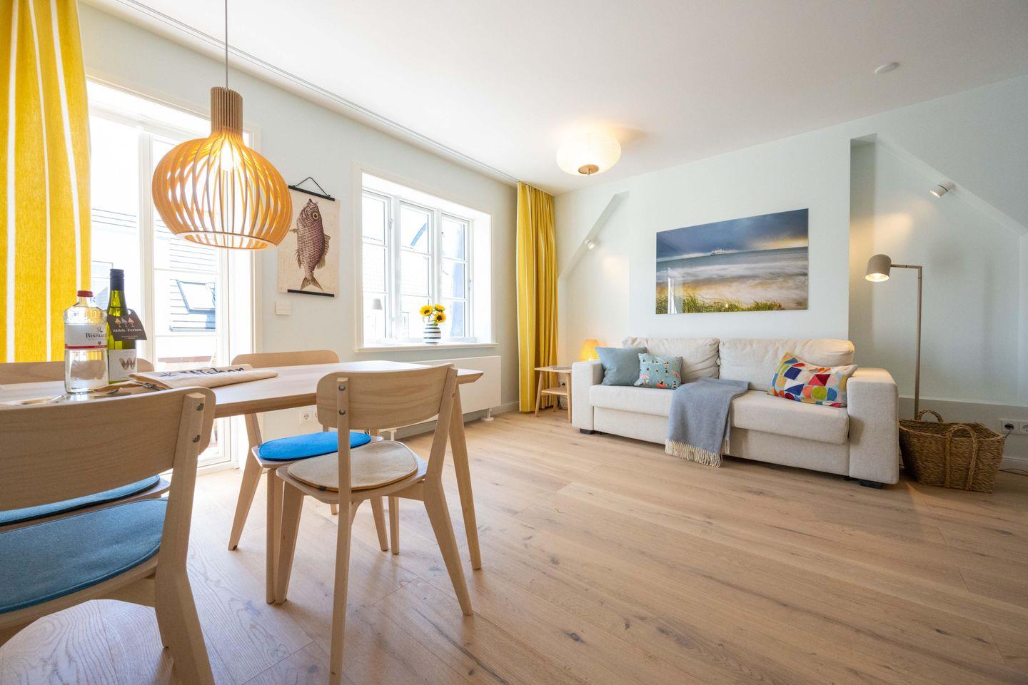 Die Ferienwohnung ist komplett im Obergeschoss gelegen und verfügt über einen Wohn- und Essbereich mit offener Küche, ein Schlafzimmer mit Doppelbett und ein Bad mit Raindance-Dusche. Über den Wohnbereich gelangen Sie auf den eigenen Balkon, der zur Promenade ausgerichtet ist. Ältere Kinder finden im Wohnraum einen gemütlichen Schlafplatz: Die große Couch lässt sich zu einem Bett ausklappen. Zu den Gemeinschaftsbereichen des Hauses zählen eine eigene Sauna, sowie ein Fahrradunterstand mit E-Bike-Ladestationen im Innenhof.