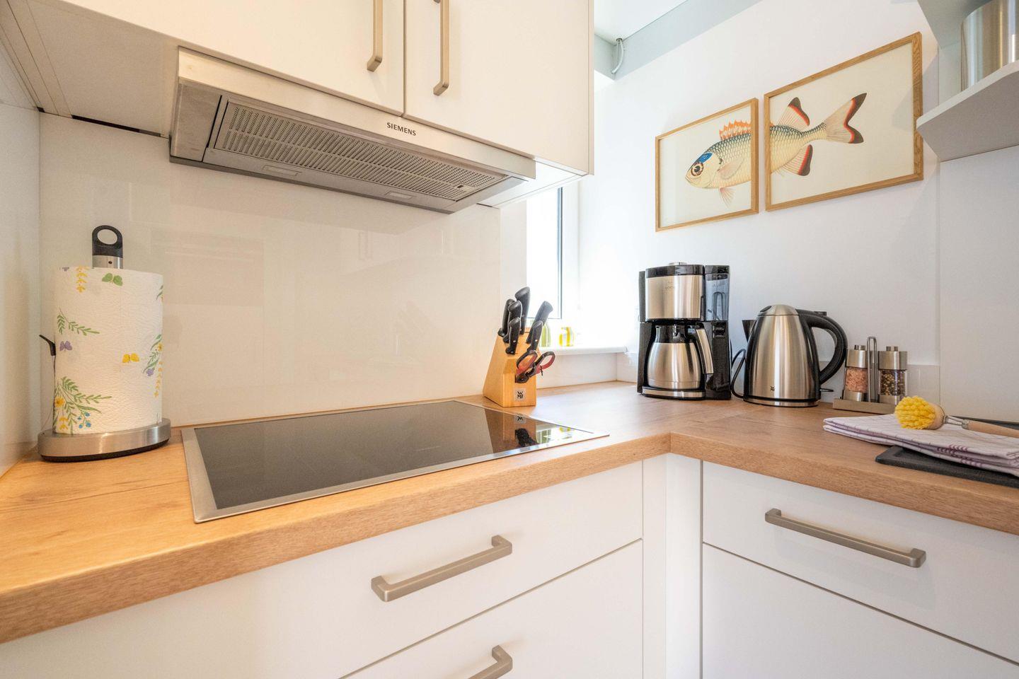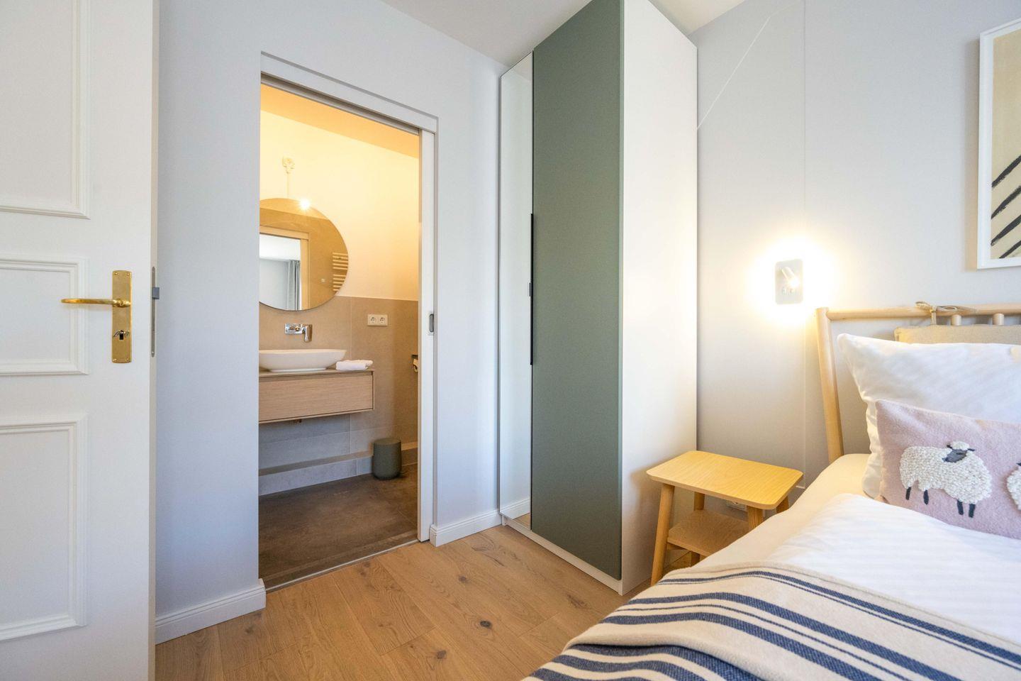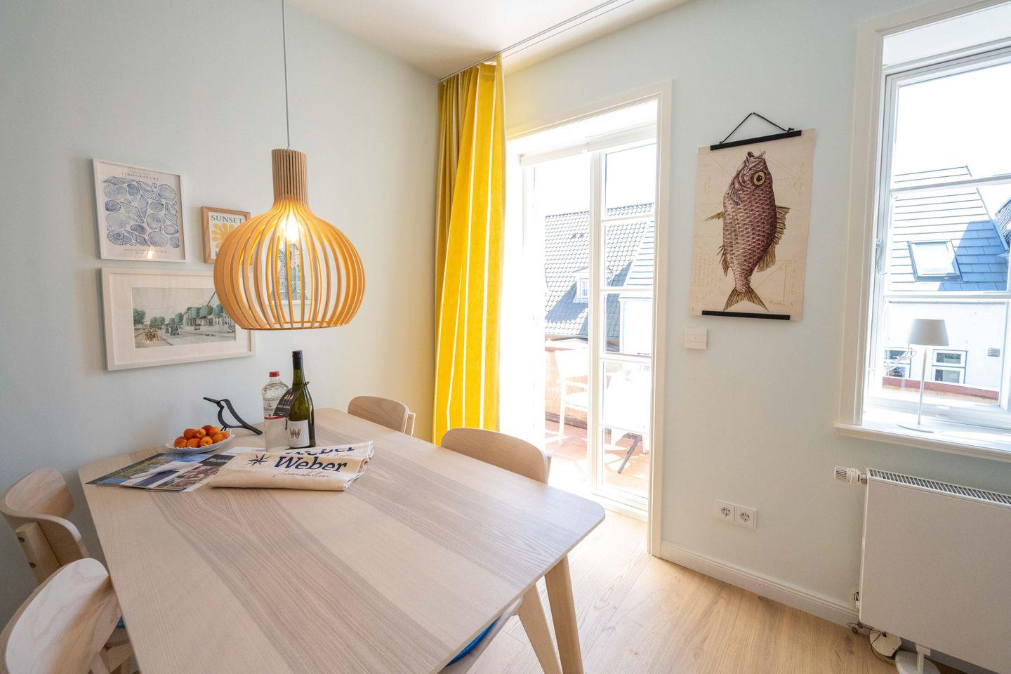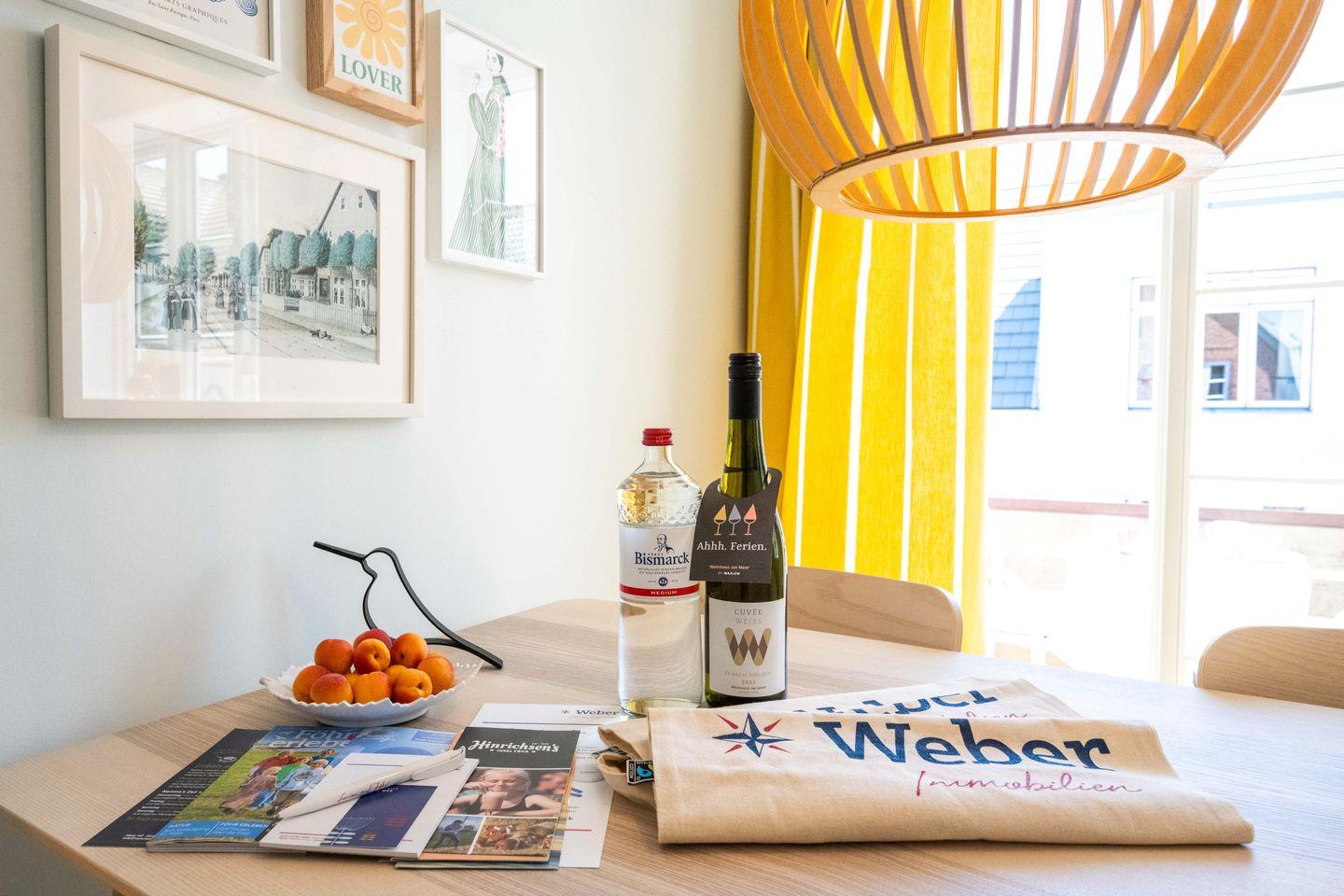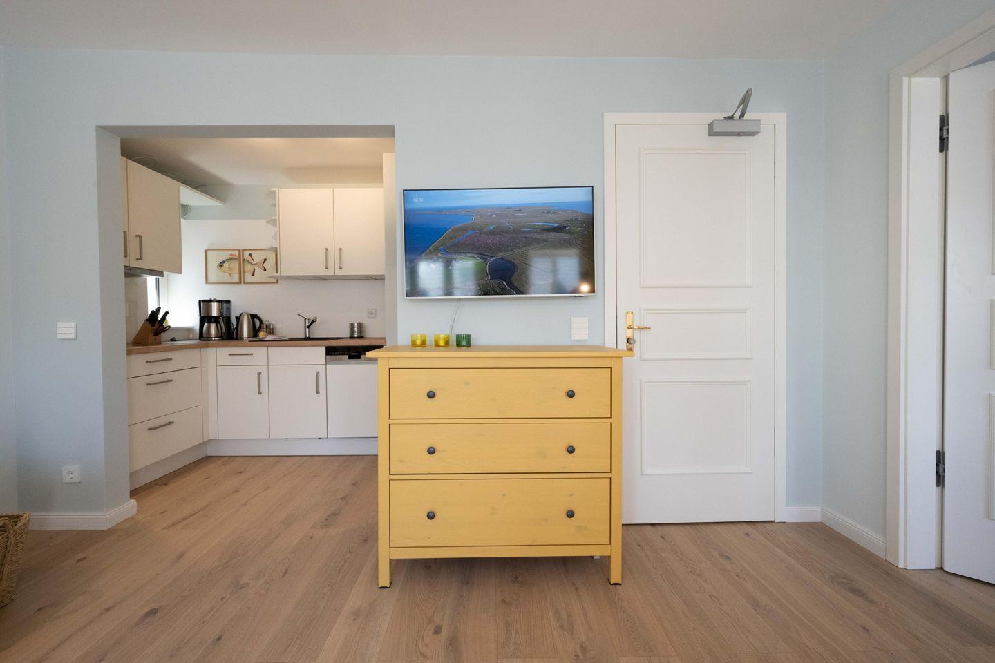 Die Ferienwohnung ist komplett im Obergeschoss gelegen und verfügt über einen Wohn- und Essbereich mit offener Küche, ein Schlafzimmer mit Doppelbett und ein Bad mit Raindance-Dusche. Über den Wohnbereich gelangen Sie auf den eigenen Balkon, der zur Promenade ausgerichtet ist. Ältere Kinder finden im Wohnraum einen gemütlichen Schlafplatz: Die große Couch lässt sich zu einem Bett ausklappen. Zu den Gemeinschaftsbereichen des Hauses zählen eine eigene Sauna, sowie ein Fahrradunterstand mit E-Bike-Ladestationen im Innenhof.
