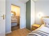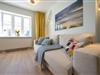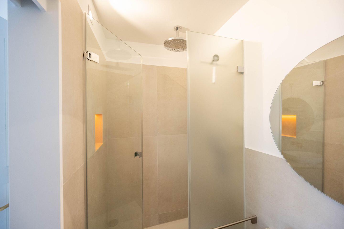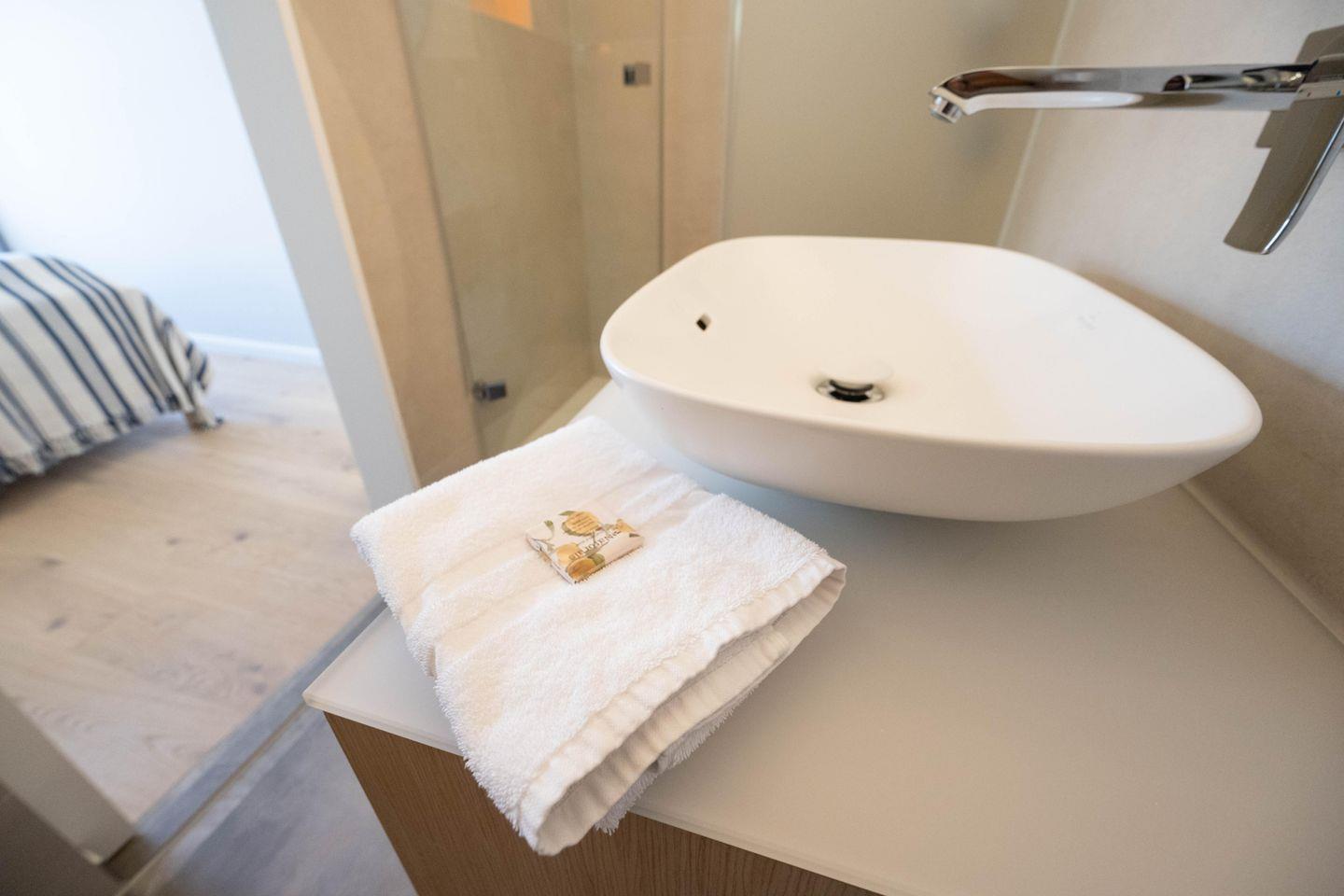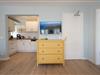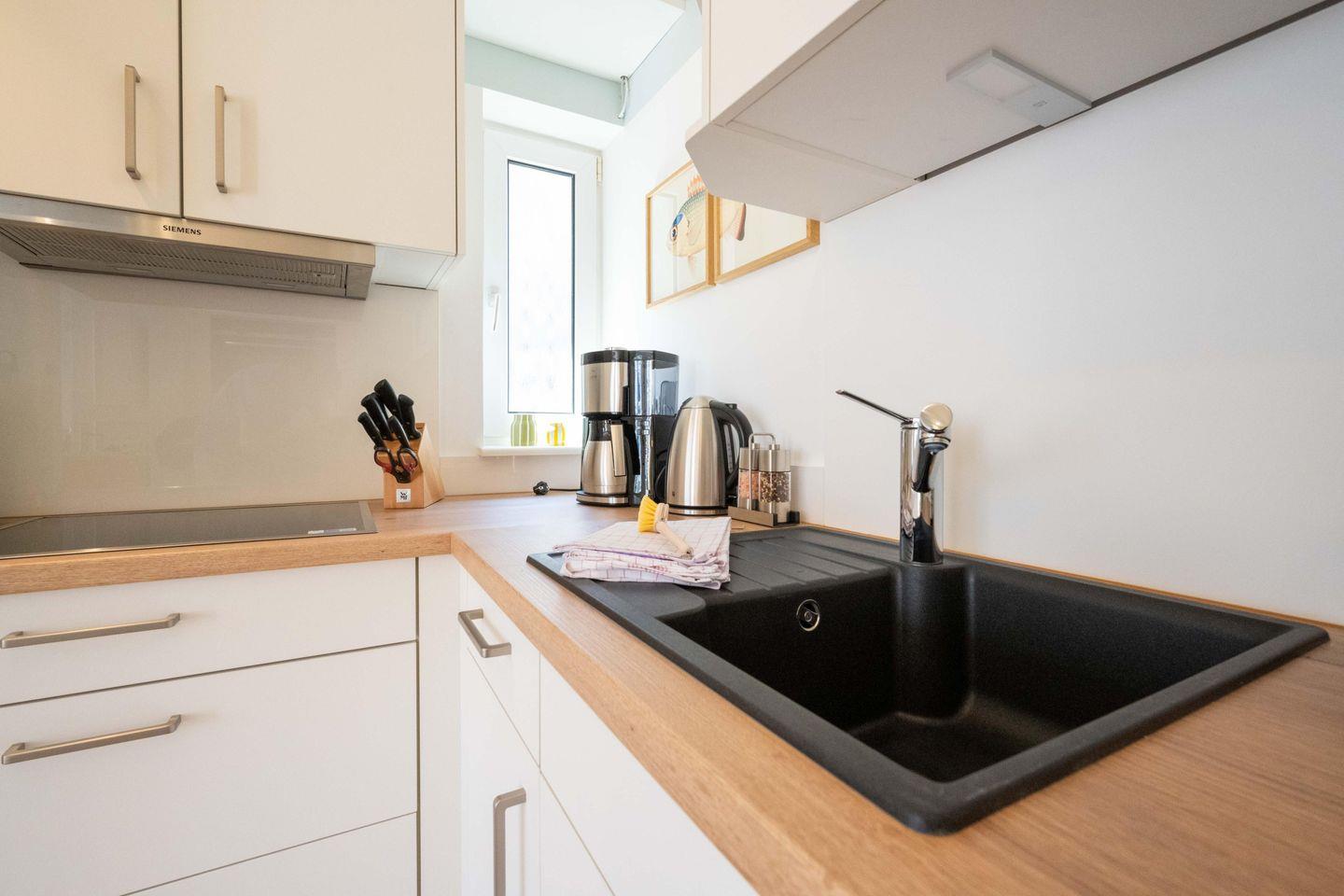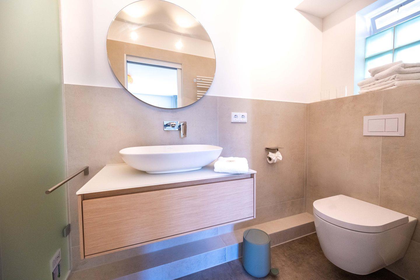 Die Ferienwohnung ist komplett im Obergeschoss gelegen und verfügt über einen Wohn- und Essbereich mit offener Küche, ein Schlafzimmer mit Doppelbett und ein Bad mit Raindance-Dusche. Über den Wohnbereich gelangen Sie auf den eigenen Balkon, der zur Promenade ausgerichtet ist. Ältere Kinder finden im Wohnraum einen gemütlichen Schlafplatz: Die große Couch lässt sich zu einem Bett ausklappen. Zu den Gemeinschaftsbereichen des Hauses zählen eine eigene Sauna, sowie ein Fahrradunterstand mit E-Bike-Ladestationen im Innenhof.