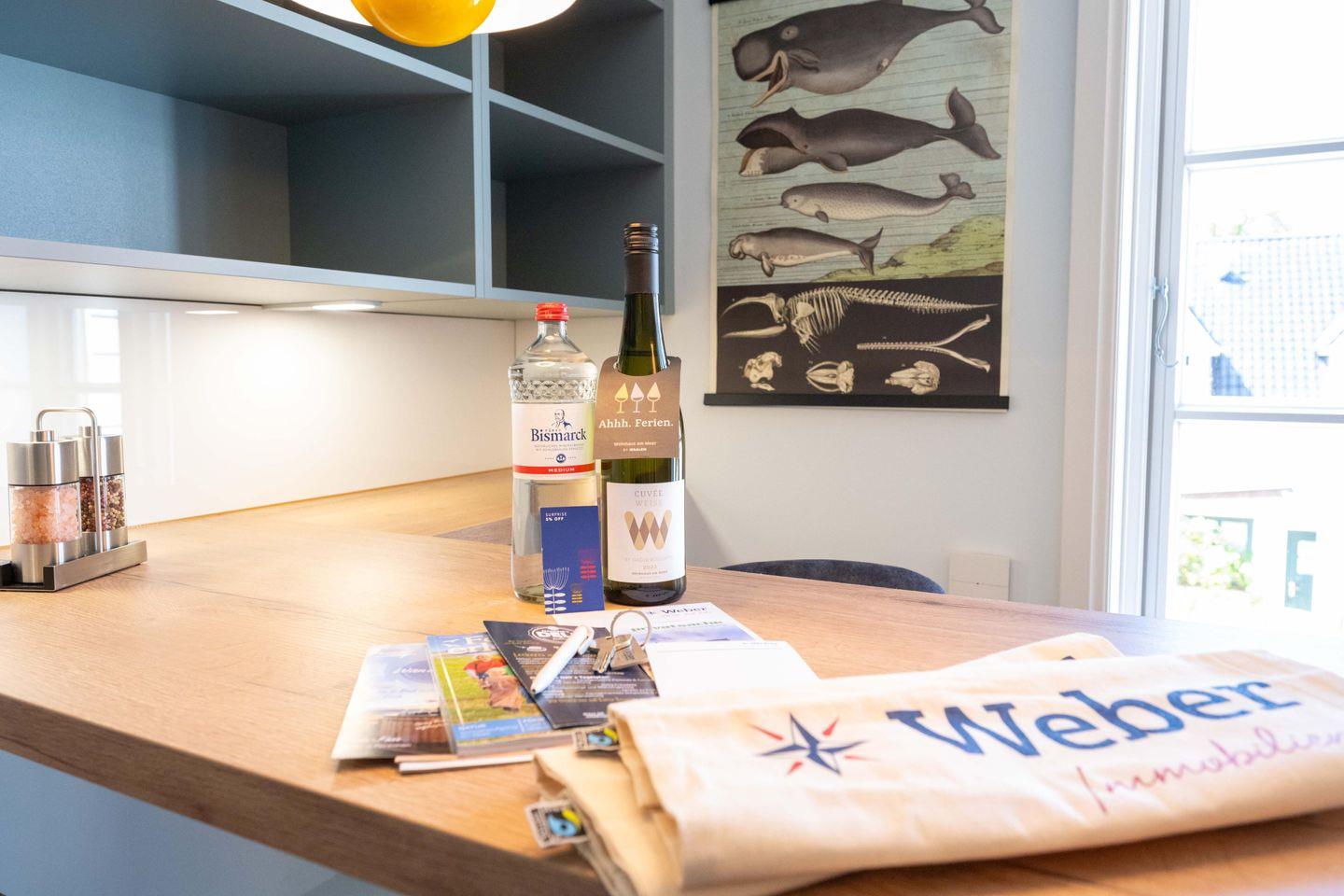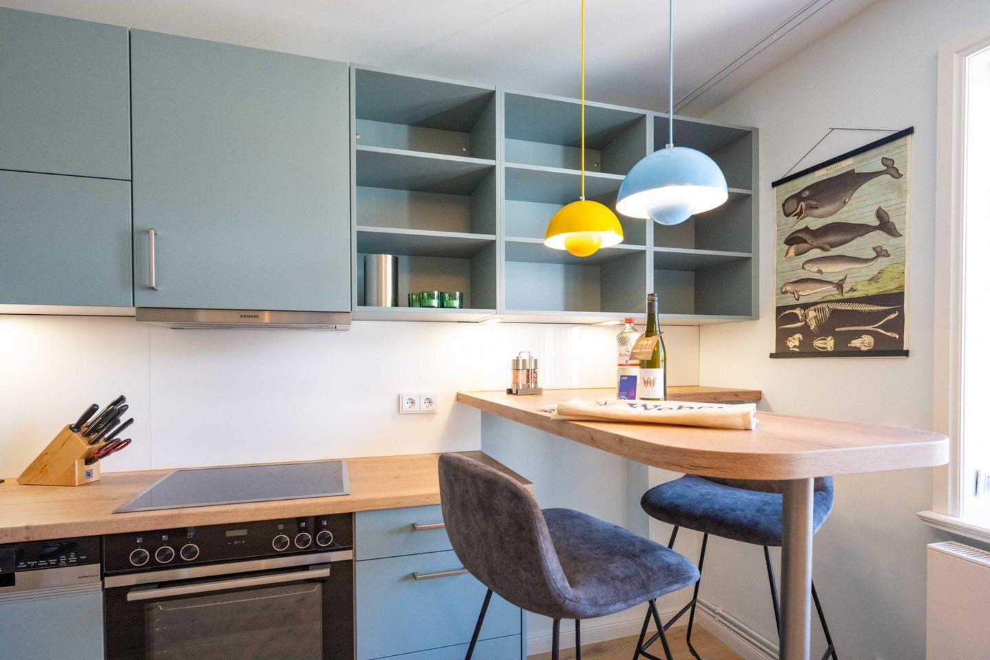 Die Ferienwohnung ist komplett im Obergeschoss gelegen und verfügt über einen Wohn- und Essbereich mit offener Küche, ein Schlafzimmer mit einem Doppelbett und einem Alkoven, sowie ein Bad mit Raindance-Dusche. Ältere Kinder können es sich im „Versteck“ gemütlich machen, einem kleinen Raum mit Schlafsessel, der der Wohnung seinen Namen gibt. Zu den Gemeinschaftsbereichen des Alten Kapitänshauses zählen eine eigene Sauna, sowie ein Fahrradunterstand mit E-Bike-Ladestationen im Innenhof.