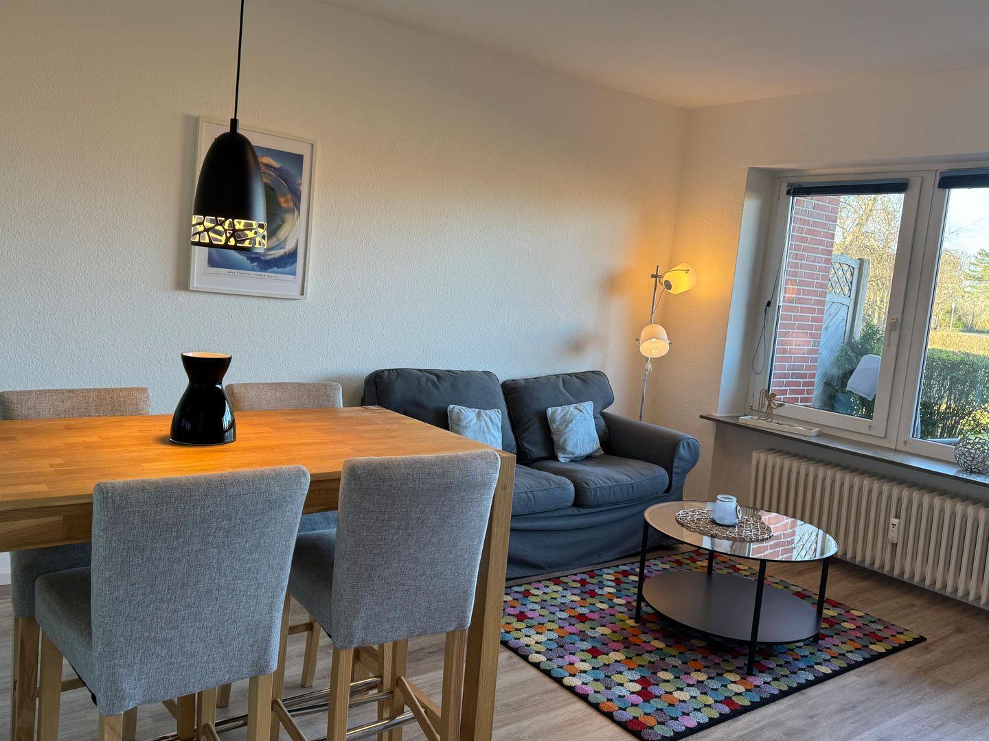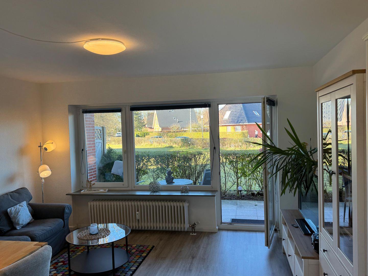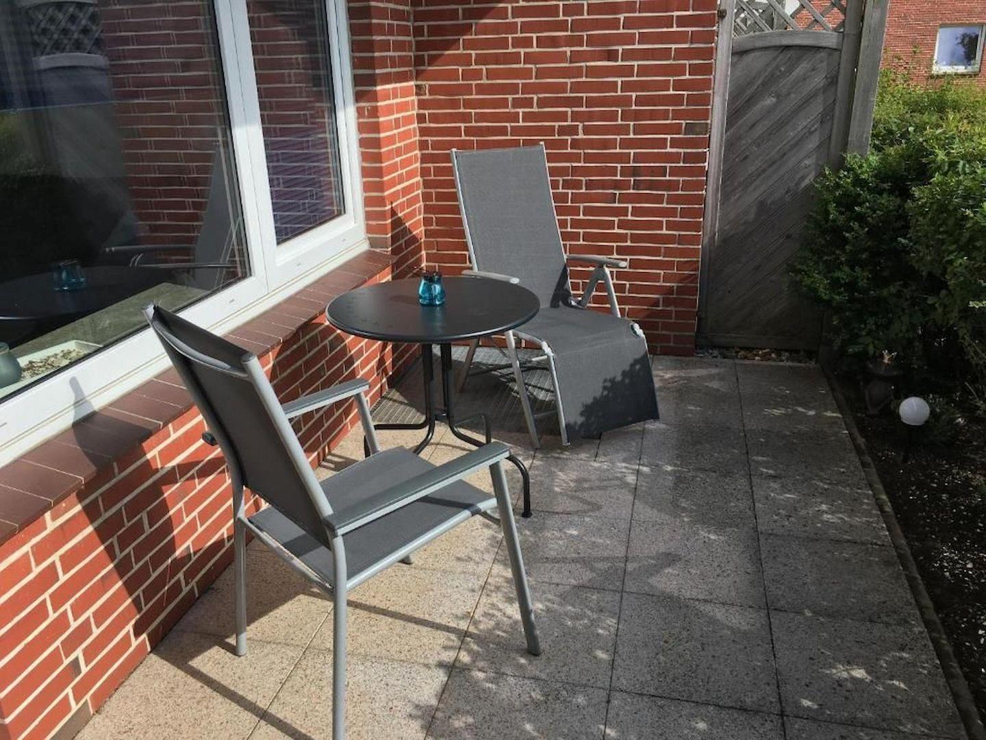 Besonders hervorzuheben ist die überdachte Terrasse mit Windschutz, die mit Gartenmöbeln zum Verweilen im Freien einlädt. Genießen Sie den außergewöhnlich guten Gartenblick und entspannen Sie in privater Atmosphäre nach einem aktiven Tag auf der Insel. Der private Parkplatz direkt am Haus erspart lange Wege mit dem Gepäck und bietet zusätzlichen Komfort. Die Wohnung ist explizit als Nichtraucherunterkunft ausgewiesen.