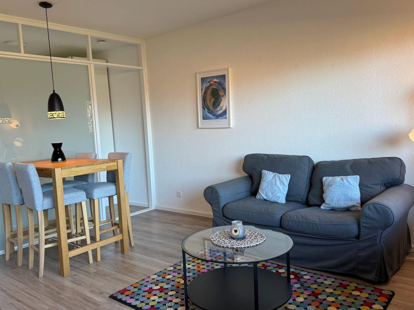 Die Wohnung umfasst ein separates Schlafzimmer mit einem Laminatboden, der für ein angenehmes Raumgefühl sorgt. Insgesamt stehen Ihnen zwei Schlafmöglichkeiten zur Verfügung, sodass auch kleine Familien mit Kleinkind bequem Platz finden – hierfür stehen ein Babybett und ein Kinderhochstuhl bereit. Das Wohnzimmer ist ebenso stilvoll und gemütlich eingerichtet und verfügt über eine komfortable Sofaecke, die zu entspannten Abenden einlädt. Der Essbereich ist harmonisch in das Wohnzimmer integriert und ermöglicht gemeinsame Mahlzeiten in angenehmer Atmosphäre. Für Unterhaltung sorgen ein moderner Fernseher (35–44 Zoll) mit digitalem Satellitenanschluss, ein Blu-ray- und DVD-Spieler sowie ein Radio und CD-Spieler.