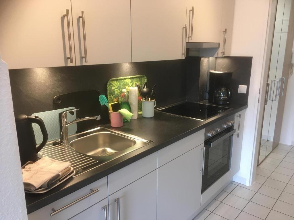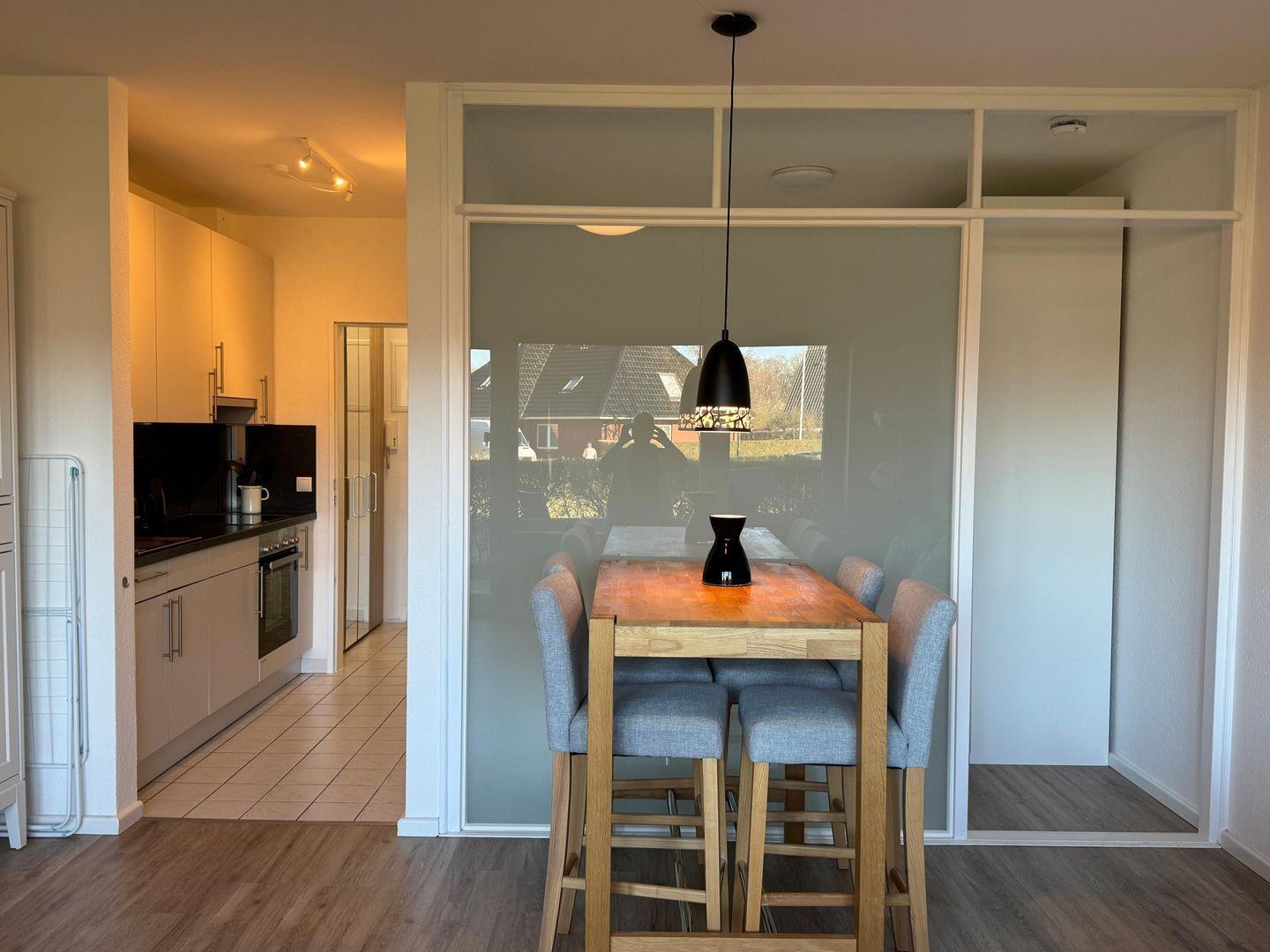 Die separate, geschlossene Küche ist voll ausgestattet: Ceranherd, Backofen mit Elektroanschluss, Spülmaschine, Kühlschrank mit Gefrierfach, Wasserkocher, Toaster, Kaffeemaschine und ausreichendes Geschirr, Besteck sowie diverse Küchenutensilien stehen zur Verfügung. Ein Vorrat an Geschirrhandtüchern und eine Auswahl an Gewürzen sorgen für zusätzlichen Komfort. Die Küche bietet beste Voraussetzungen für die Zubereitung aller Mahlzeiten, vom Frühstück bis zum Abendessen.