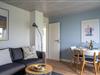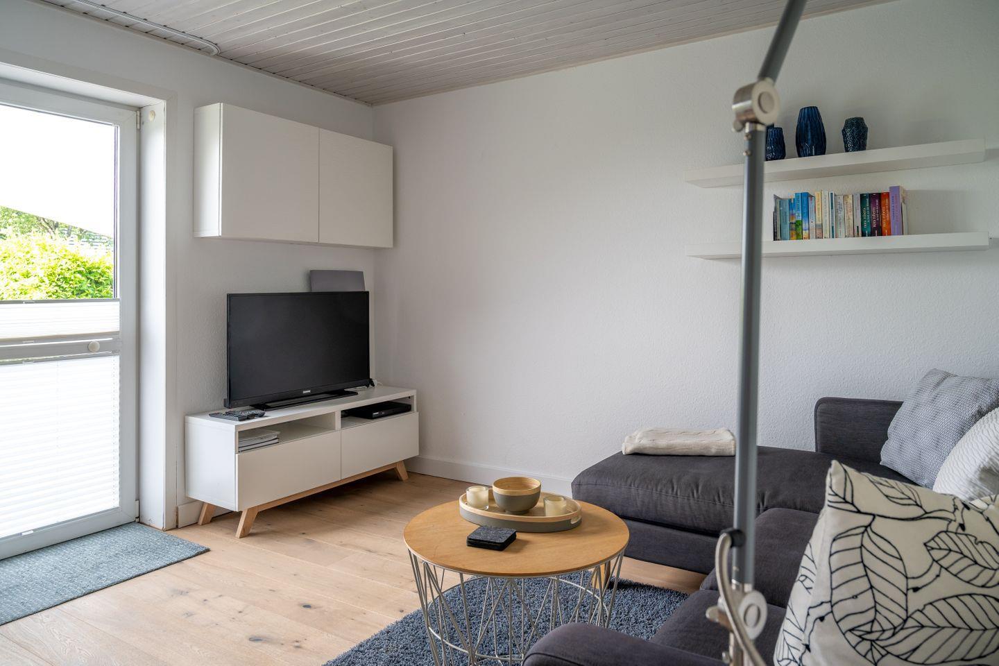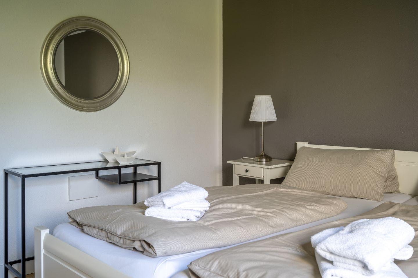 Die Wohnung liegt vollständig im Erdgeschoss und unterteilt sich in einen Wohn- und Essbereich mit separater Küche, zwei Schlafzimmer und ein Duschbad. Über den Wohnbereich gelangen Sie direkt auf die Terrasse und in den eigenen Gartenabschnitt. Die Schlafzimmer sind mit einem Doppelbett bzw. einem Einzelbett ausgestattet.