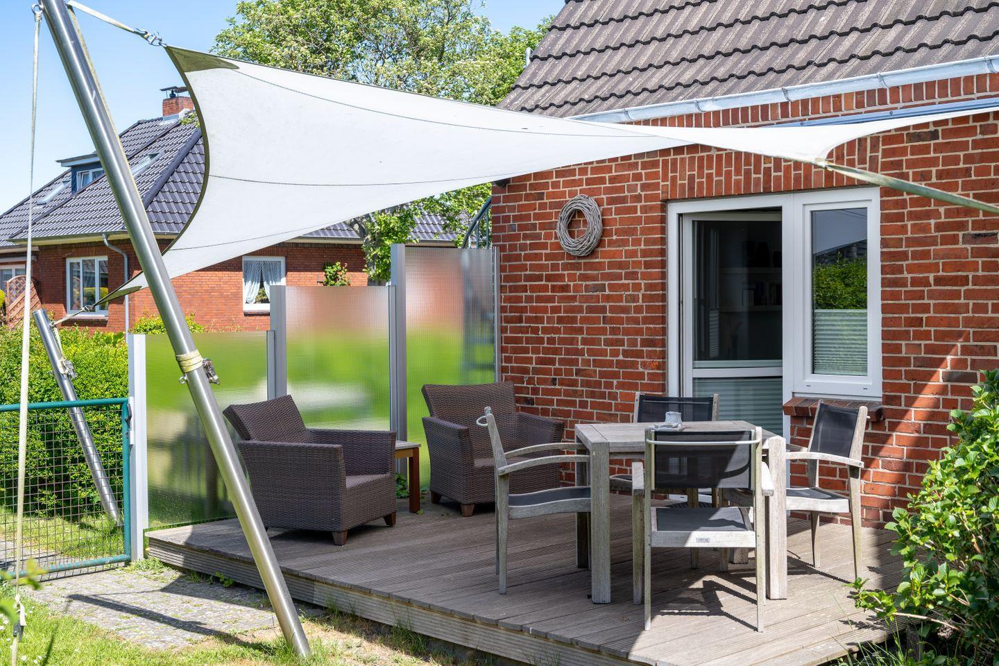 Entspannen Sie auf der Terrasse mit Sonnensegel im eigenen Gartenabschnitt. Eine Unterstellmöglichkeit für Ihre Fahrräder und ein eigener PKW-Stellplatz runden das Angebot ab.