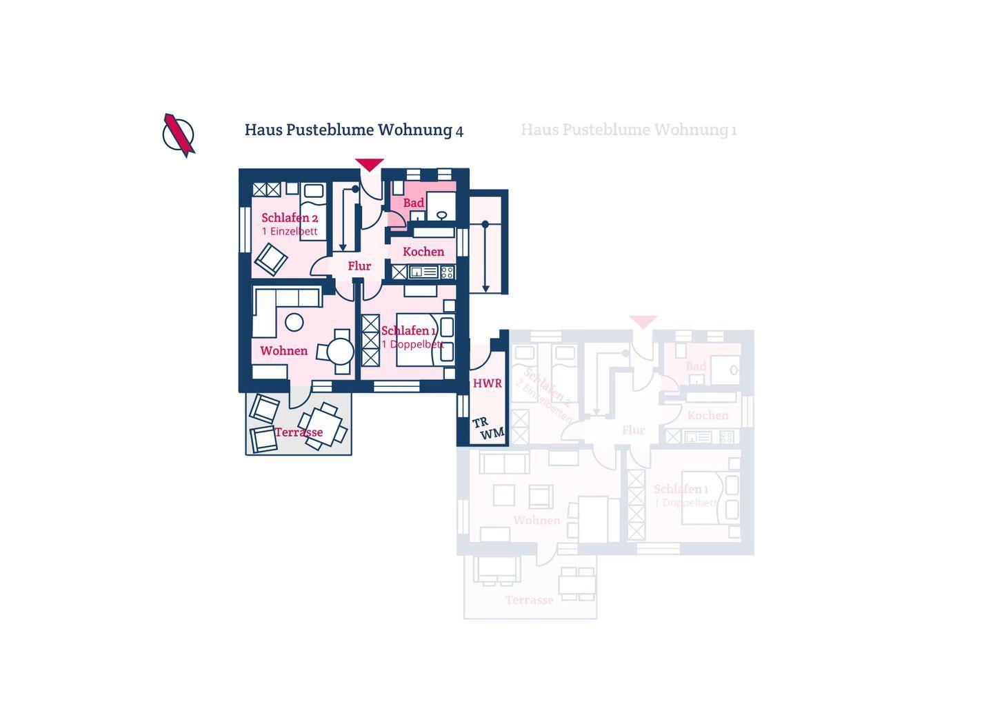 Die Ferienwohnung 4 im Haus Pusteblume verfügt über 2 Schlafzimmer und 1 Bad und bietet somit komfortabel Platz für bis zu 3 Personen zuzüglich einer Kleinkinderaufbettung. Auch bis zu 2 Hunde sind hier herzlich willkommen.