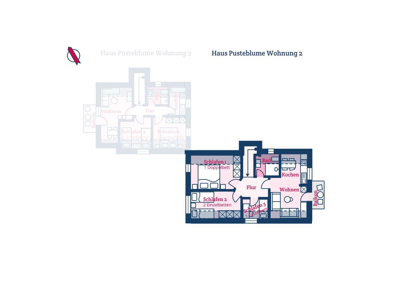 Die Ferienwohnung 2 im Haus Pusteblume verfügt über 3 Schlafzimmer und 1 Bad und bietet somit komfortabel Platz für bis zu 5 Personen zuzüglich einer Kleinkinderaufbettung. Auch bis zu 2 Hunde sind hier herzlich willkommen.