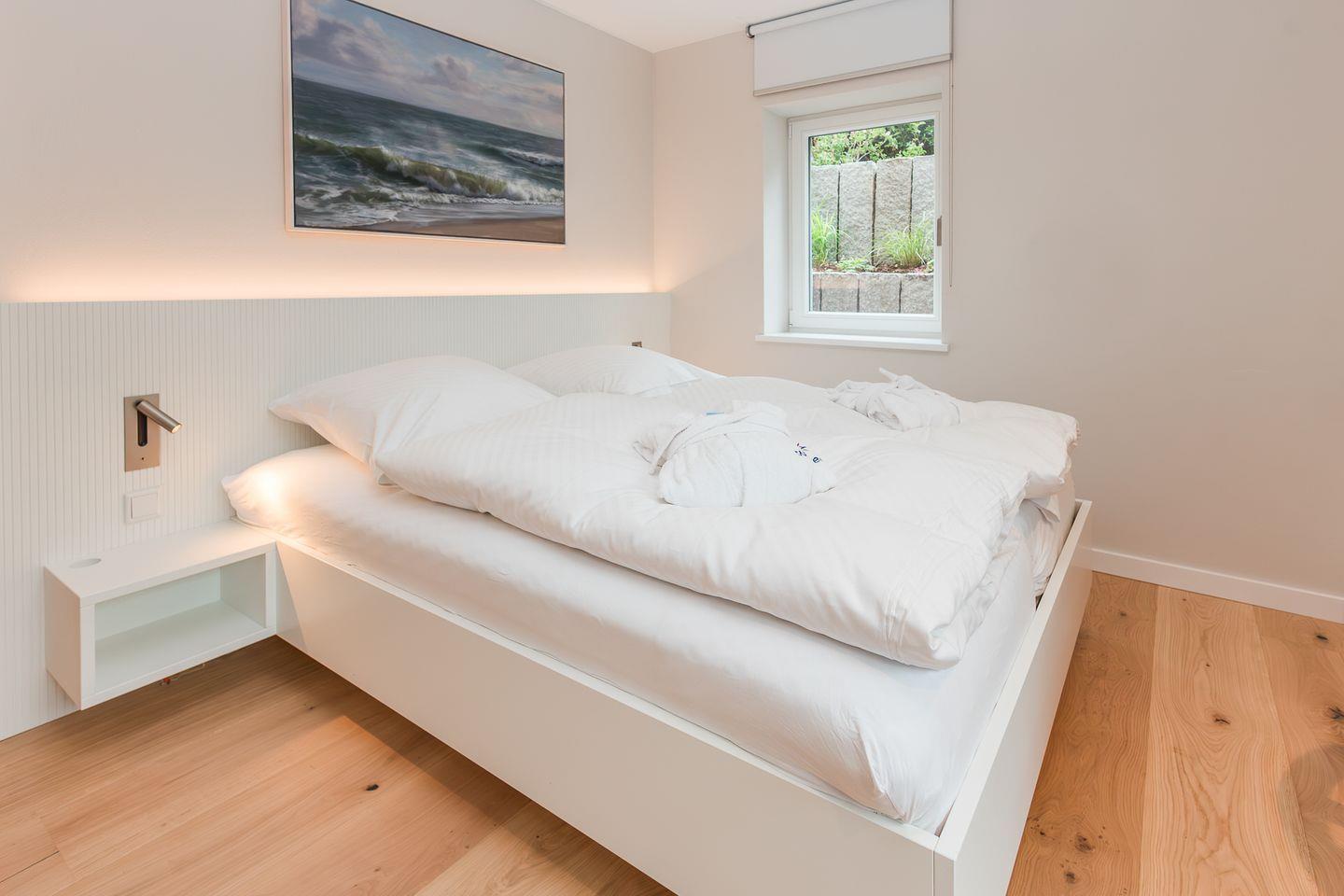Das Souterrain beherbergt drei komfortable Schlafzimmer, jeweils mit Doppelbett, Smart-TV und eigenem Bad. Ein Vollbad mit Badewanne und Dusche sowie zwei weitere moderne Duschbäder stehen zur Verfügung. Große, abgeschrägte Flächen des Außenbereichs lassen viel Tageslicht herein und schaffen ein angenehmes Raumgefühl, auch auf der unteren Ebene.