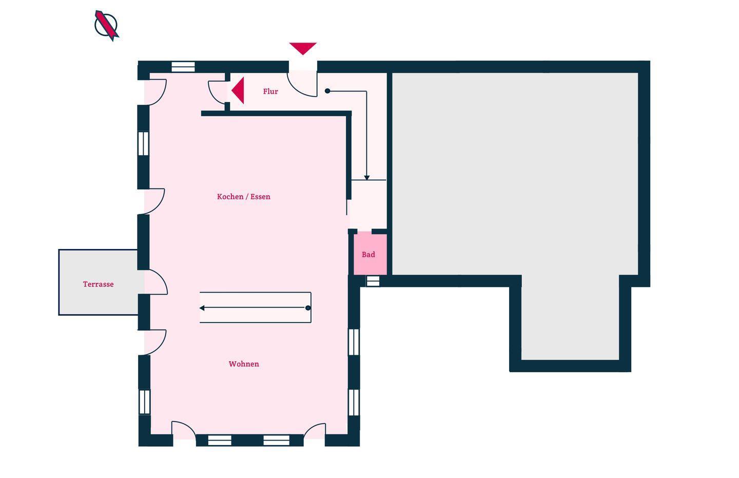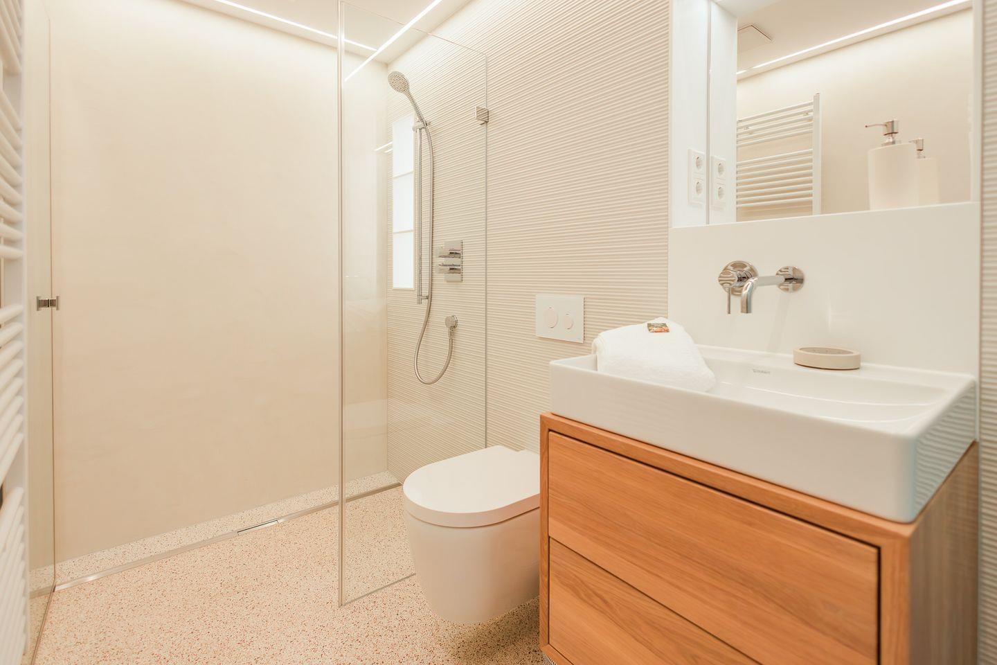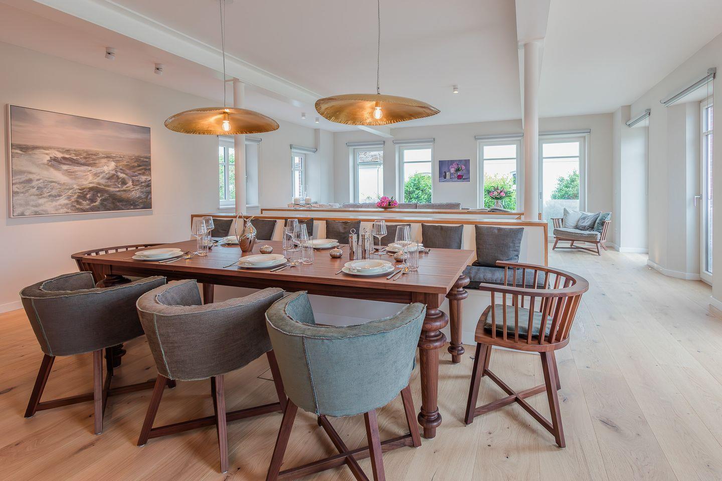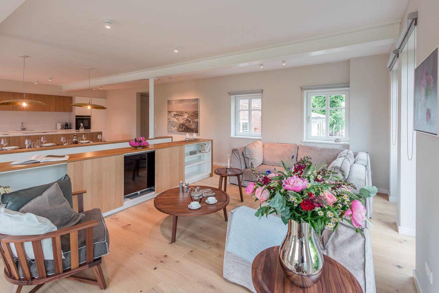 Im Erdgeschoss erwartet Sie ein großzügiger Wohn- und Essbereich mit offener, voll ausgestatteter Küche – das Herzstück der Wohnung. Hier werden Urlaubsmomente geschaffen, die in Erinnerung bleiben. Große Fensterflächen eröffnen den Blick in den eigenen, liebevoll angelegten Garten und sorgen für eine helle, einladende Atmosphäre.