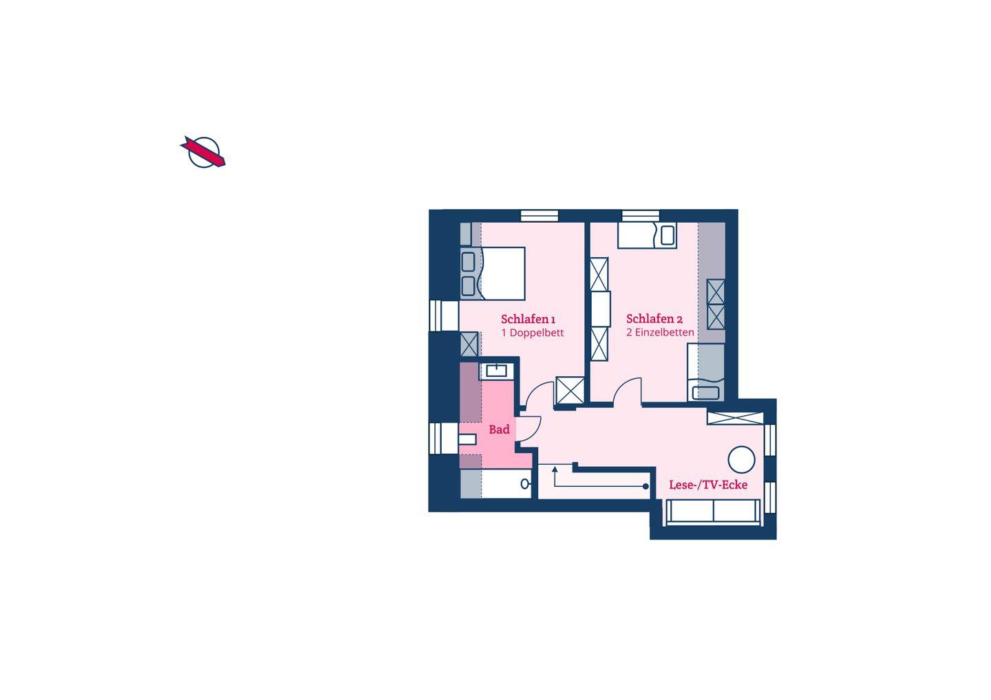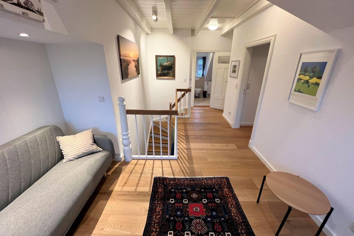 Im Obergeschoss sind die beiden Schlafzimmer - eines mit einem Doppelbett (160x200) und eines mit zwei Einzelbetten (90x200 und 120x200) -, ein zweites Duschbad sowie eine Lese-/TV-Ecke gelegen.