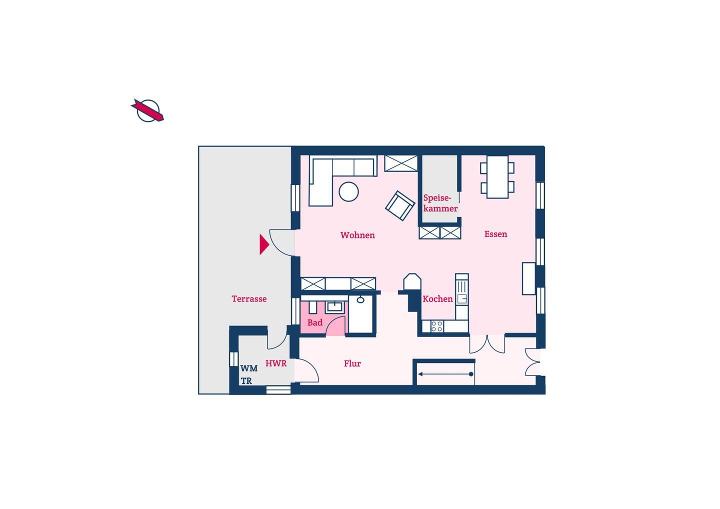 Im Erdgeschoss befinden sich der großzügige Wohn- und Essbereich mit offener Küche, eine separate Speisekammer, ein Duschbad und der Hauswirtschaftsraum sowie ein geräumiger Flur. Über den Wohnbereich gelangen Sie direkt auf die Südterrasse und in den Garten. Der dänische Eisenofen im Wohnbereich sorgt auch an kühleren Tagen für eine angenehme Atmosphäre.