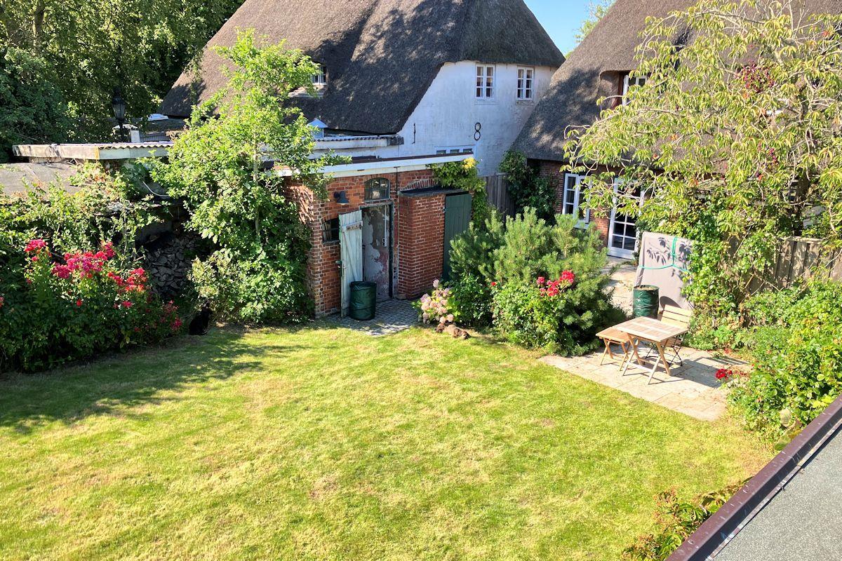 Reetgedeckte Doppelhaushälfte mit dänischem Eisenofen sowie Garten mit Terrasse und Strandkorb.