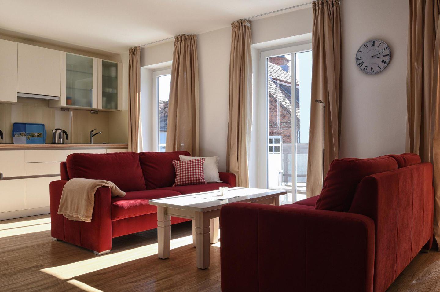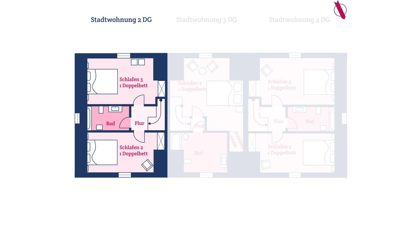 Die Wohnung 2 liegt in der 1. Etage links des Hauses Stadtwohnungen 10A. Sie verfügt über ein großzügiges Wohn / Esszimmer mit einer Küchenzeile mit Einbauküche, 3 separate Schlafräume, 2 Bäder und einen Süd-Balkon. Zudem stehen 8 videoüberwachte PKW- Stellplätze für 9 Stadtwohnungen direkt am Haus zur Verfügung. Die Stadtwohnungen liegen zentral aber dennoch nur 200 m vom Strand entfernt.
