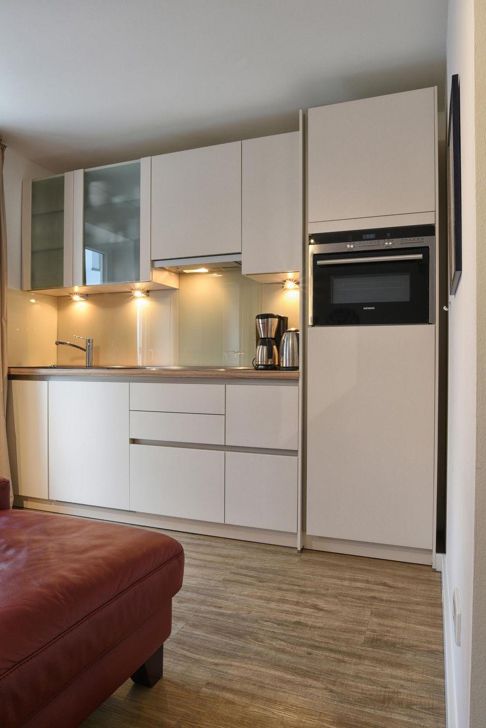 In jeder Stadtwohnung befindet sich eine Kaffeefiltermaschine. In den gemeinsamen Bereichen des Hauses stehen zwei Waschmaschinen und Trockner, die kostenfrei genutzt werden können. Hier finden Sie auch diverse Prospekte, Brettspiele und Bücher, die Sie sich für Ihren Aufenthalt gerne mit in Ihre Stadtwohnung nehmen dürfen. Außerdem finden Sie hier auch Kaffeepad- und Kapselmaschinen in leicht reduzierter Stückzahl vor. Bei Bedarf können Sie sich diese ebenfalls mit in Ihre Stadtwohnung nehmen. Alle Schränke wurden von einem hiesigen Tischler gefertigt und passgenau in den Stadtwohnungen eingebaut.